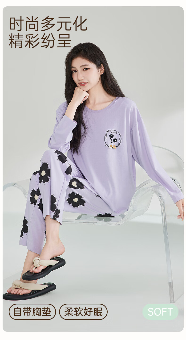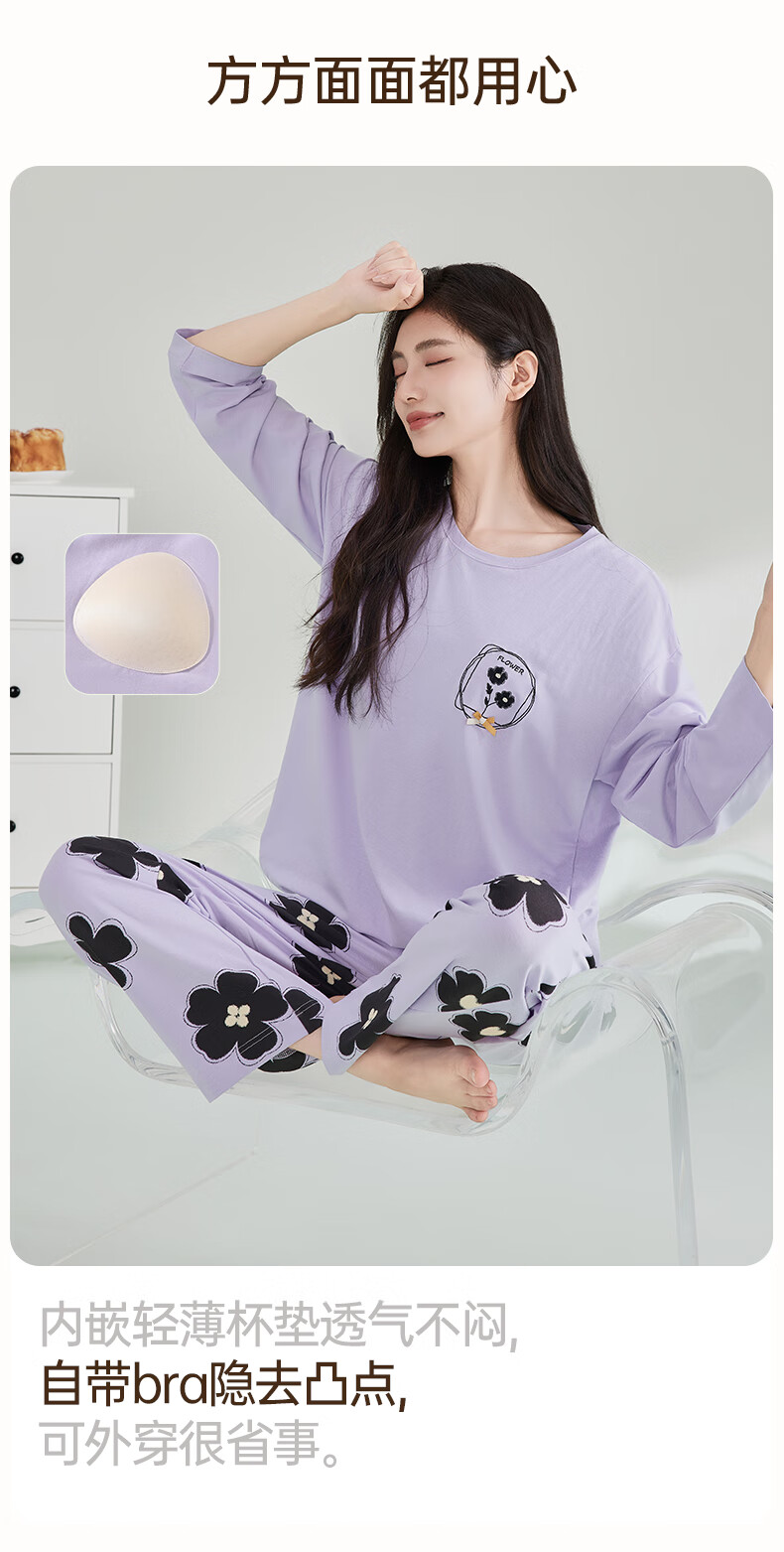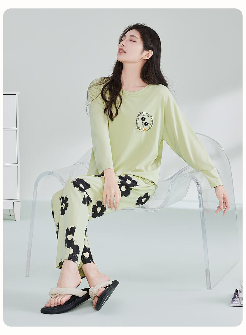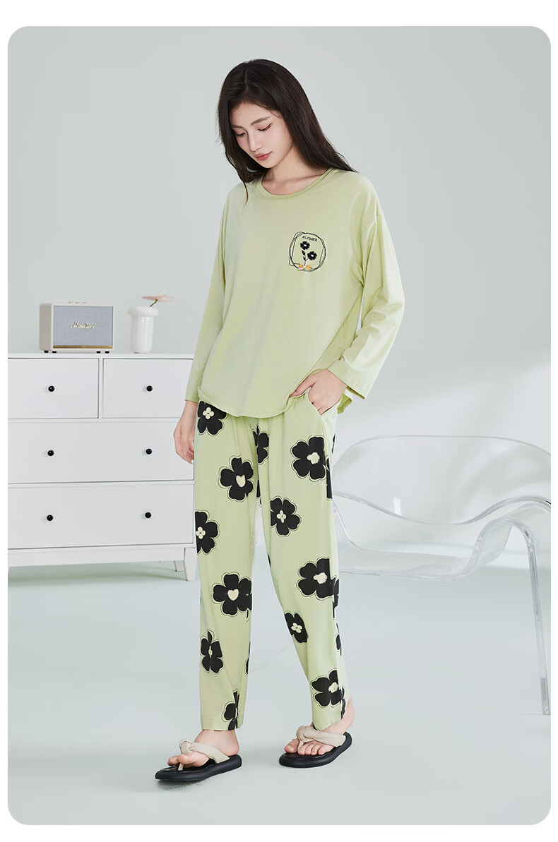 玛伦萨带胸垫睡衣女春秋季可外穿2025新款柔软棉质长袖长裤女士家居服 豆绿 M