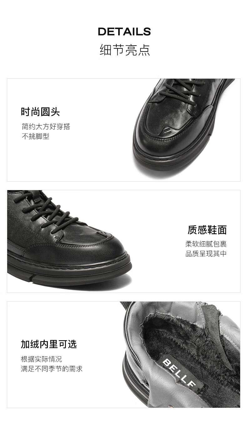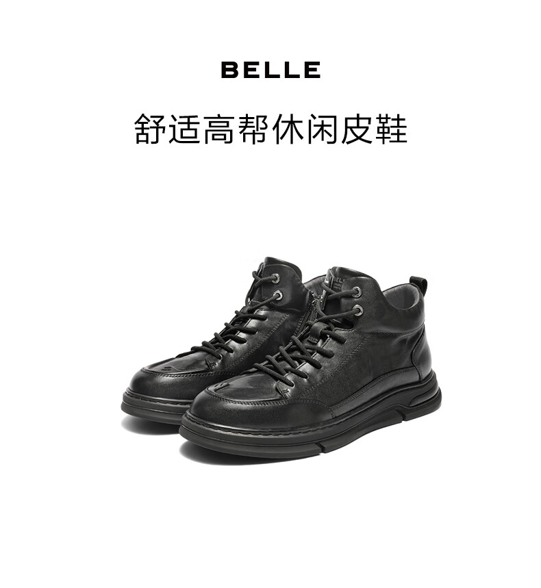 百丽(Belle)高帮休闲皮鞋男2025冬季新款商场同款牛皮革舒适板鞋加绒8WG01DD5 黑单里 38 (240mm)