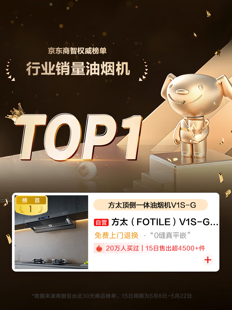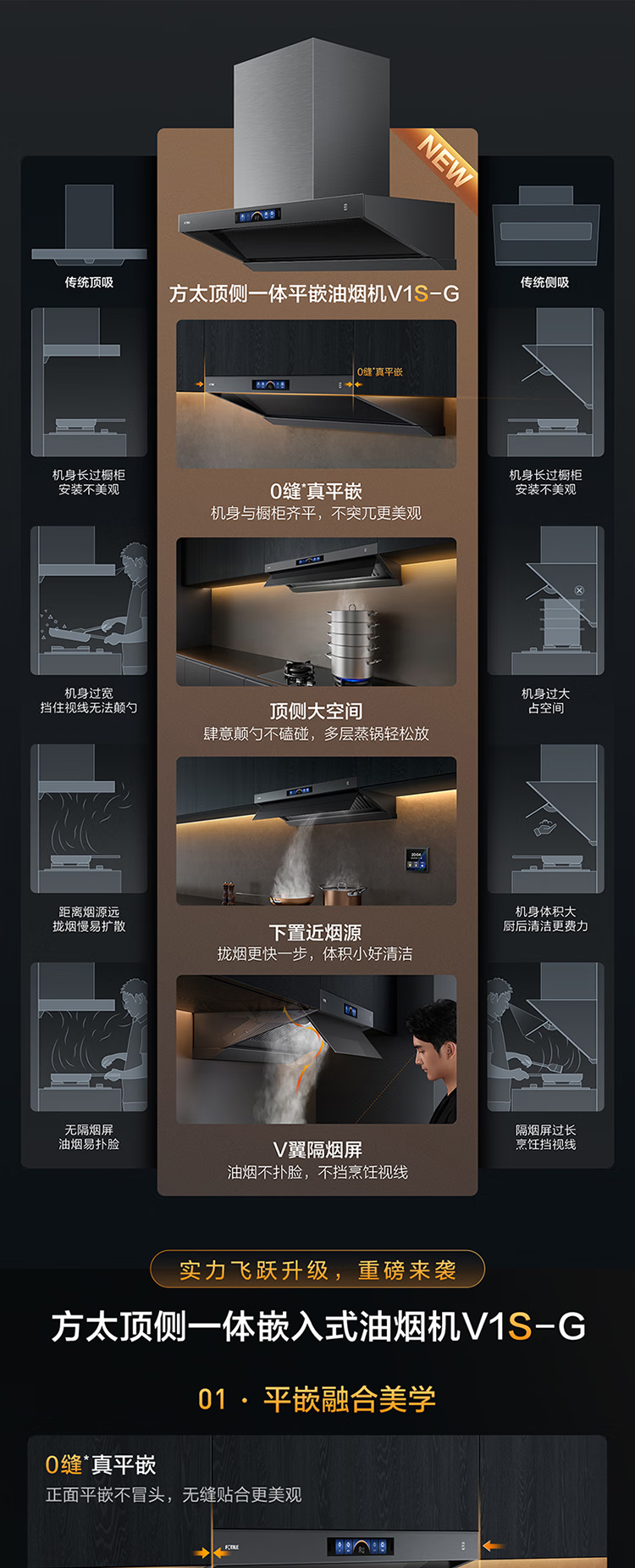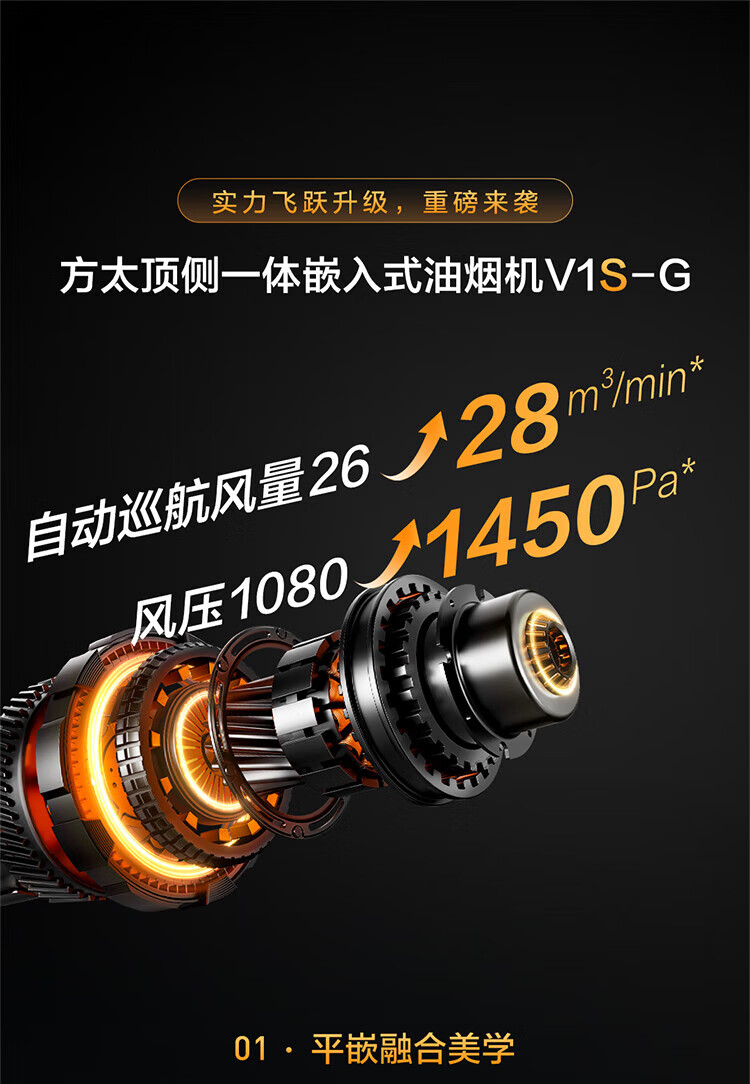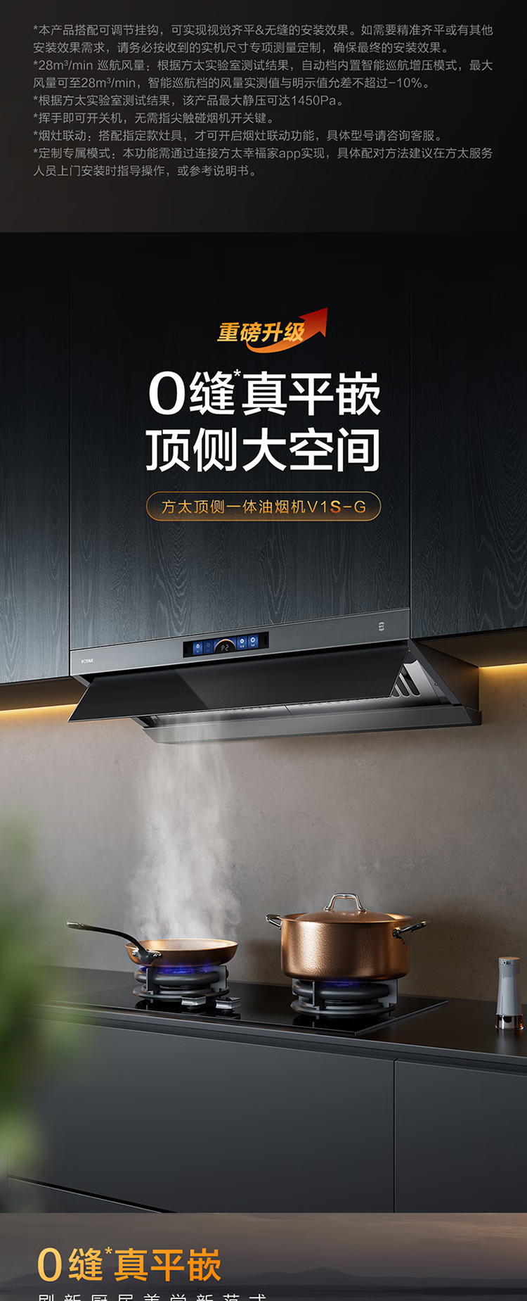 方太(FOTILE)V1S-G顶吸侧吸抽油烟机家用大吸力28大风量1450Pa大风压顶侧一体烟灶联动变频 单烟机 国家补贴20%