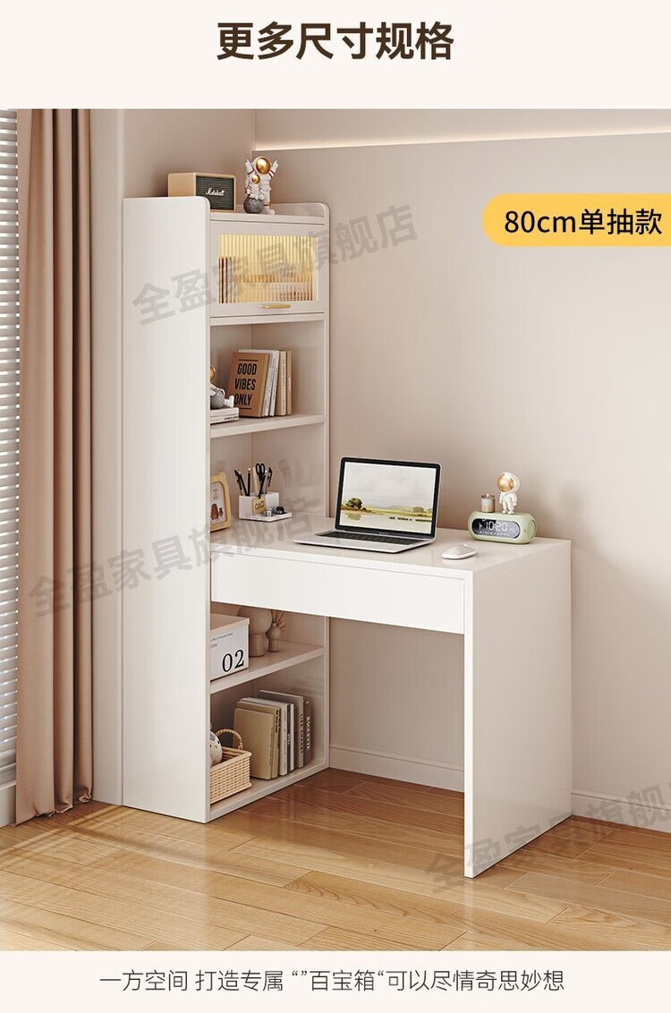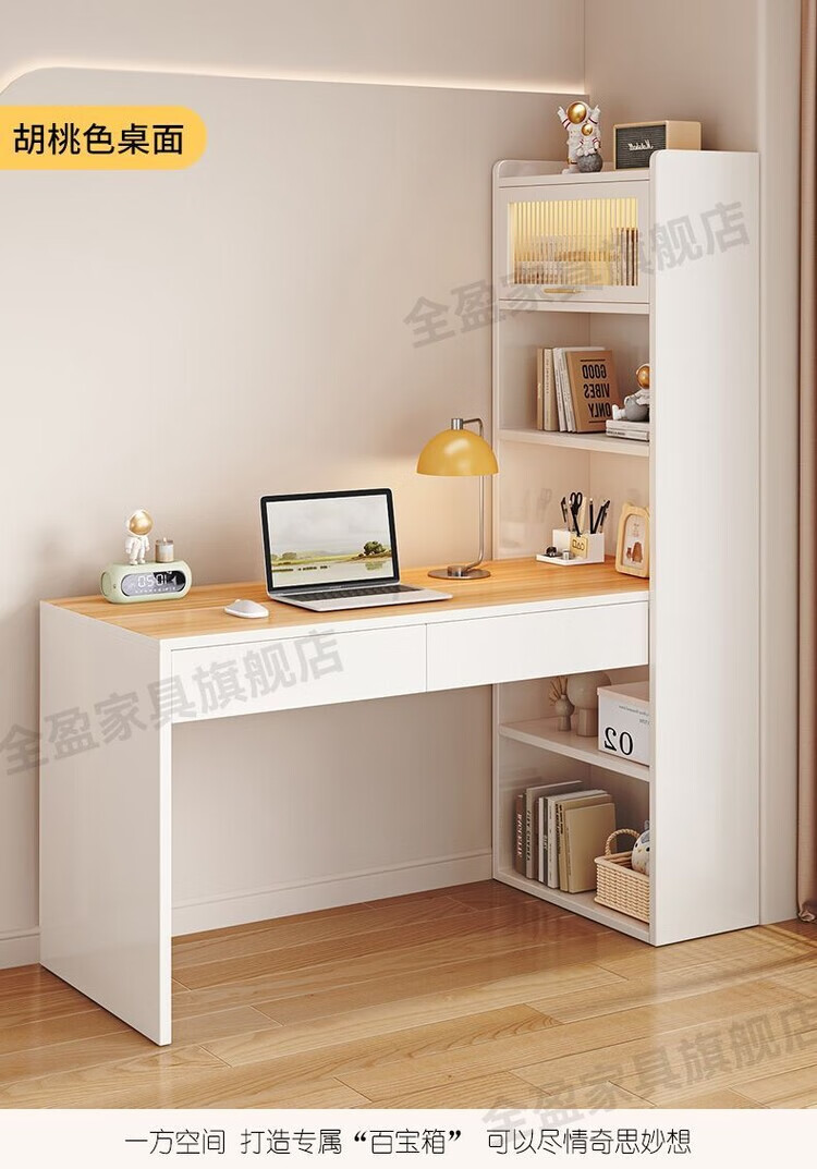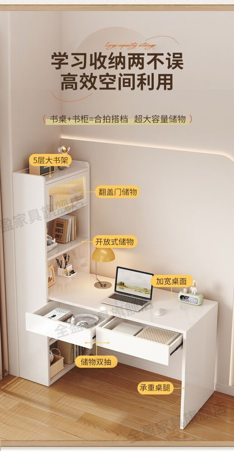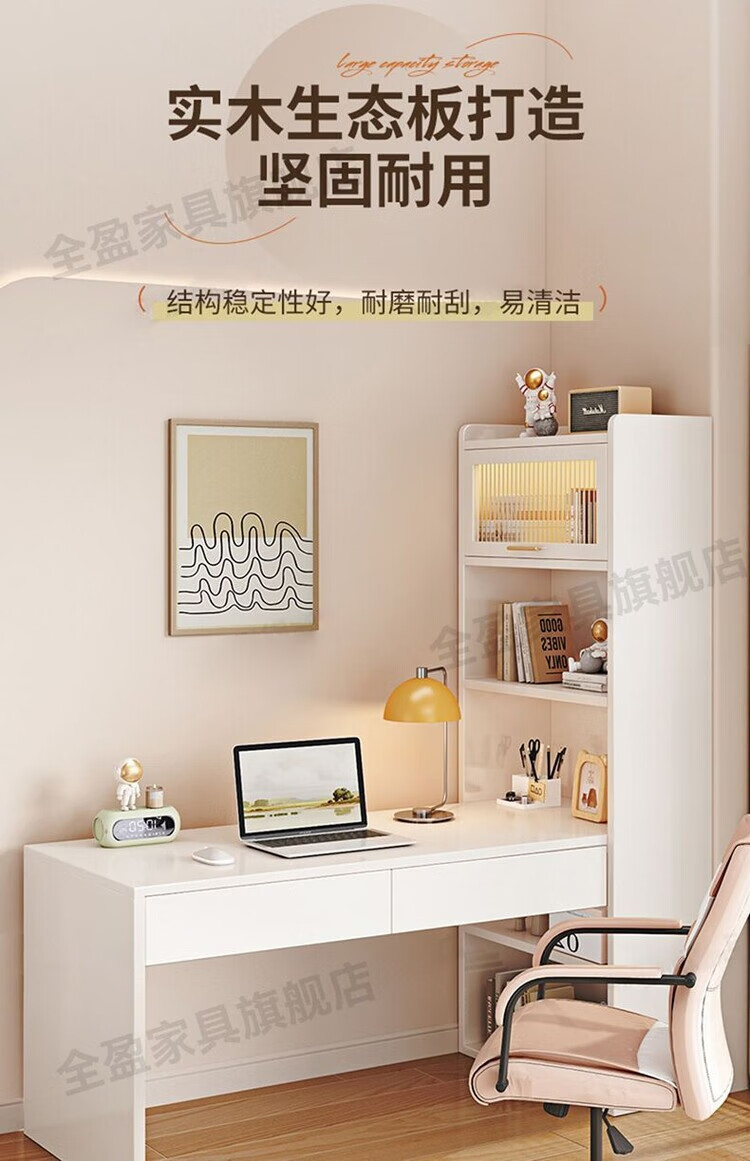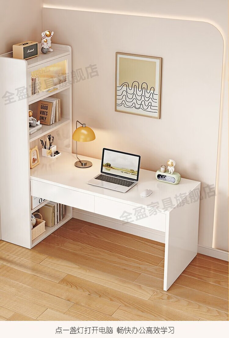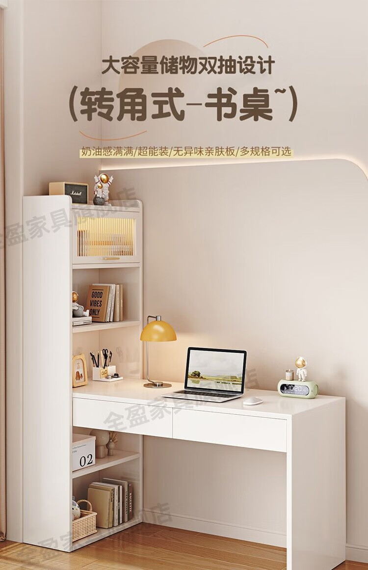倘然之家实木书架书柜落地靠墙一体学习桌转角书桌家用奶油风小户型写字桌 实木生态板【自行安装】转角书桌 100cm暖白色【单抽书桌+书柜】
