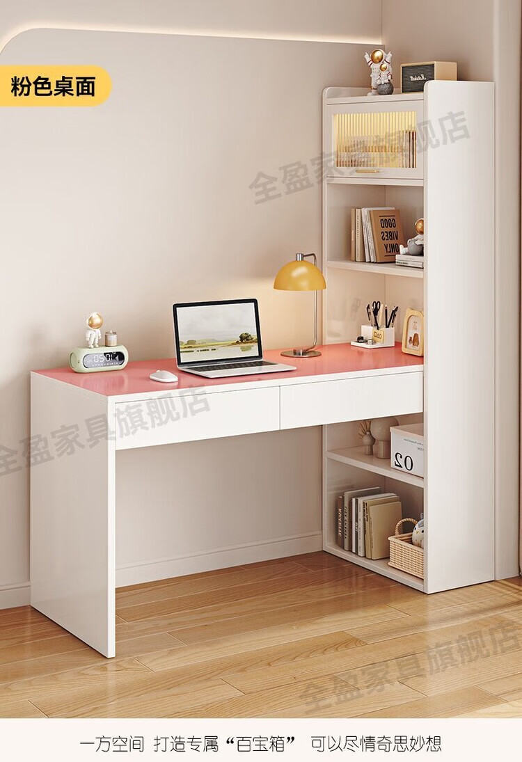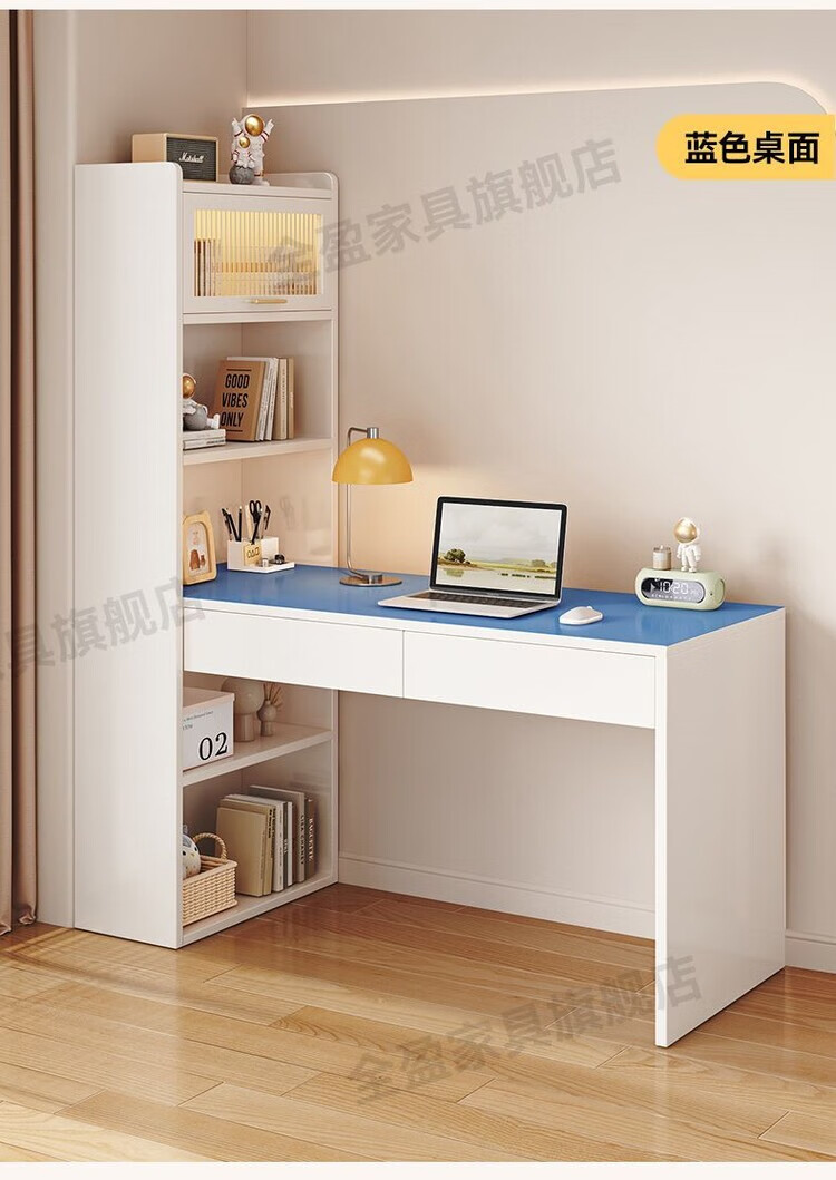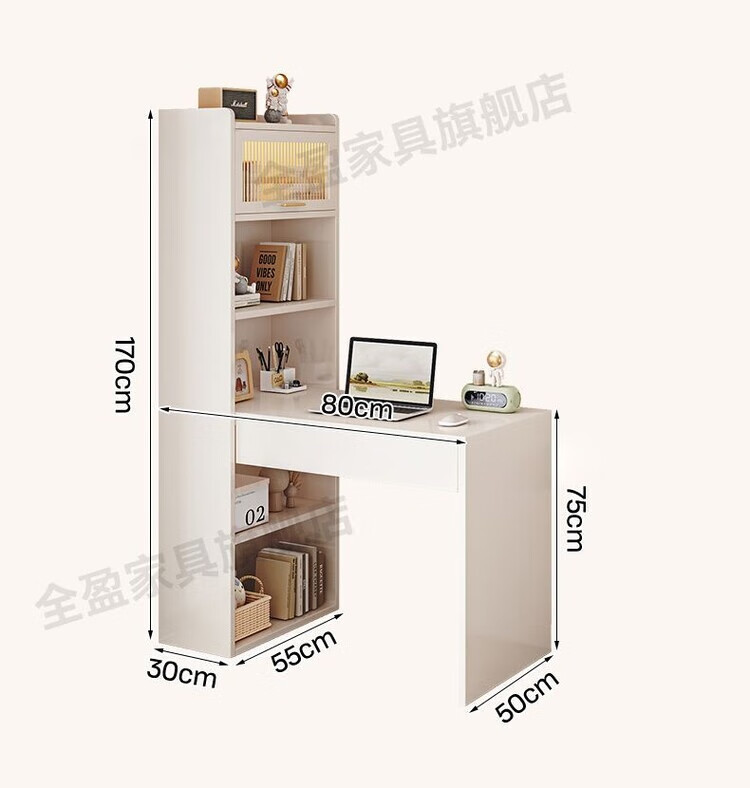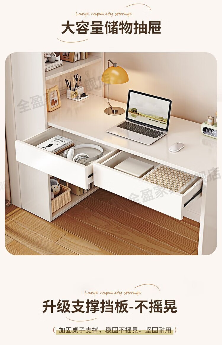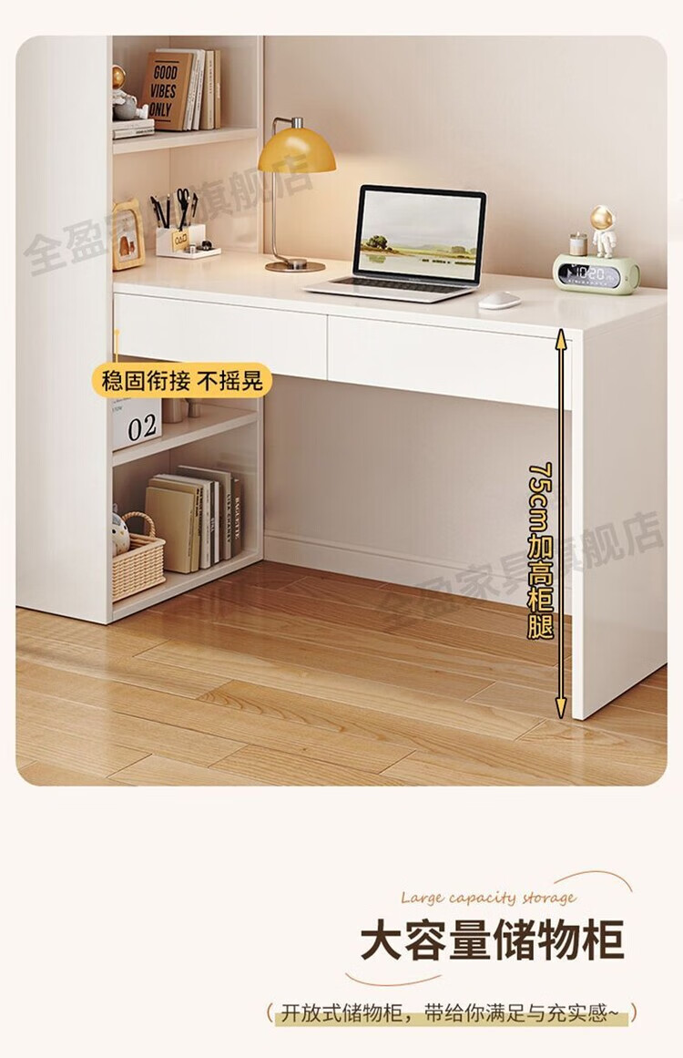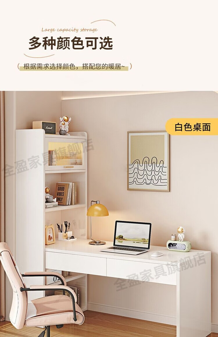 倘然之家实木书架书柜落地靠墙一体学习桌转角书桌家用奶油风小户型写字桌 实木生态板【自行安装】转角书桌 100cm暖白色【单抽书桌+书柜】