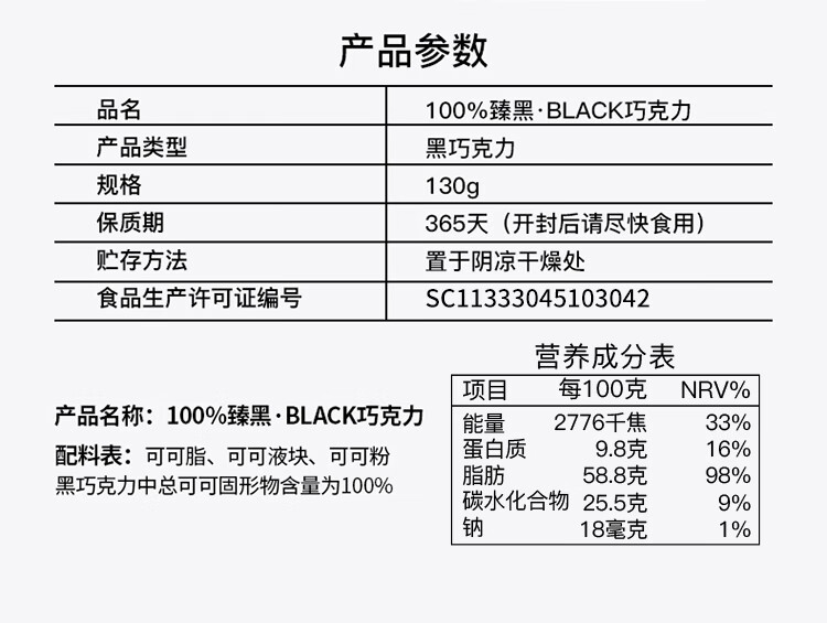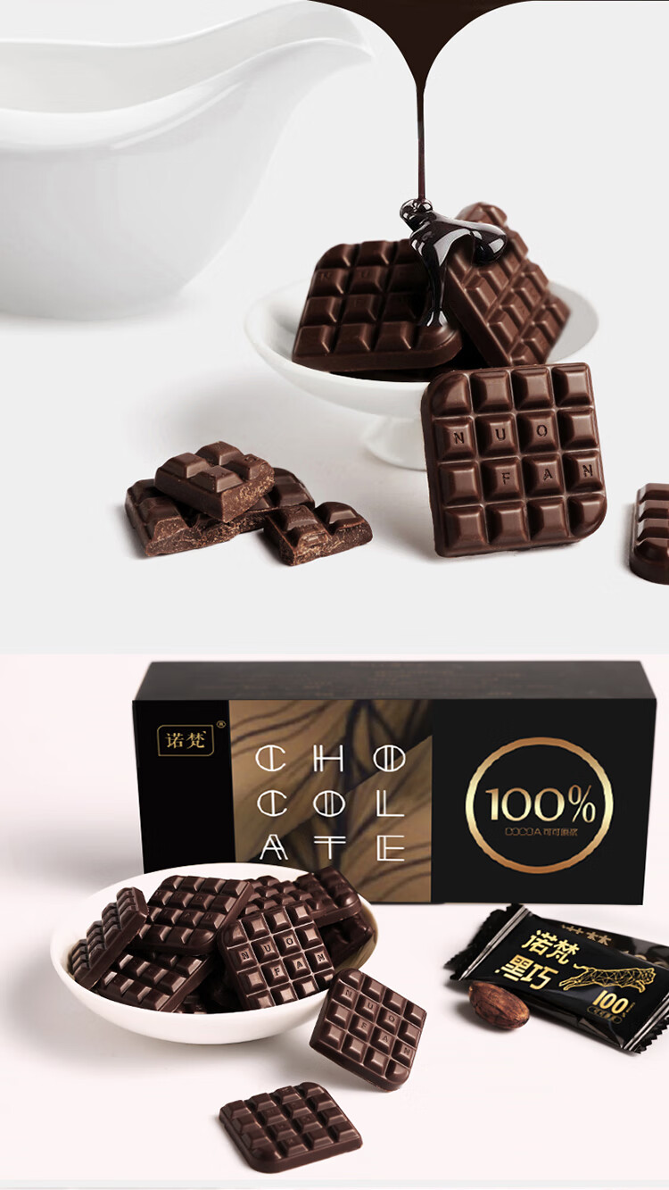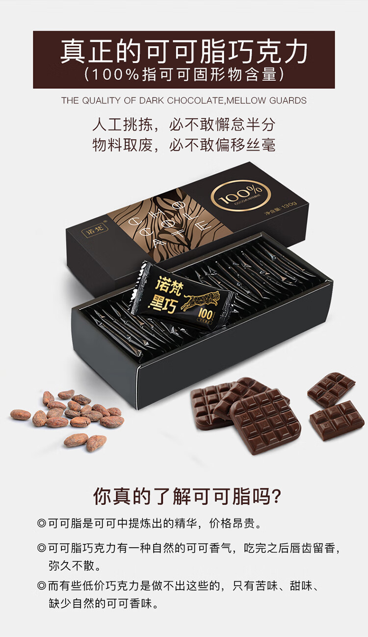 诺梵纯黑可可脂巧克力100% 130g 捣蛋糖果0添加蔗糖健身特苦高纯黑巧