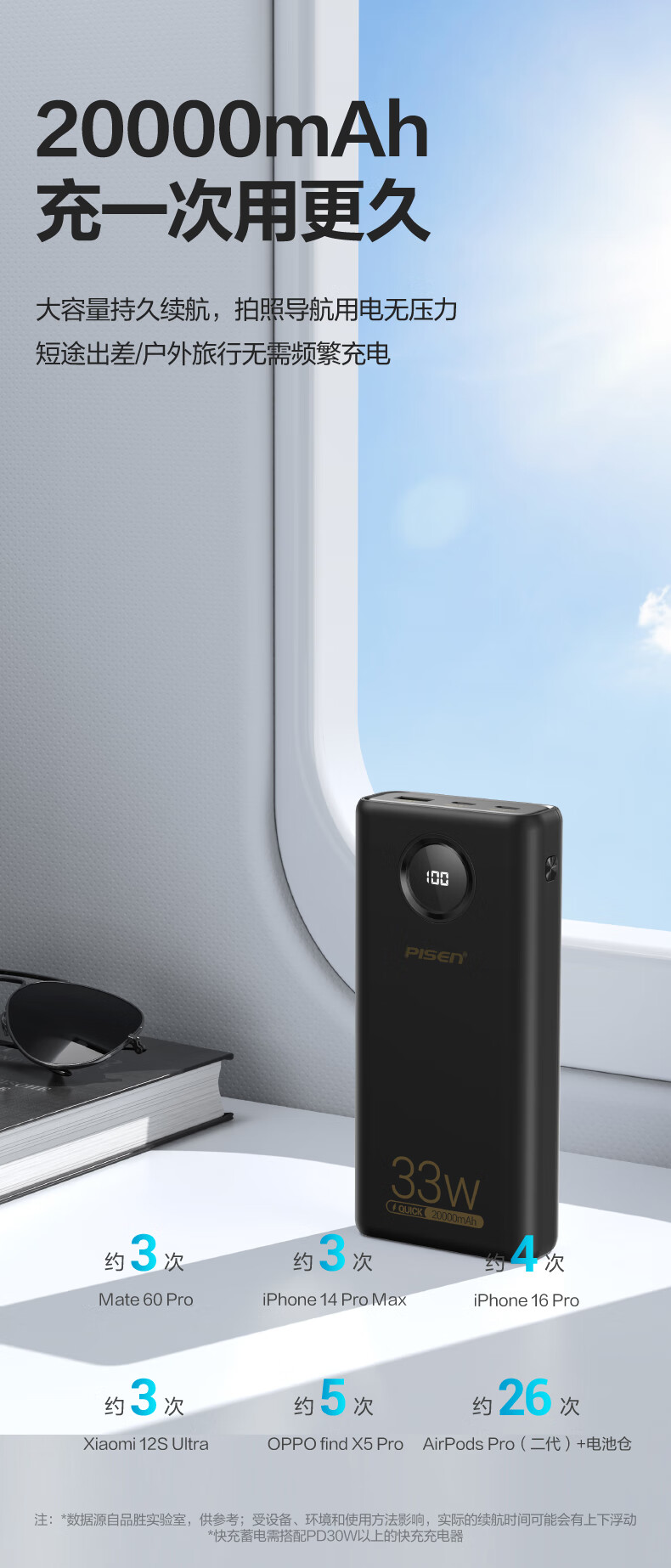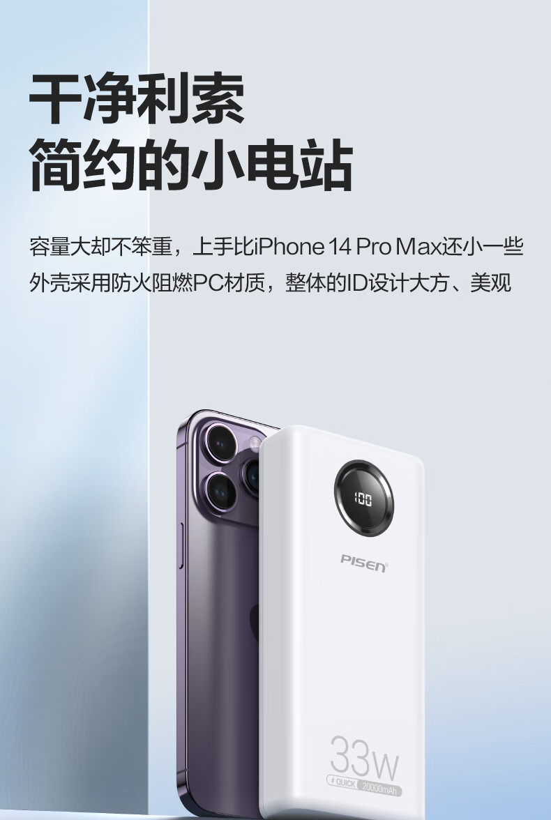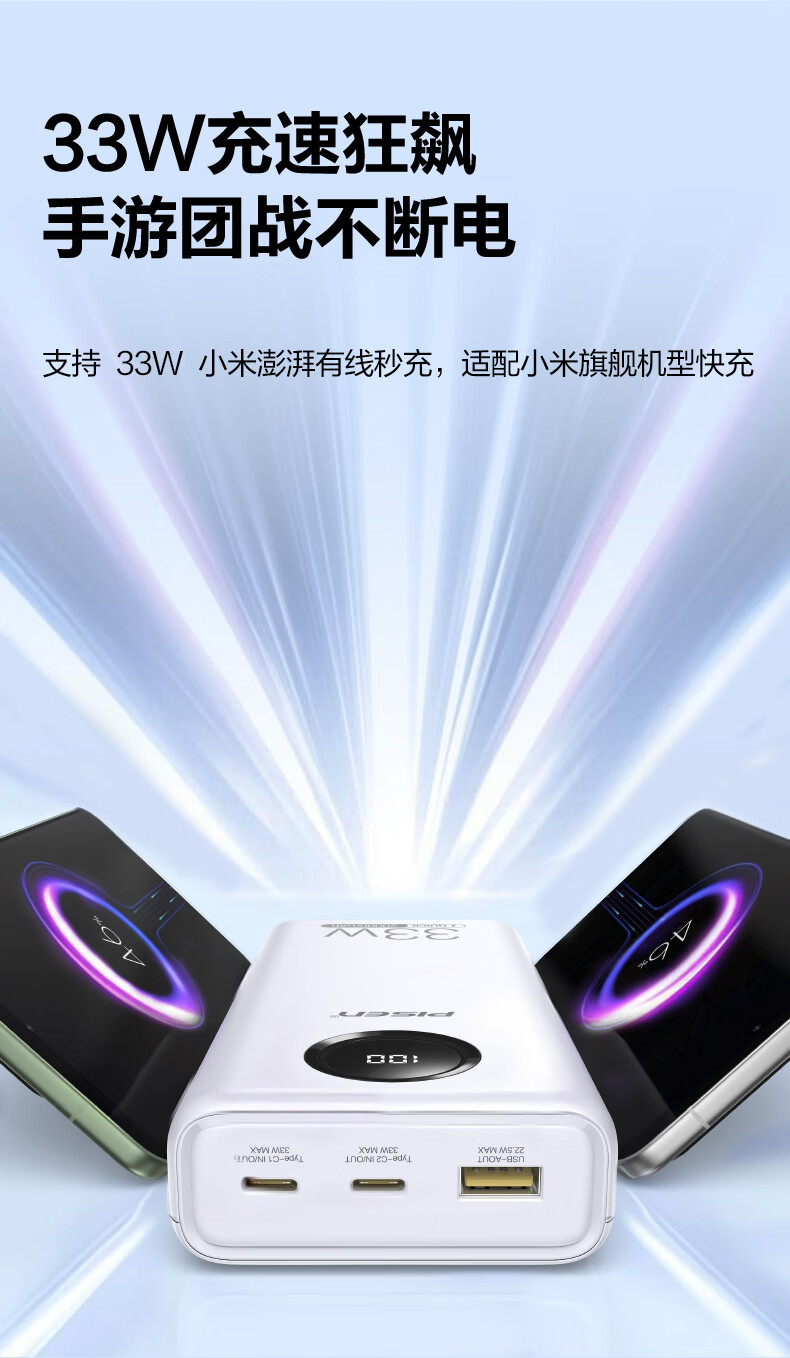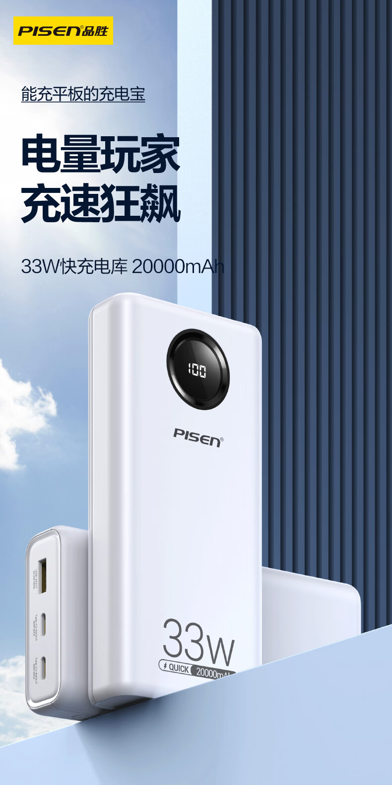 品胜【3C认证】充电宝33W小米澎湃有线秒充20000毫安大容量快充移动电源可上飞机适用苹果17promax华为