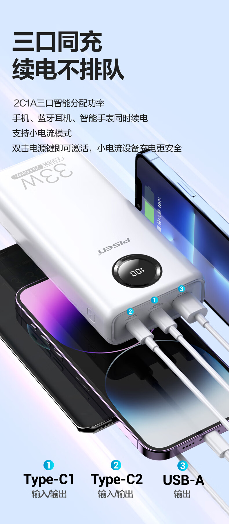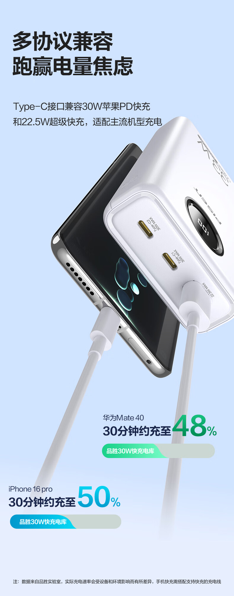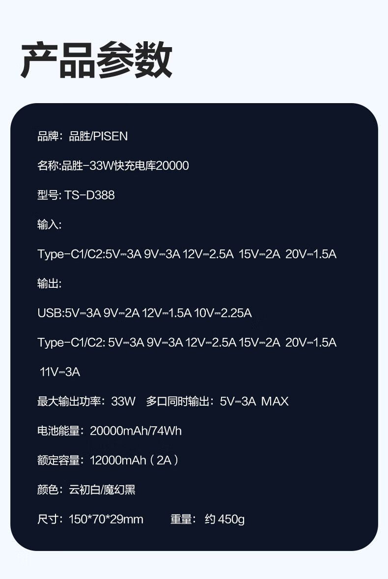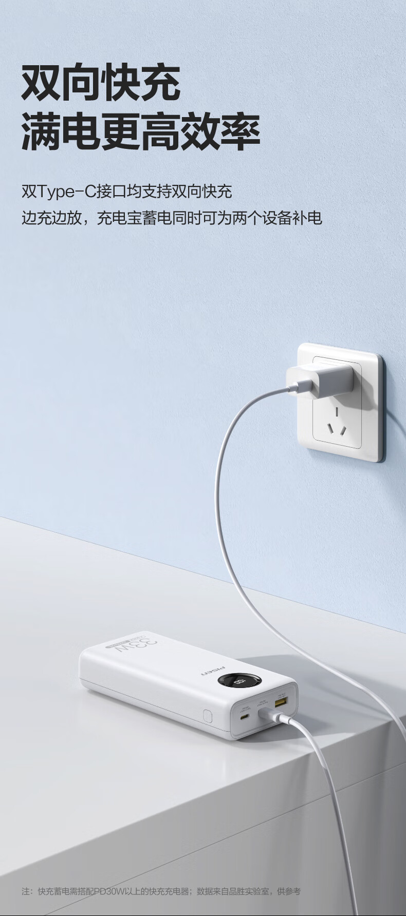 品胜【3C认证】充电宝33W小米澎湃有线秒充20000毫安大容量快充移动电源可上飞机适用苹果17promax华为
