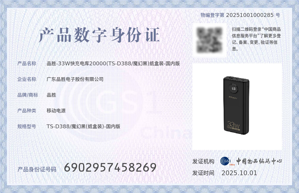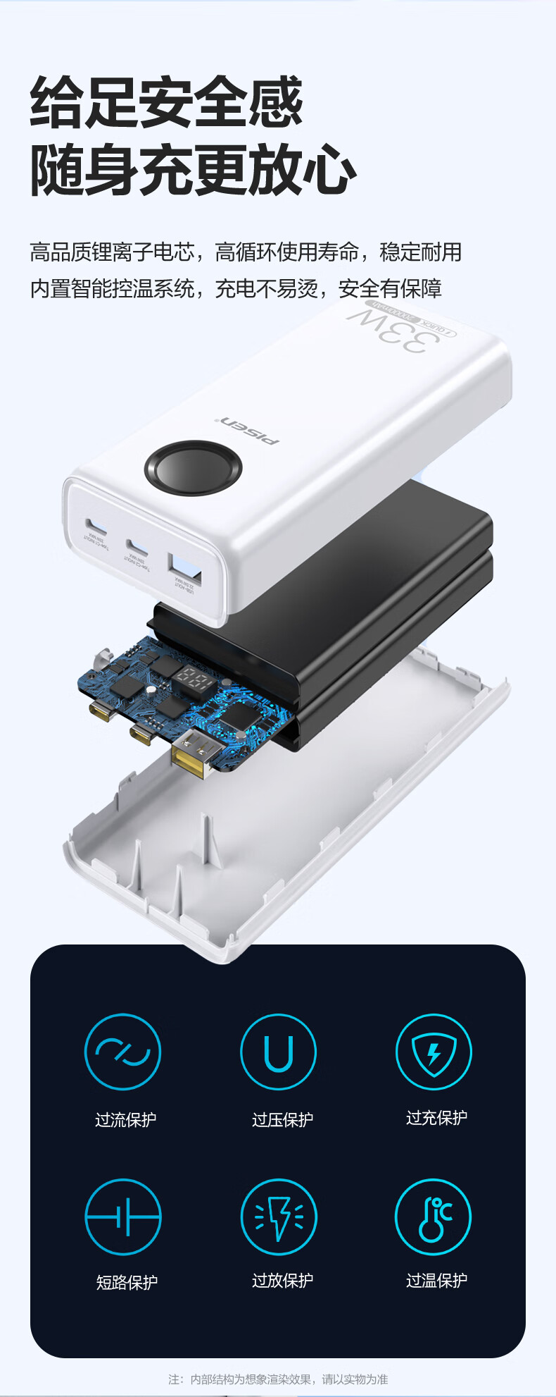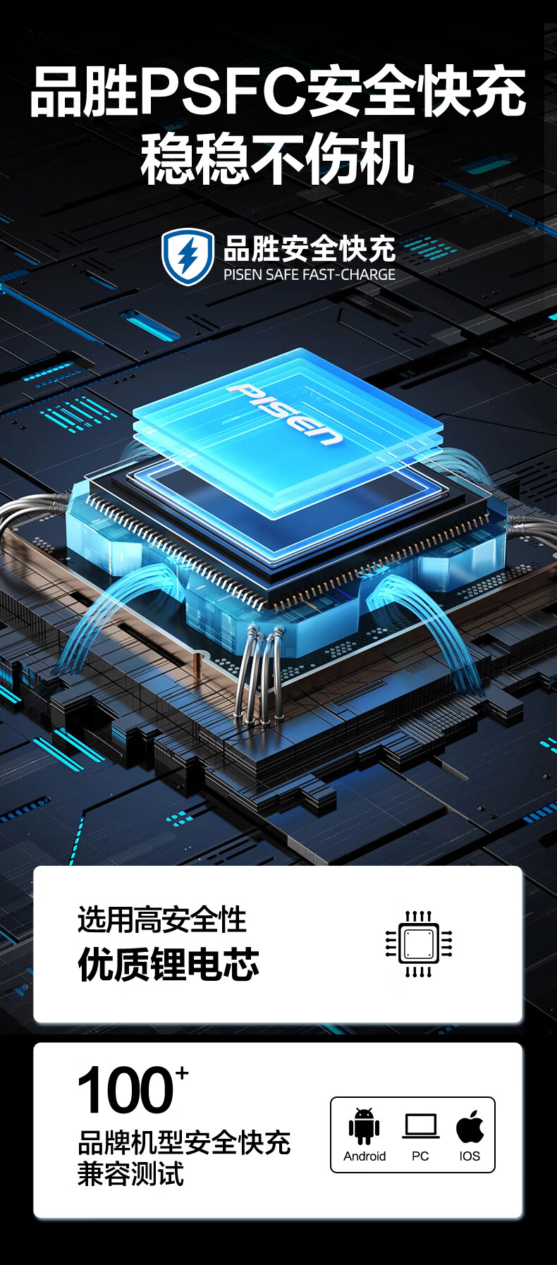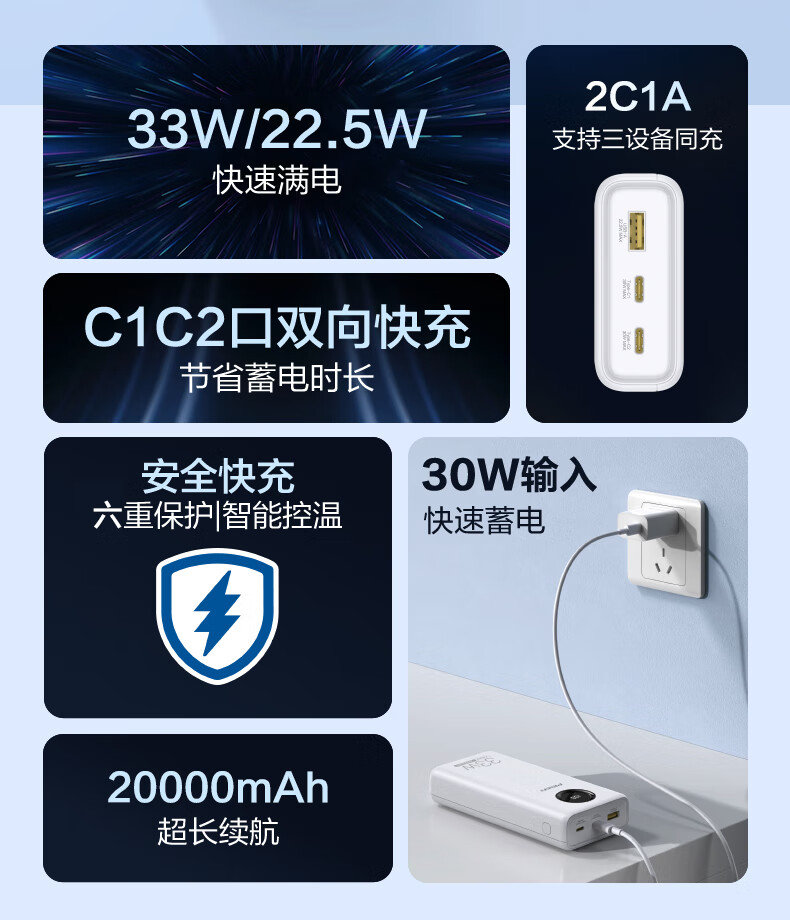 品胜【3C认证】充电宝33W小米澎湃有线秒充20000毫安大容量快充移动电源可上飞机适用苹果17promax华为