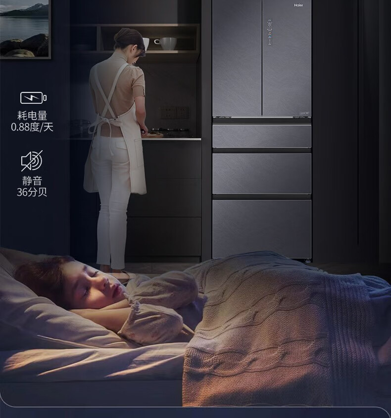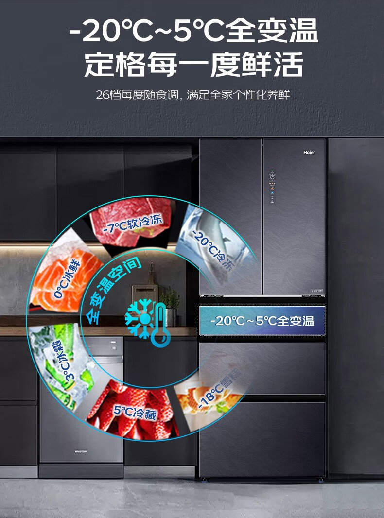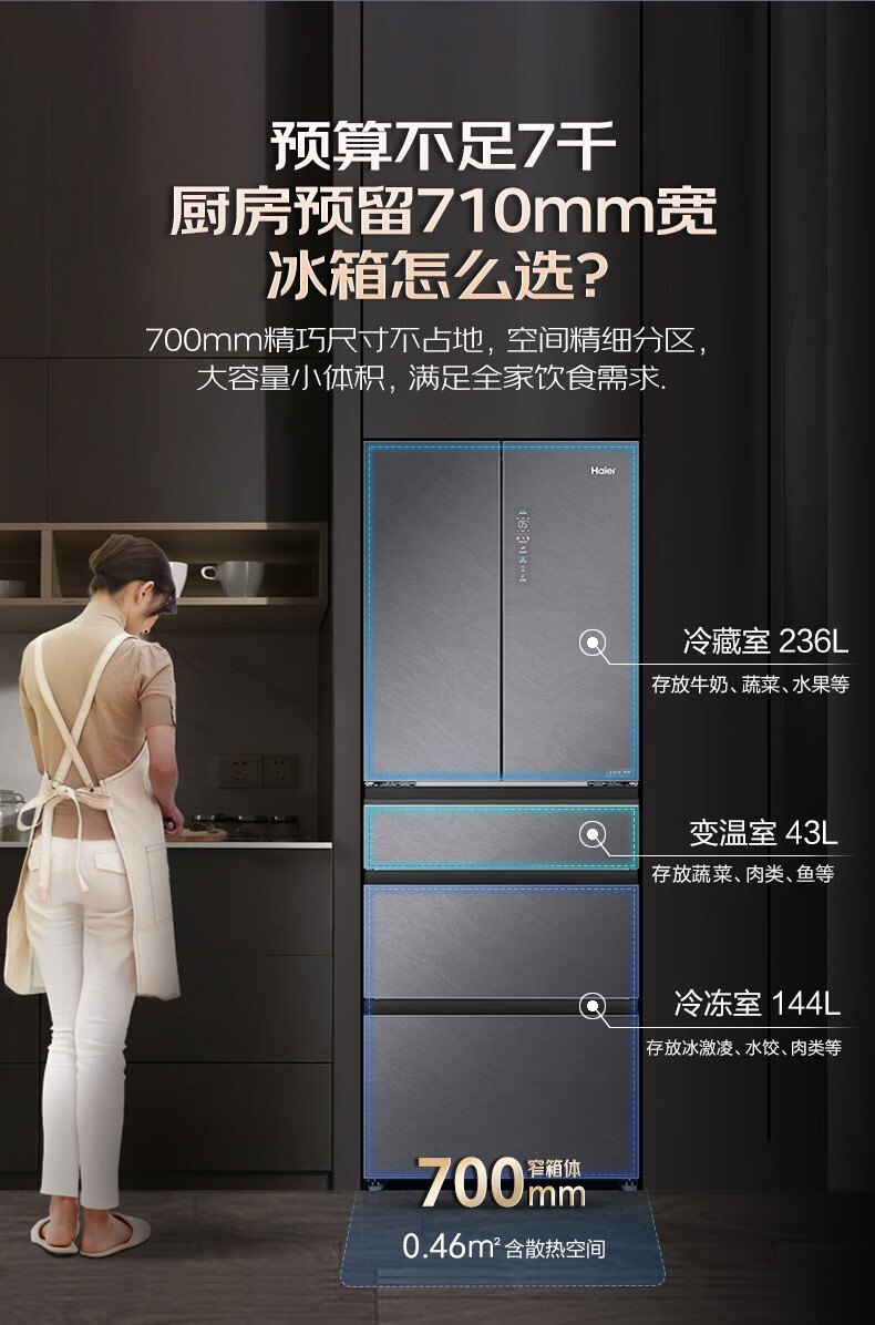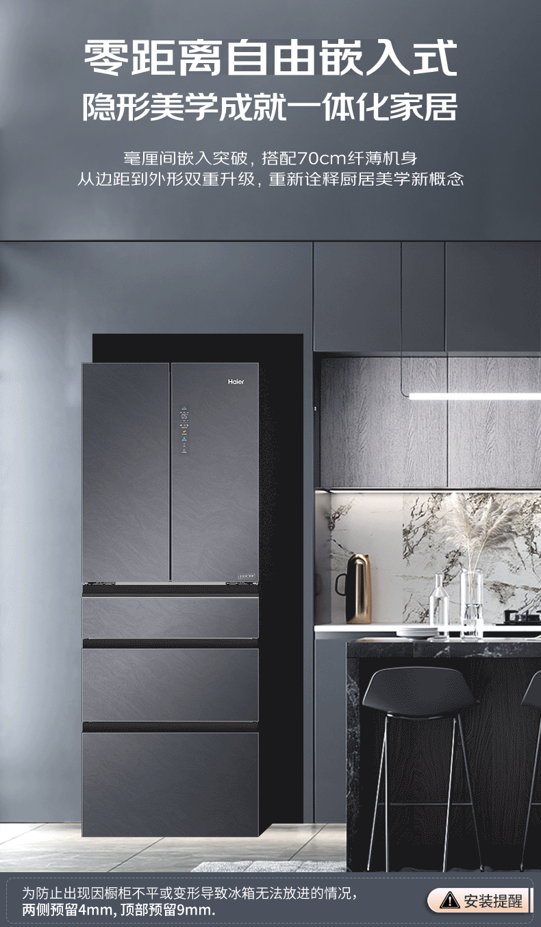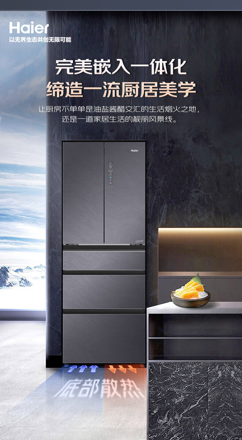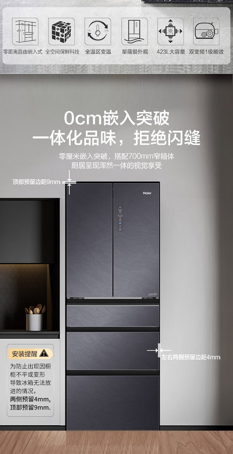 海尔(Haier)【700mm宽】冰箱423升零嵌入式超薄底部散热变频新一级风冷法式多门 70厘米宽 家用零嵌电冰箱 423L零距离嵌入+全空间保鲜变温+双变频
