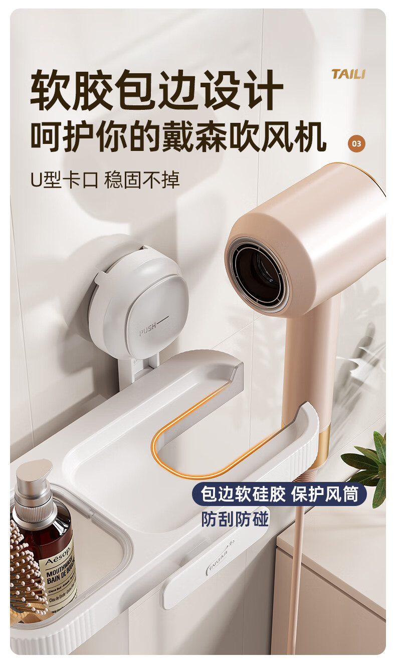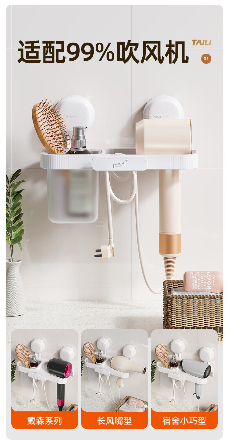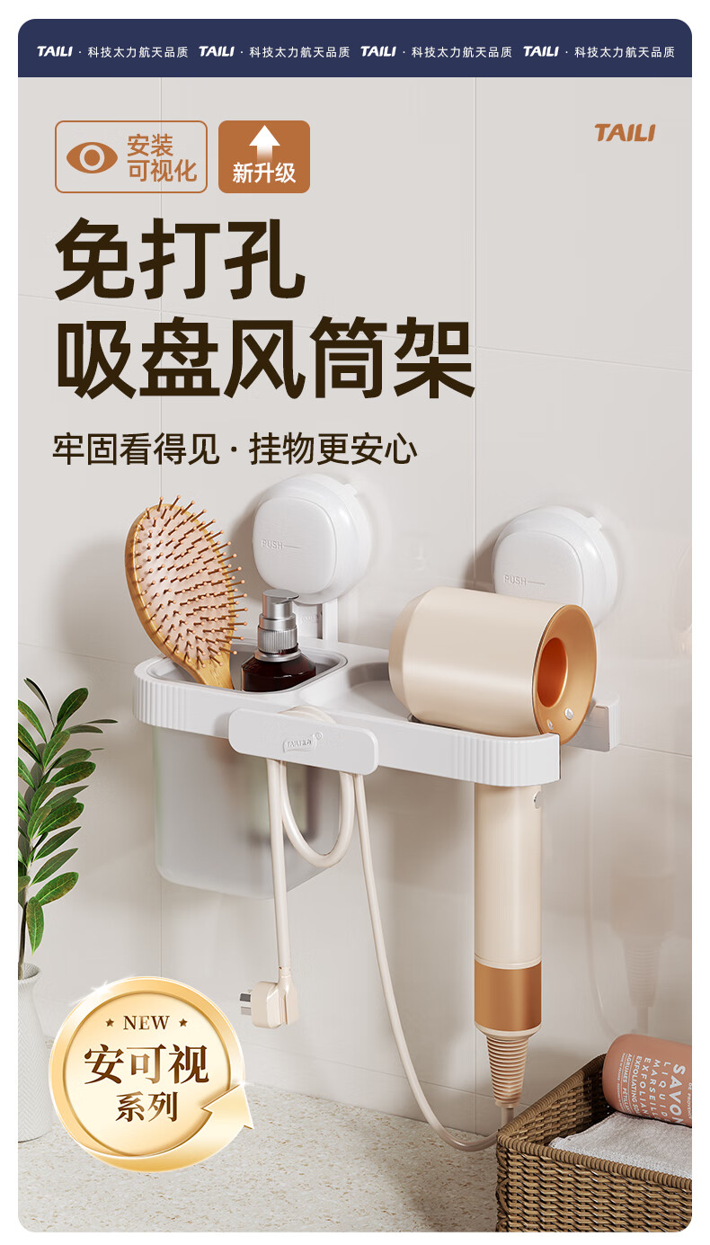 太力安可视吹风机架浴室免打孔吸盘风筒壁挂架卫生间收纳置物神器 白色带收纳盒