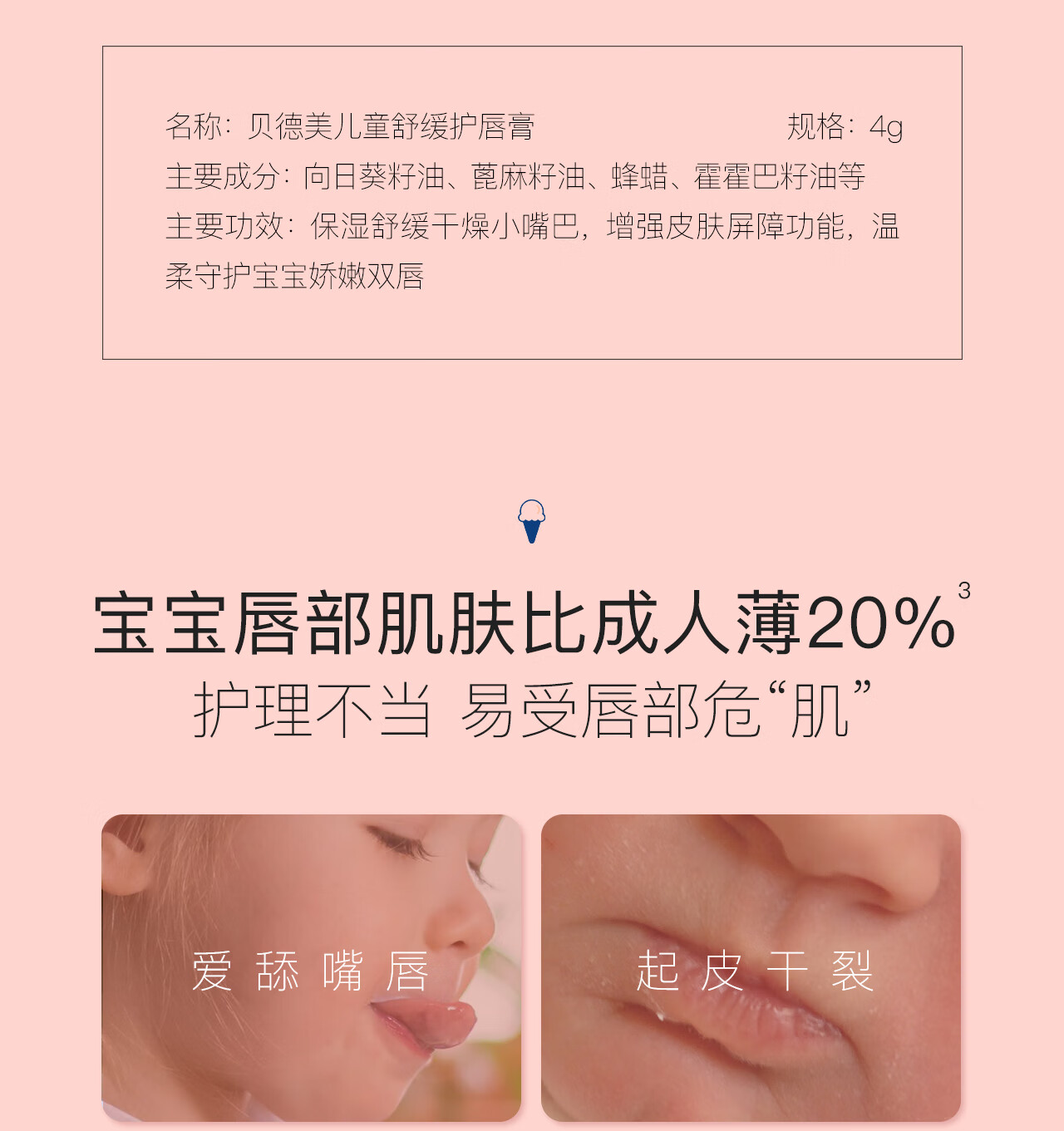 贝德美儿童润唇膏女保湿滋润防干裂婴儿护唇膏女童宝宝 儿童舒缓护唇球4g×2只