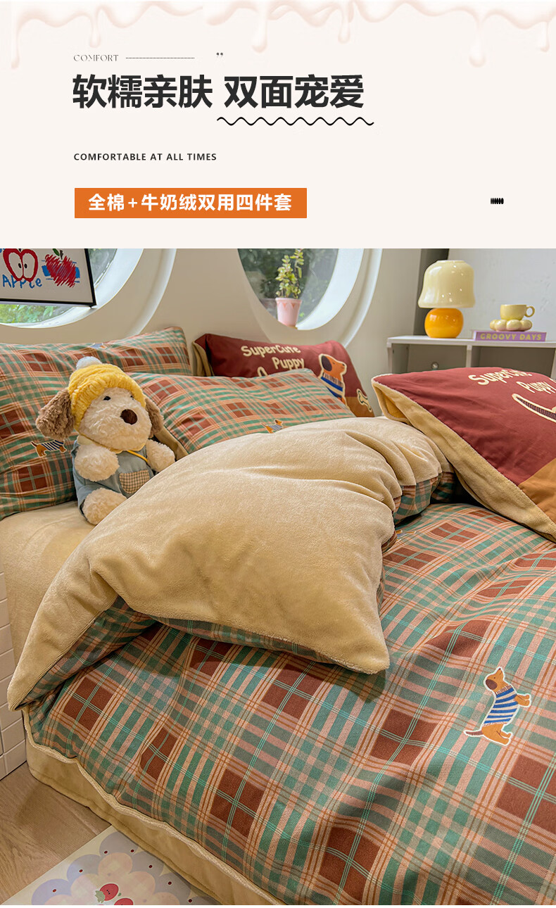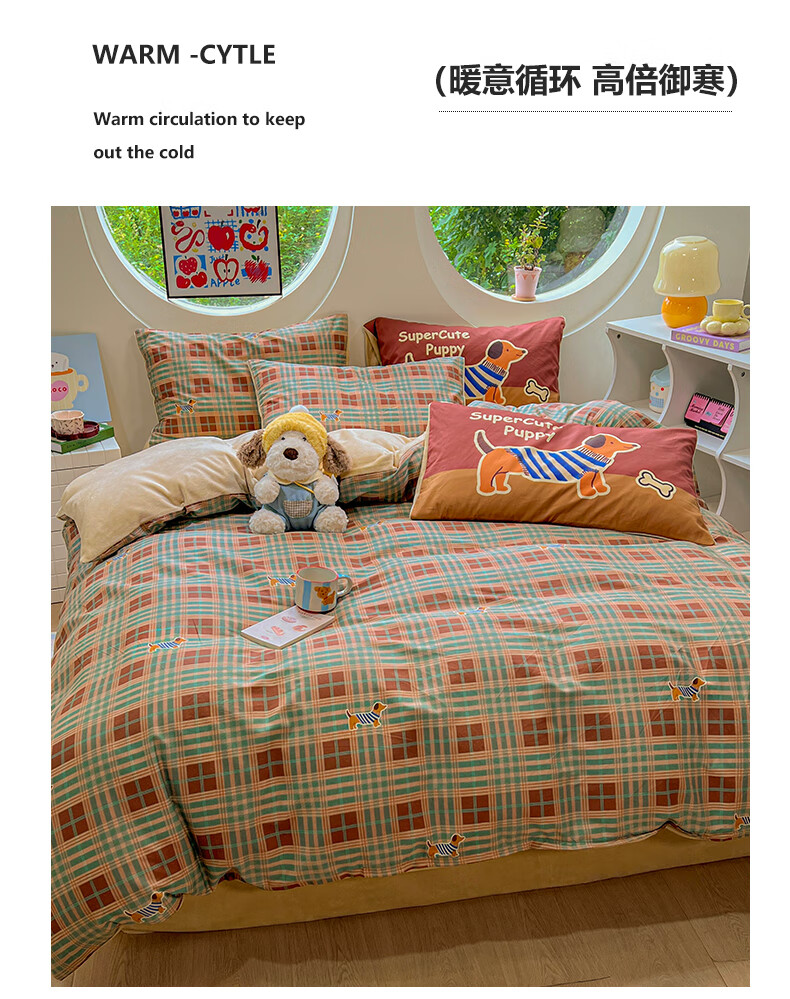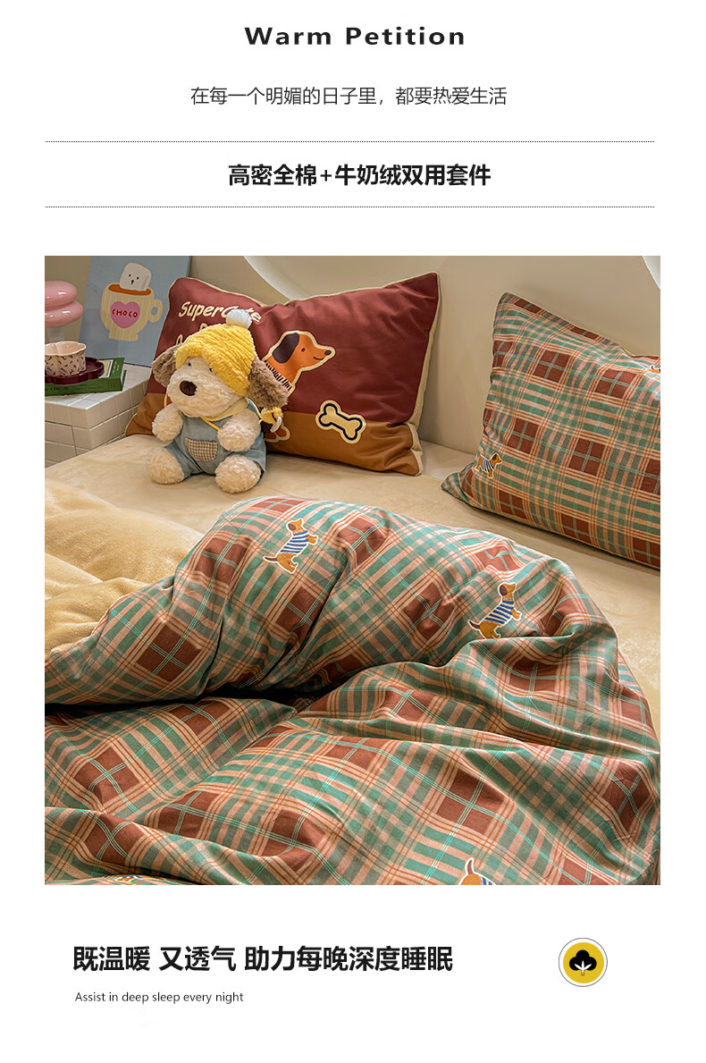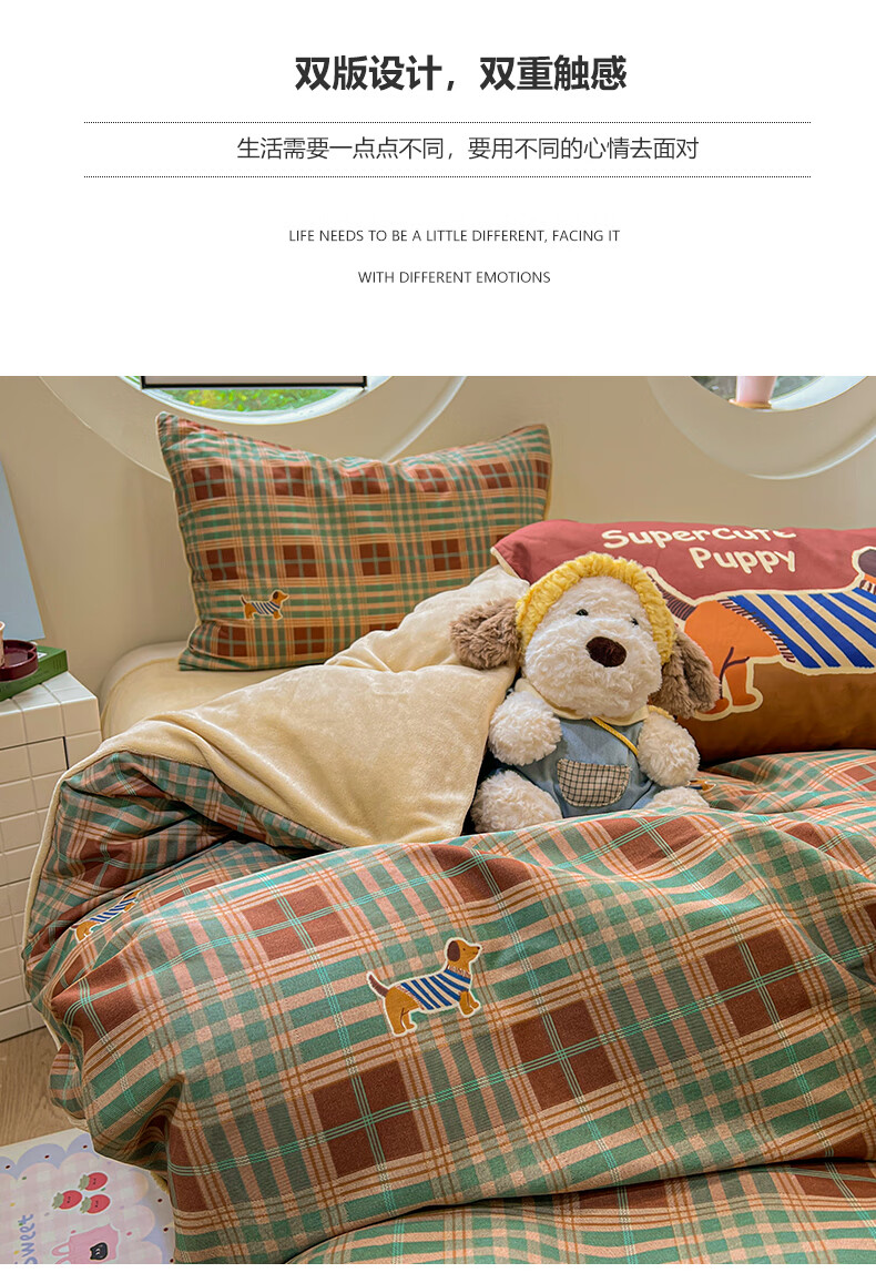 苏萱美拉德红棕格子小狗ab面纯棉牛奶绒床上四件套冬季全棉珊瑚绒被套 草莓腊肠狗 1.8m 床笠款 四件套-被套200x230cm