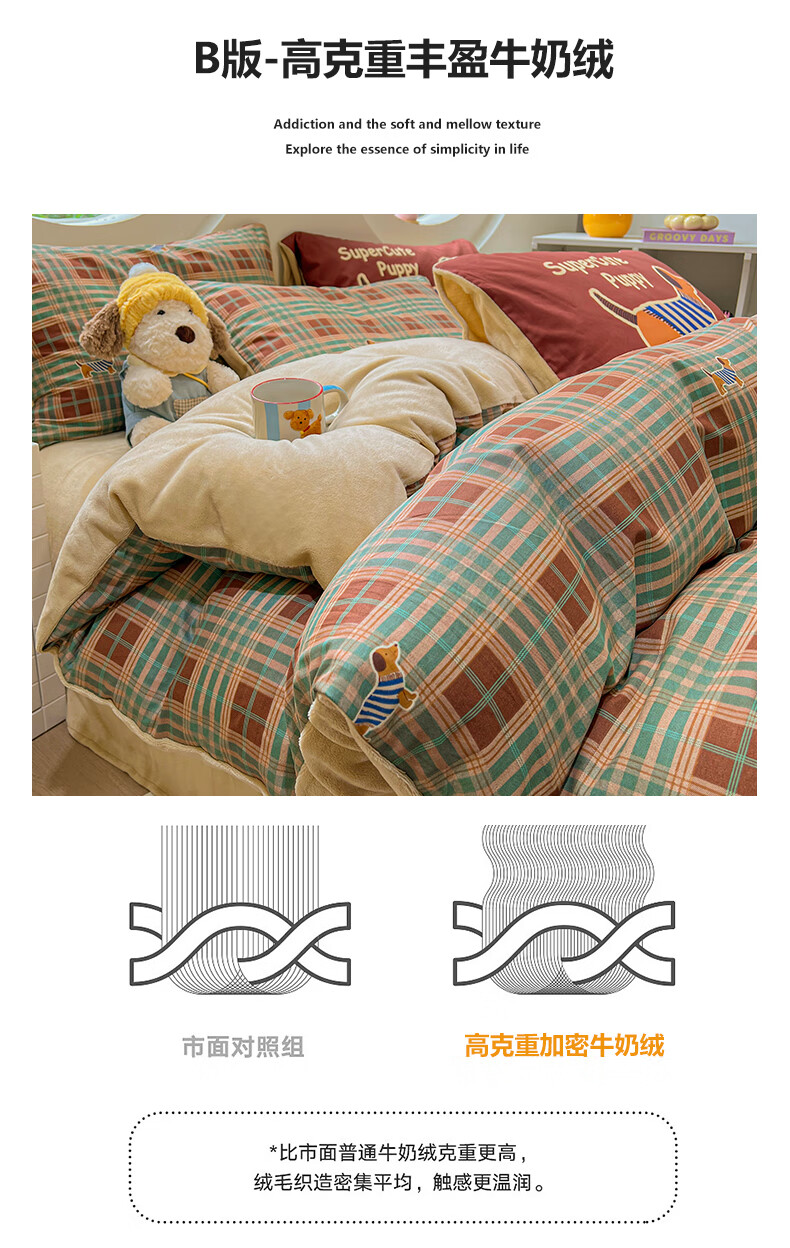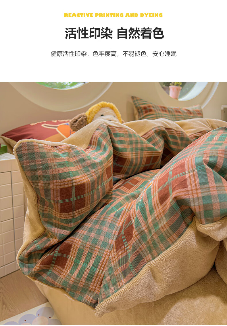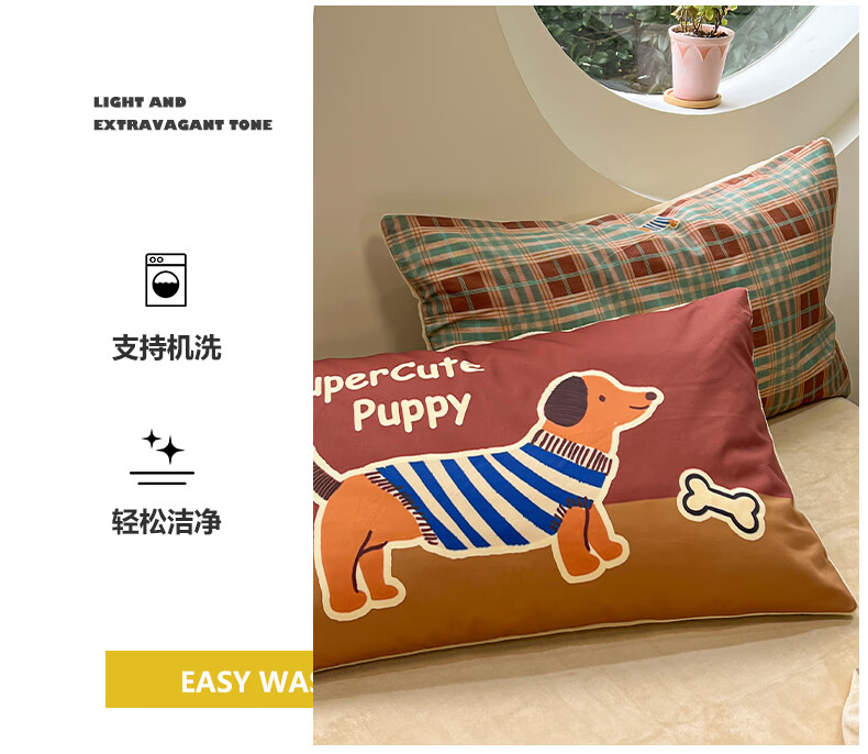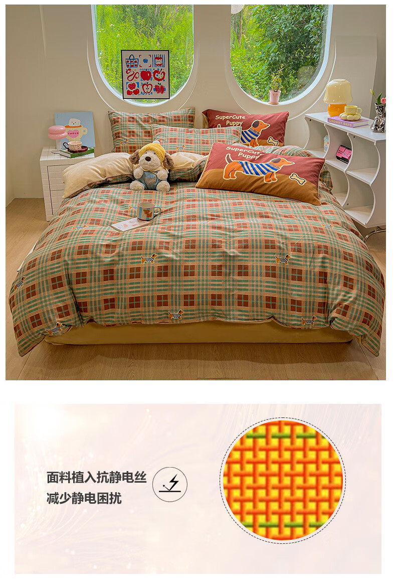 苏萱美拉德红棕格子小狗ab面纯棉牛奶绒床上四件套冬季全棉珊瑚绒被套 草莓腊肠狗 1.8m 床笠款 四件套-被套200x230cm