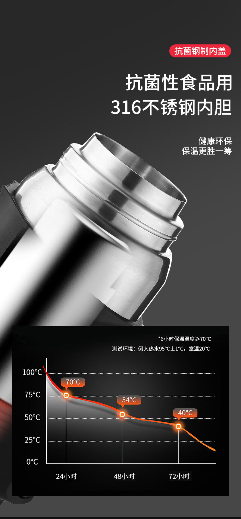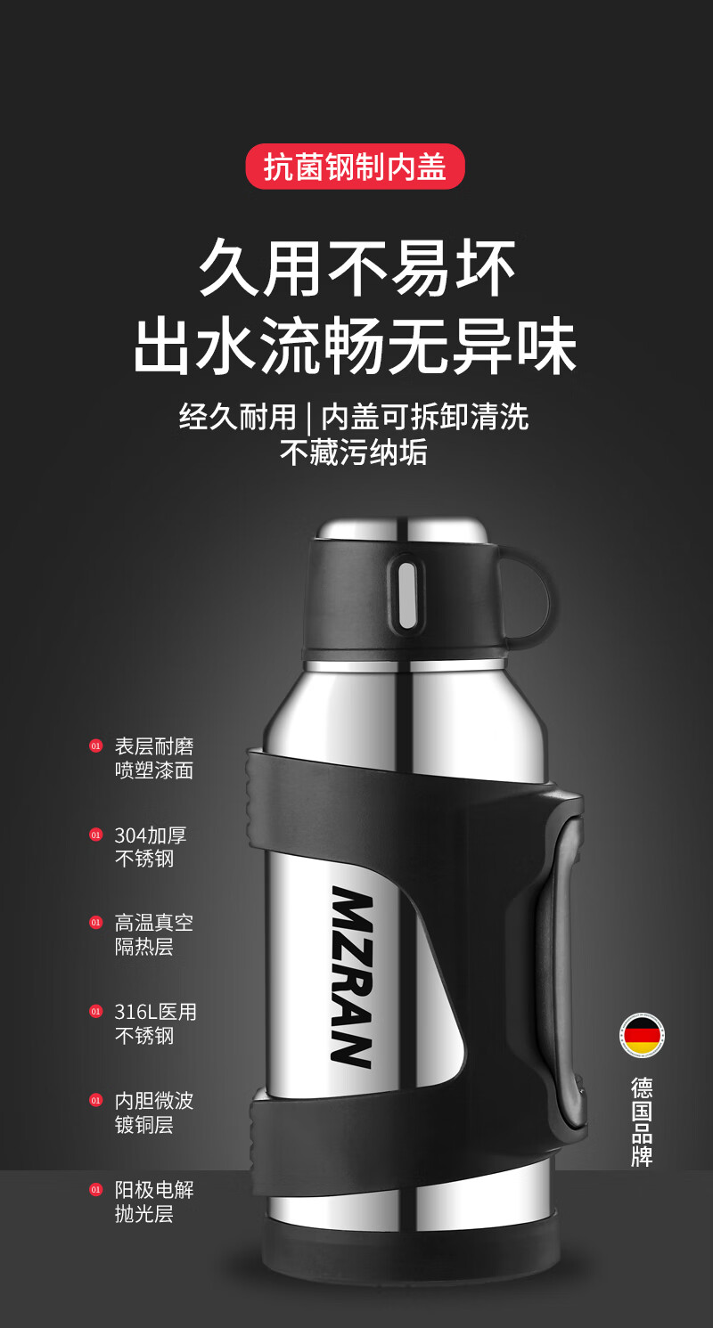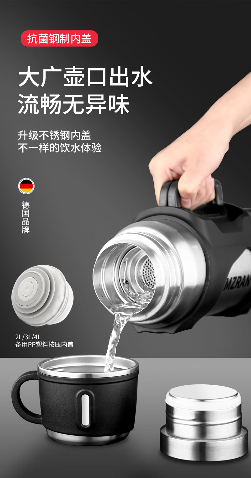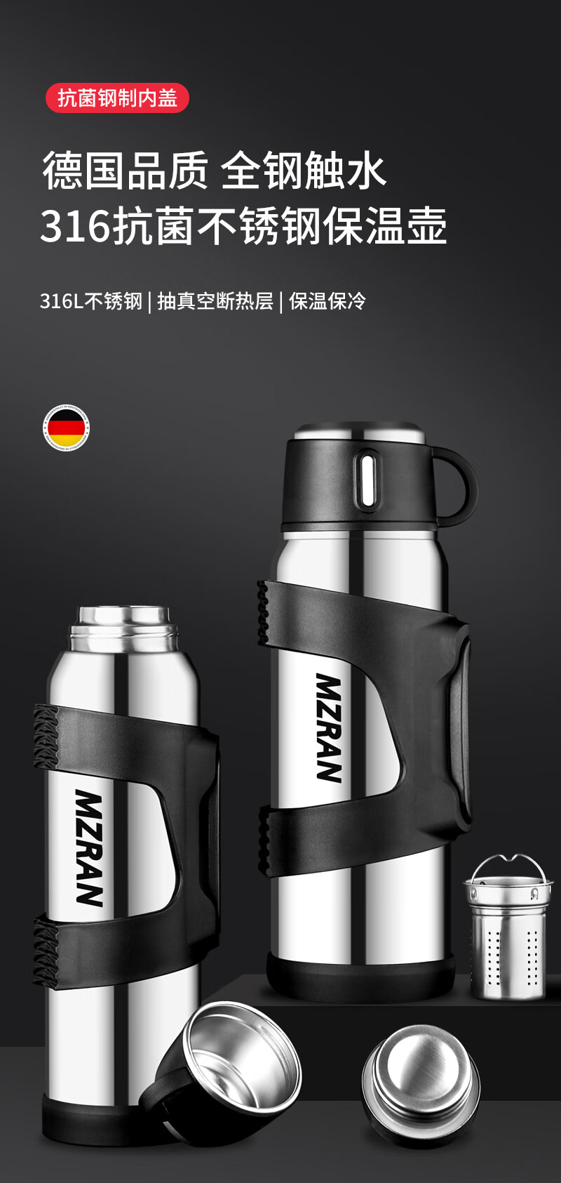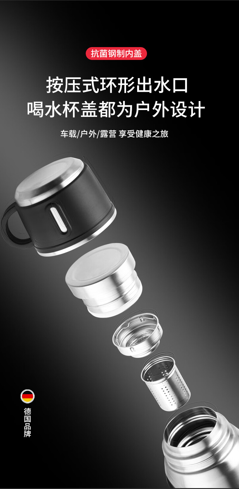 DEATKN德国316不锈钢保温壶户外大容量保温杯男可携式泡茶全钢保冷水壶 黑色【茶水分离】+按压内盖_(送抱婴袋 2L