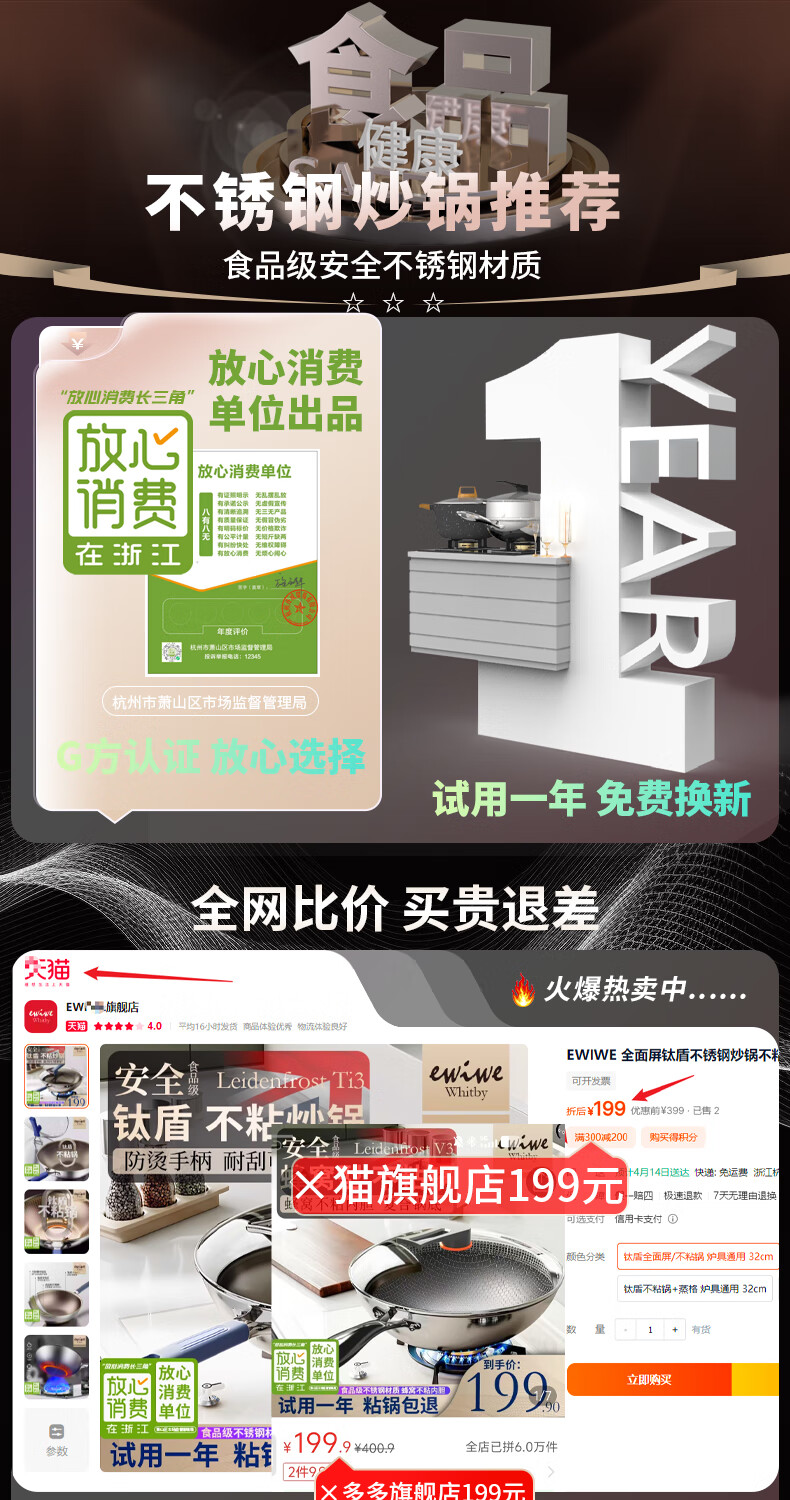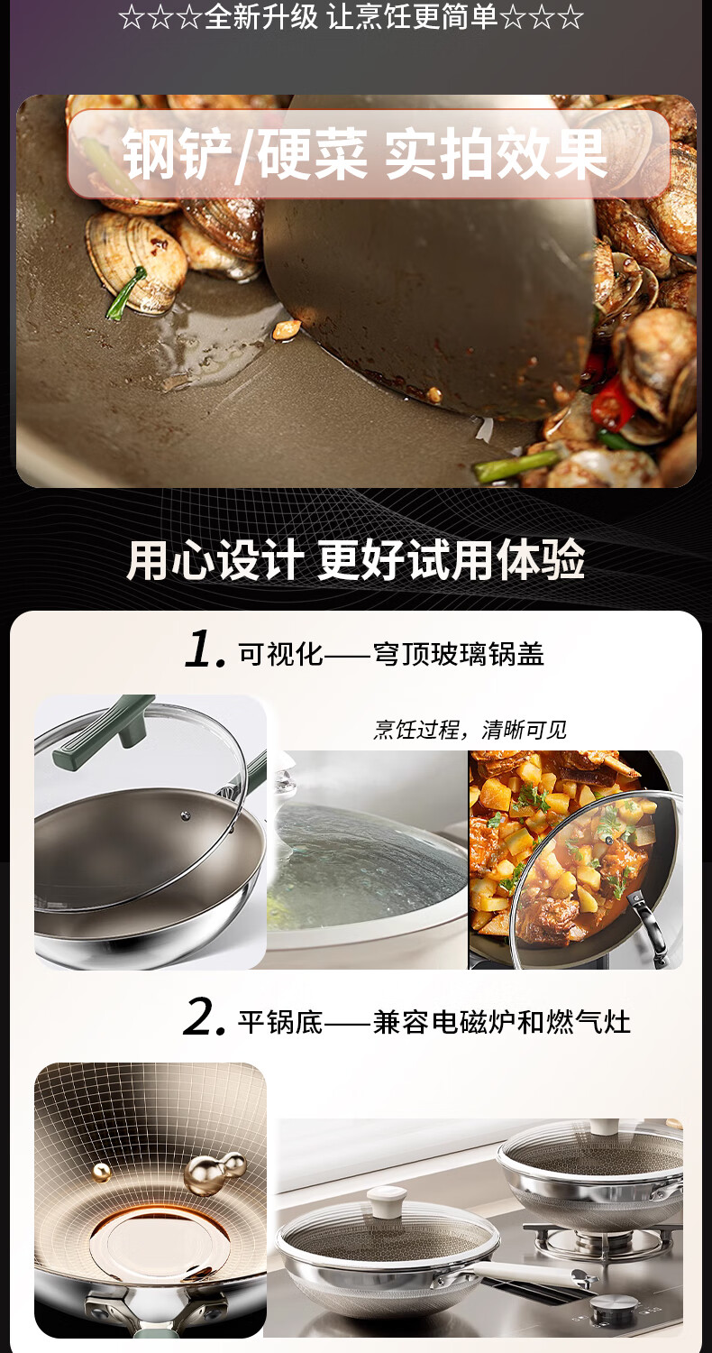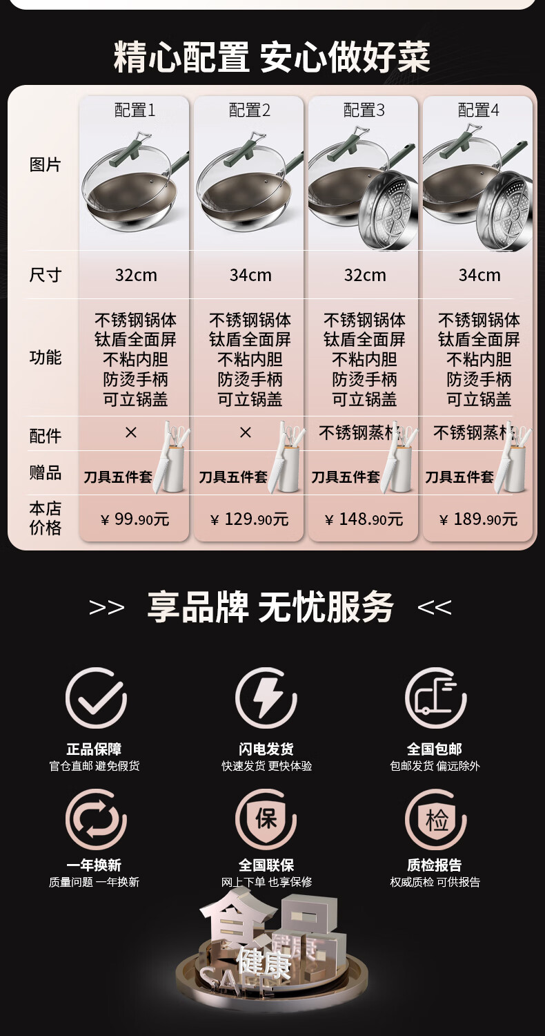 EWIWE加厚食品安全级不锈钢炒锅全面屏不粘炒锅全钢炉具通用型 钛盾不粘锅+蒸格 炉具通用 32cm