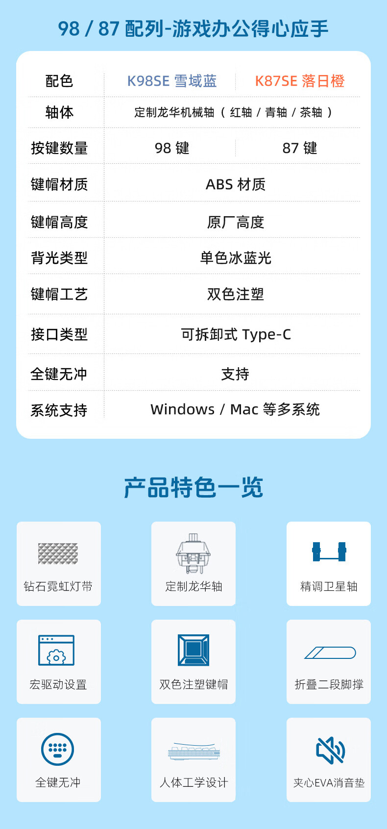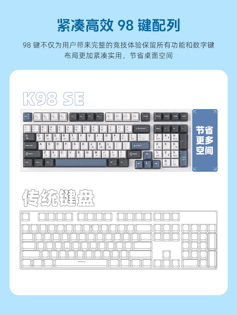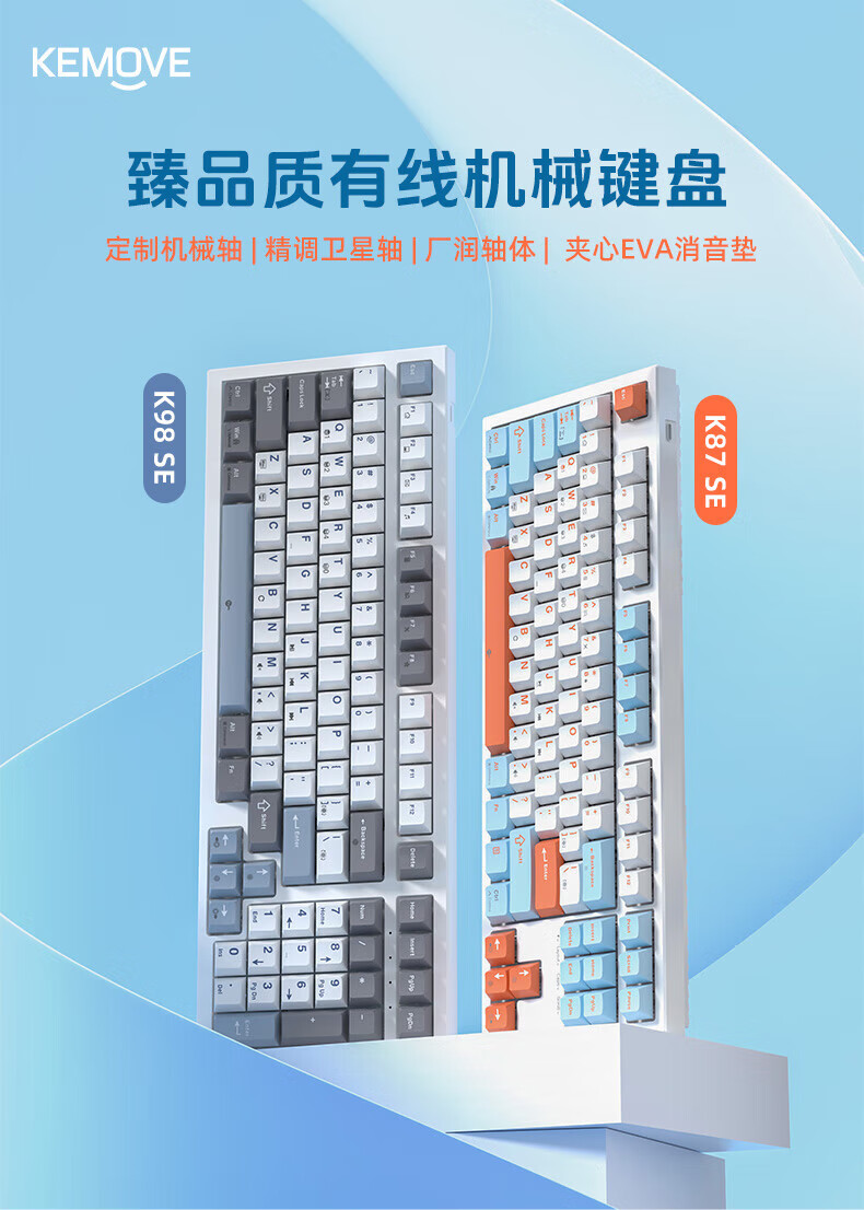 KEMOVE K98SE 有线灯带机械键盘游戏电竞笔记本电脑办公吃鸡全键无冲键盘 K98SE 雪域蓝 定制红轴
