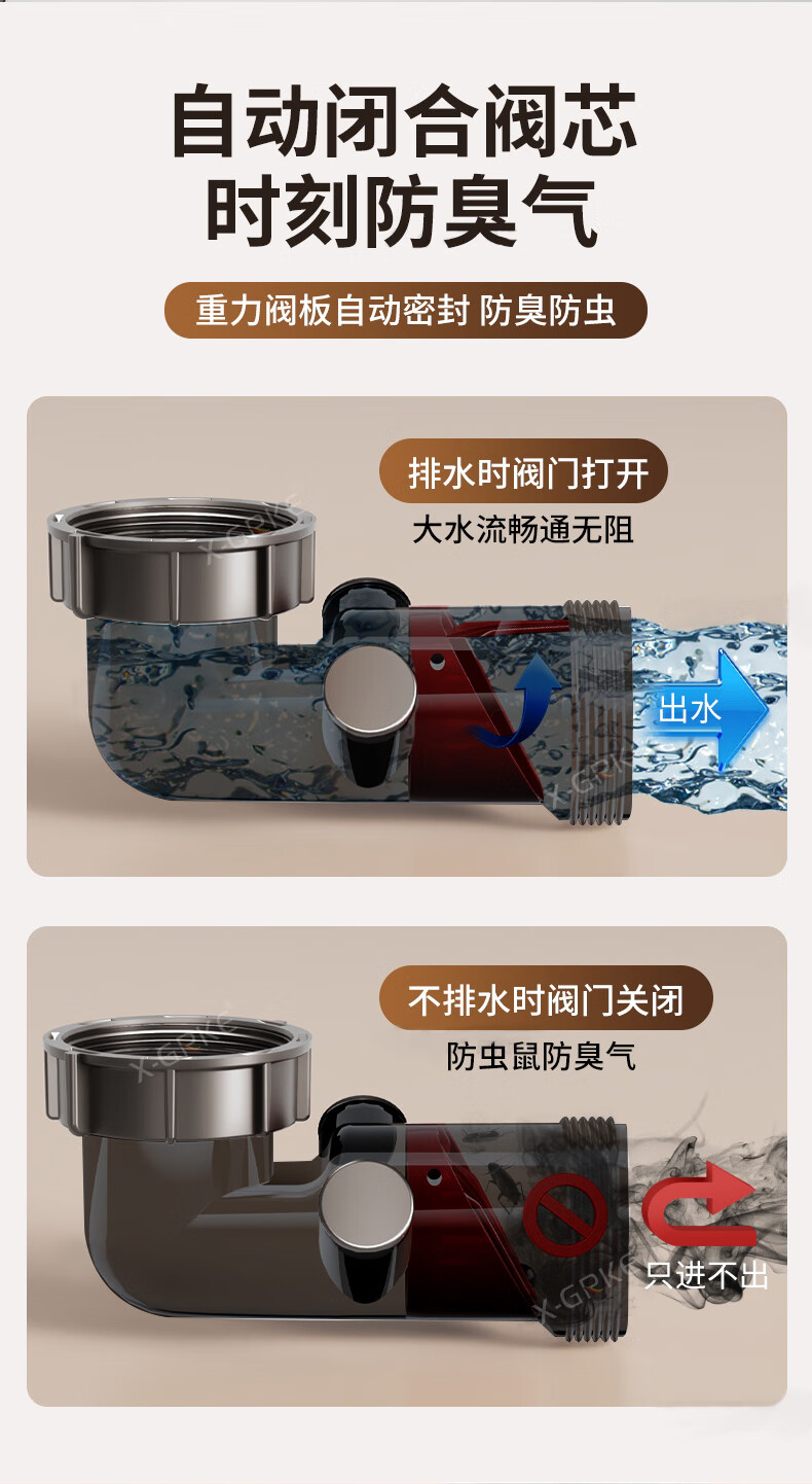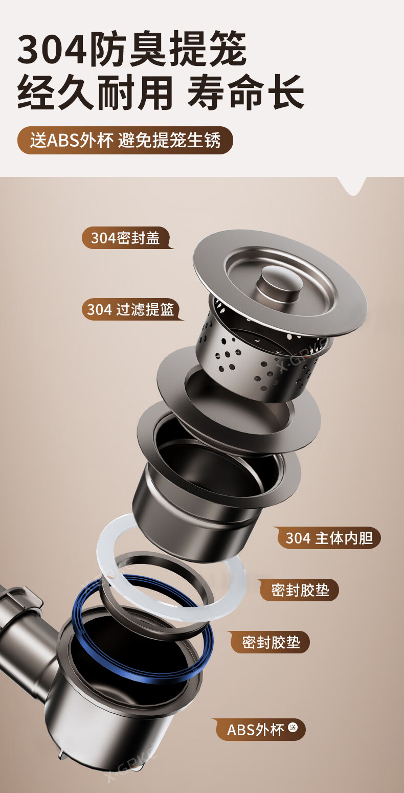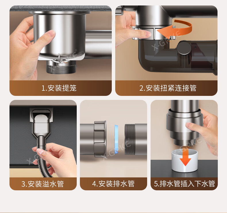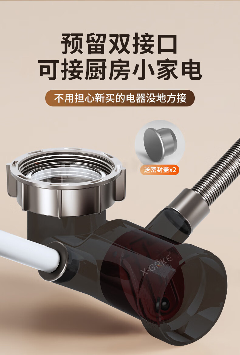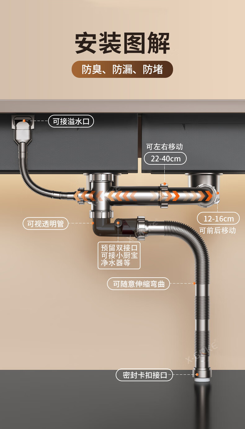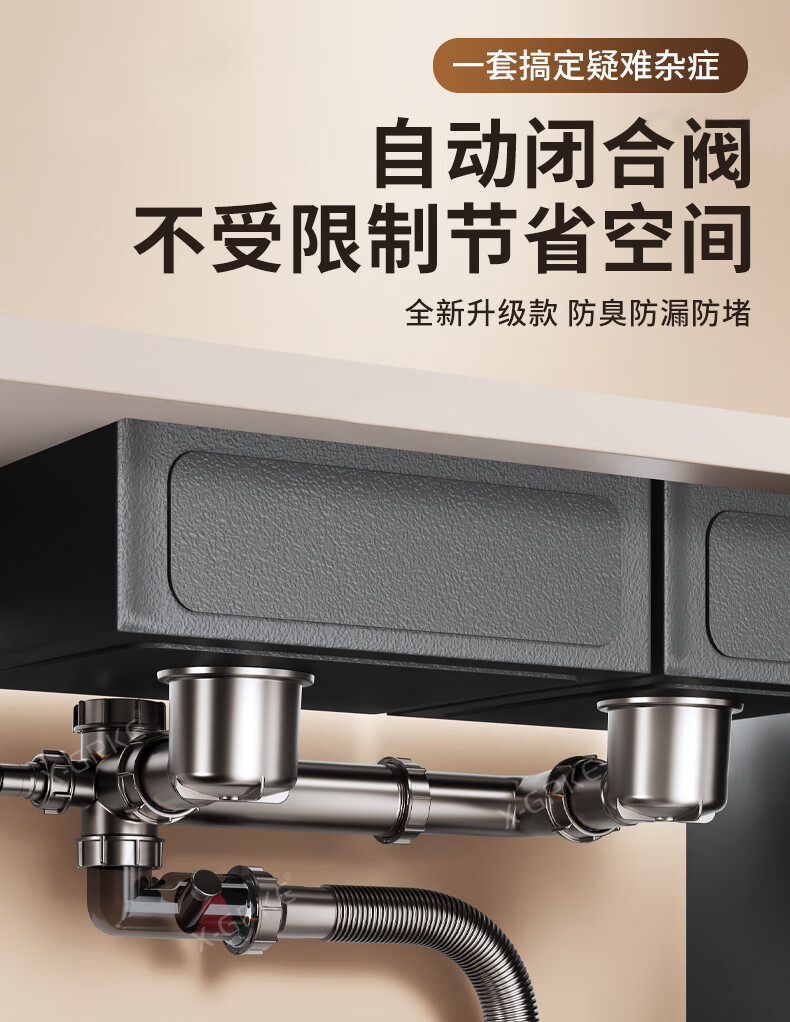 X-GRKE【德国】厨房下水管道全套洗菜盆不锈钢双槽三通排水管防臭配件 【110+110】双槽下水管套装 升级加厚304提笼丨自动闭合阀芯
