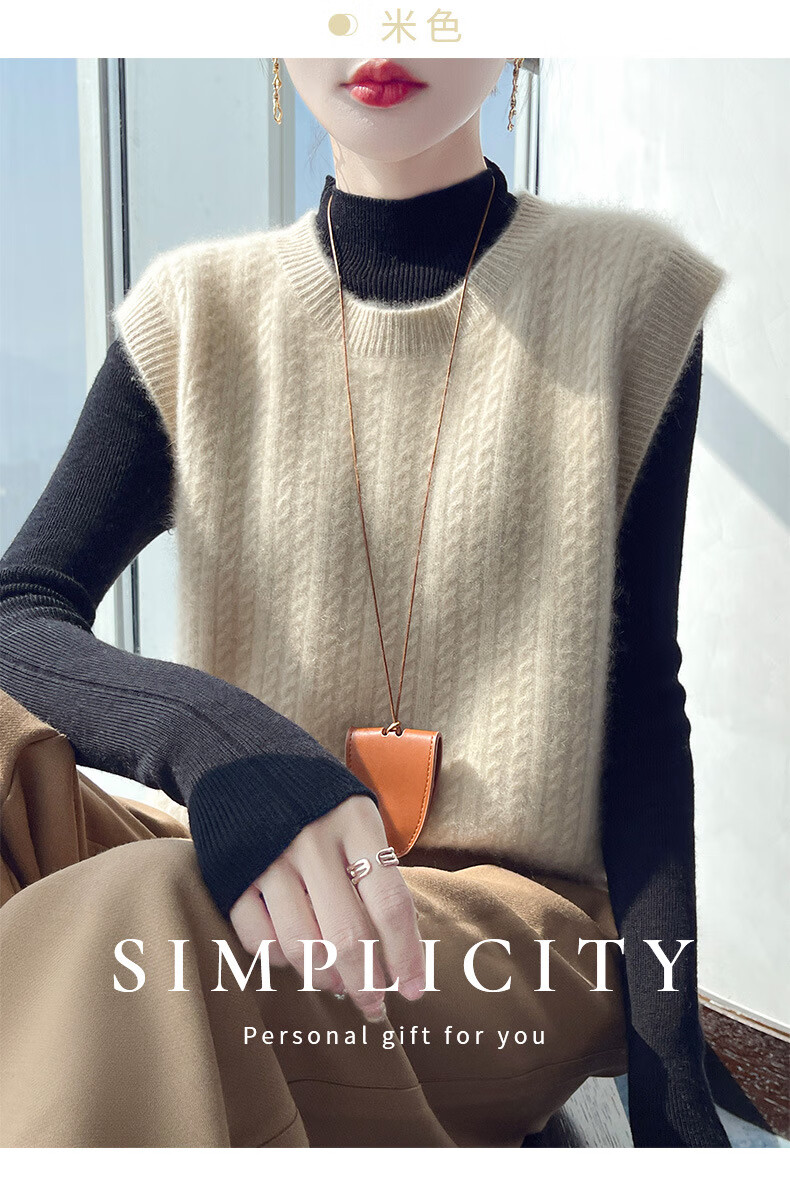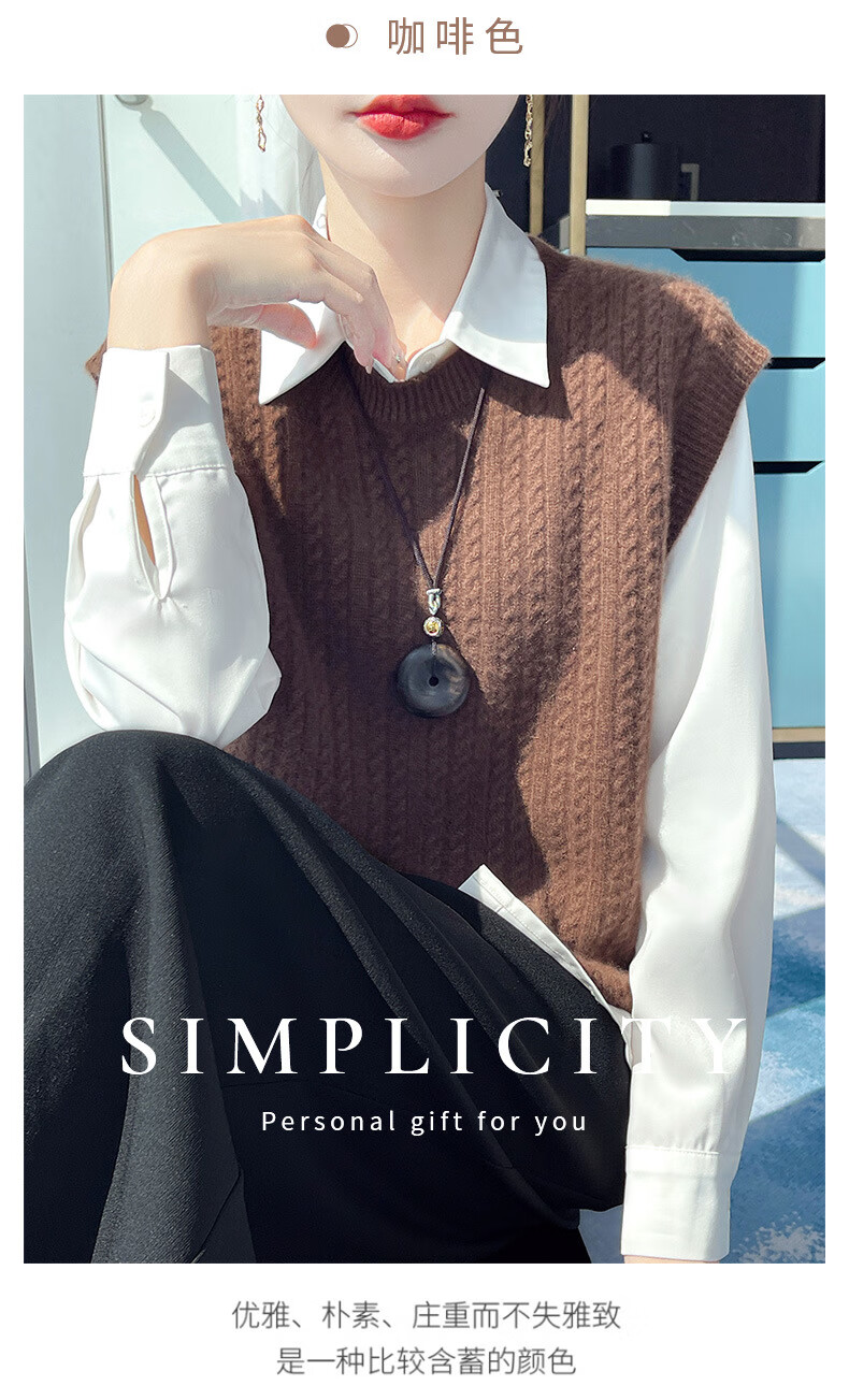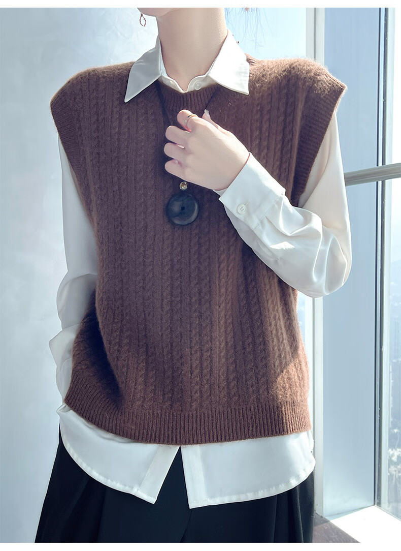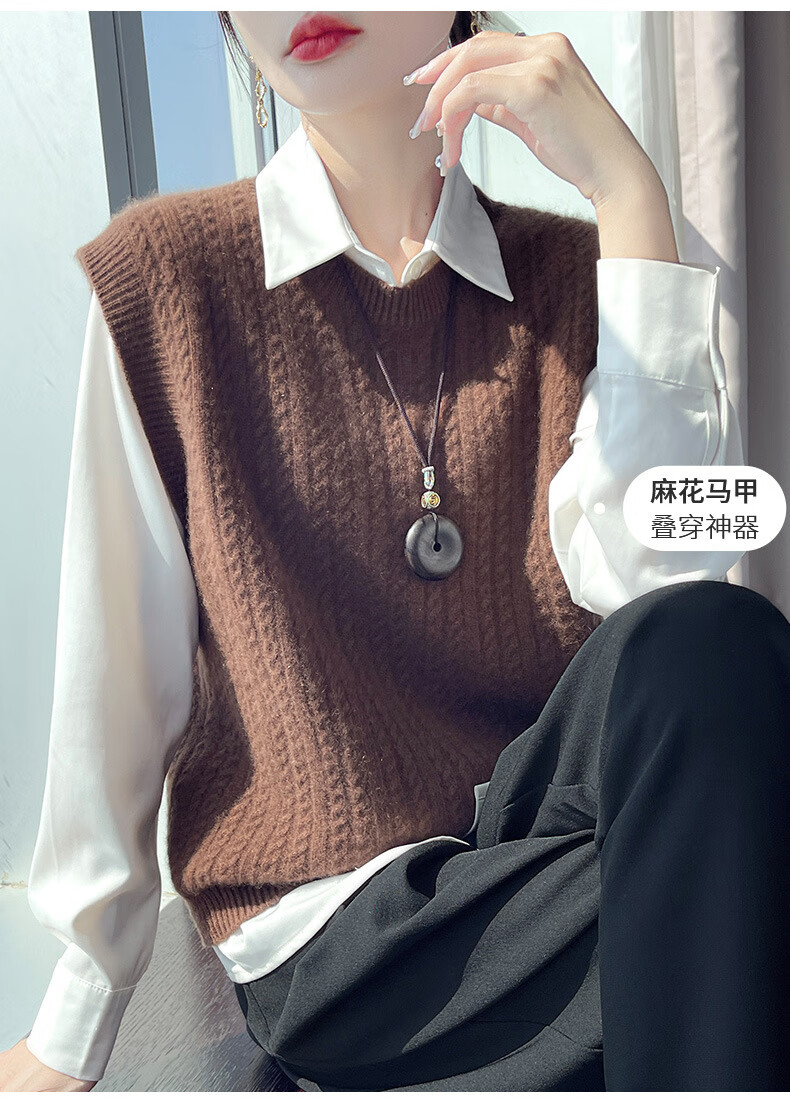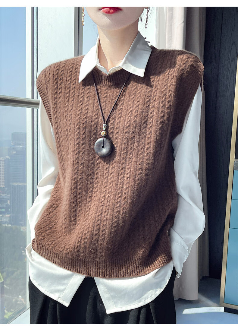 子牧棉麻2025秋装 女复古绞花圆领针织马甲背心叠穿针织无袖坎肩上衣0025 咖啡色 均码 (建议90-135斤)