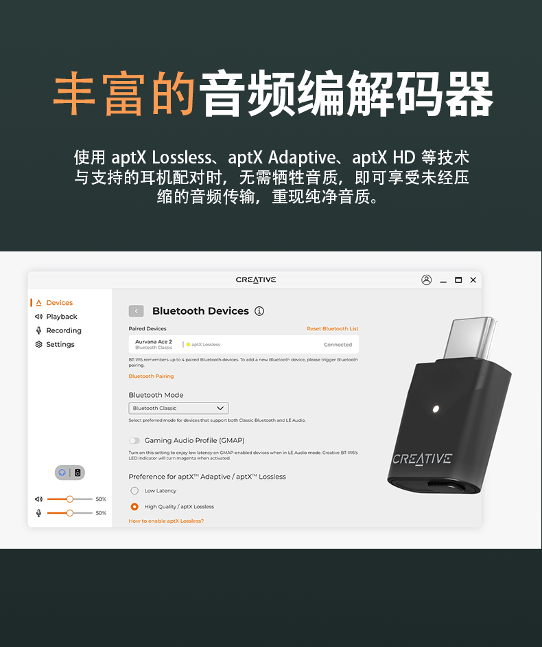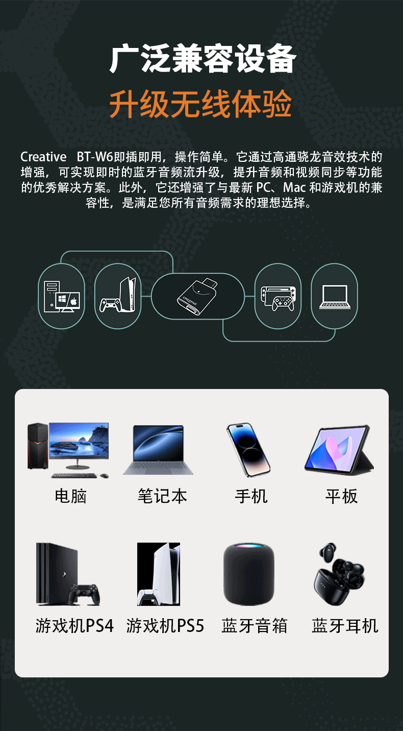 创新BT-W6无线蓝牙5.4音频发射器适配器无损LDAC低延迟ps4/5Switch通用 BT-W6
