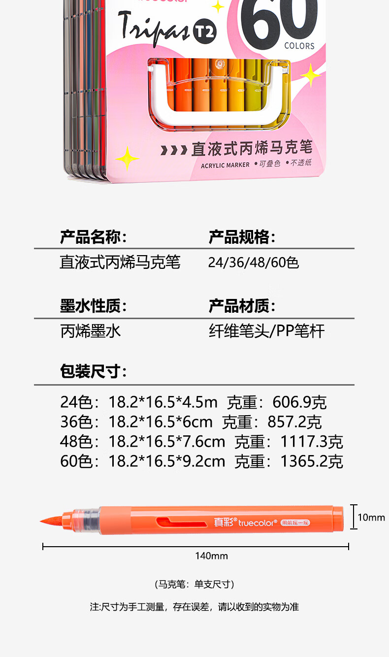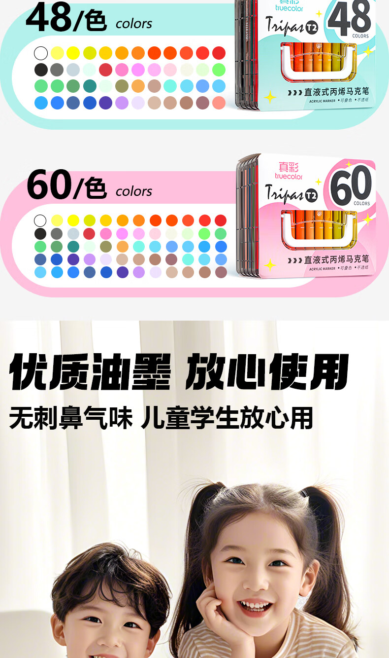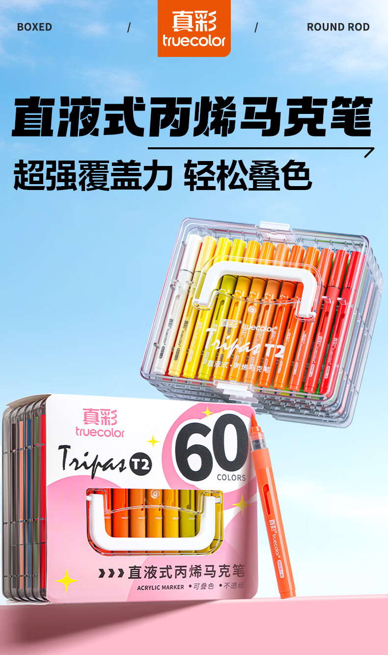 真彩(TRUECOLOR)60色直液式丙烯马克笔软头学生美术专用美术生不透色可叠色可水洗儿童小学生幼儿园水彩笔套装T2