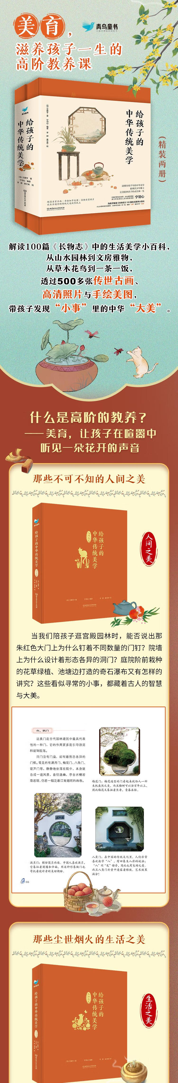 给孩子的中华传统美学(精装2册)以《长物志》为蓝本,精选12卷100 篇,分人间之美、生活之美,均含原文、注释、译文等
