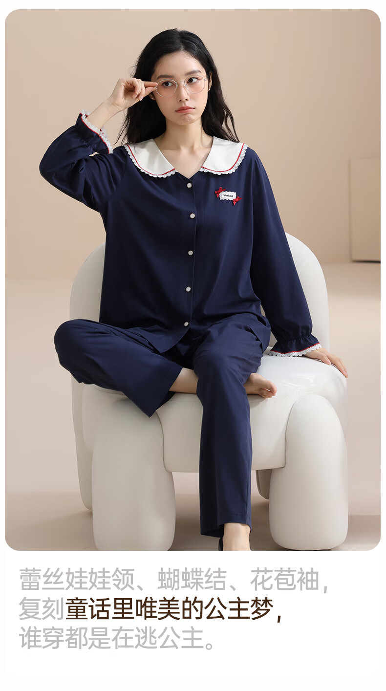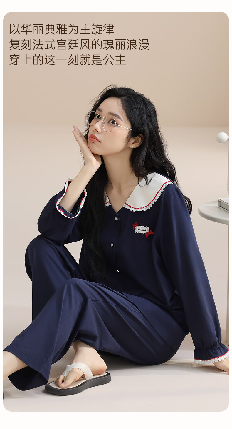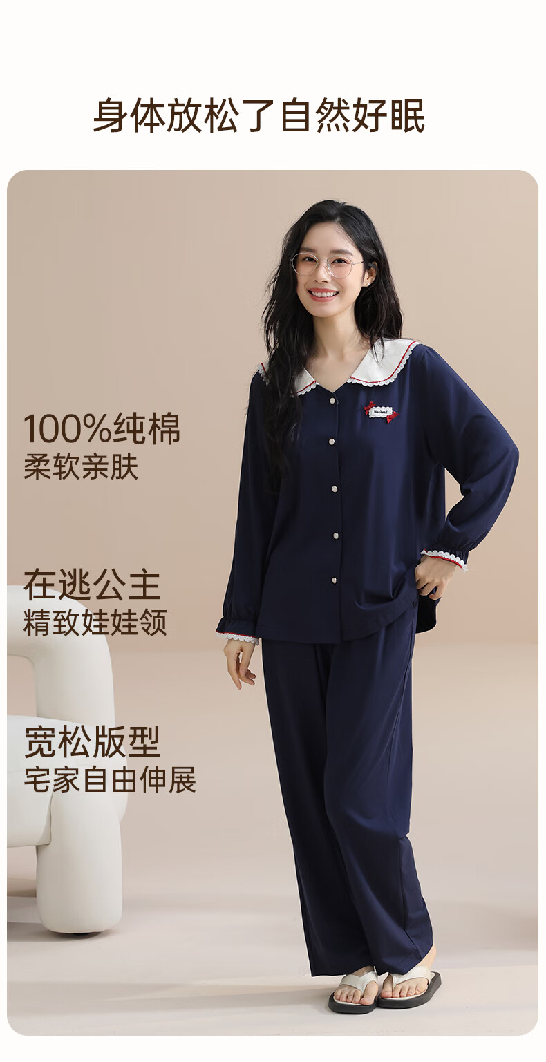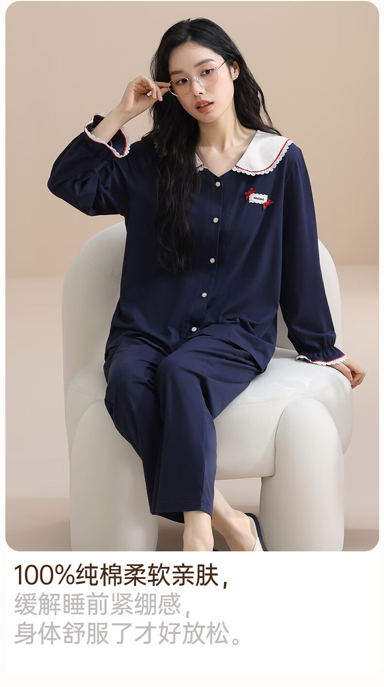 玛伦萨纯棉睡衣女春秋季2025新款可外穿长袖长裤大码女士家居服套装 宝兰 M