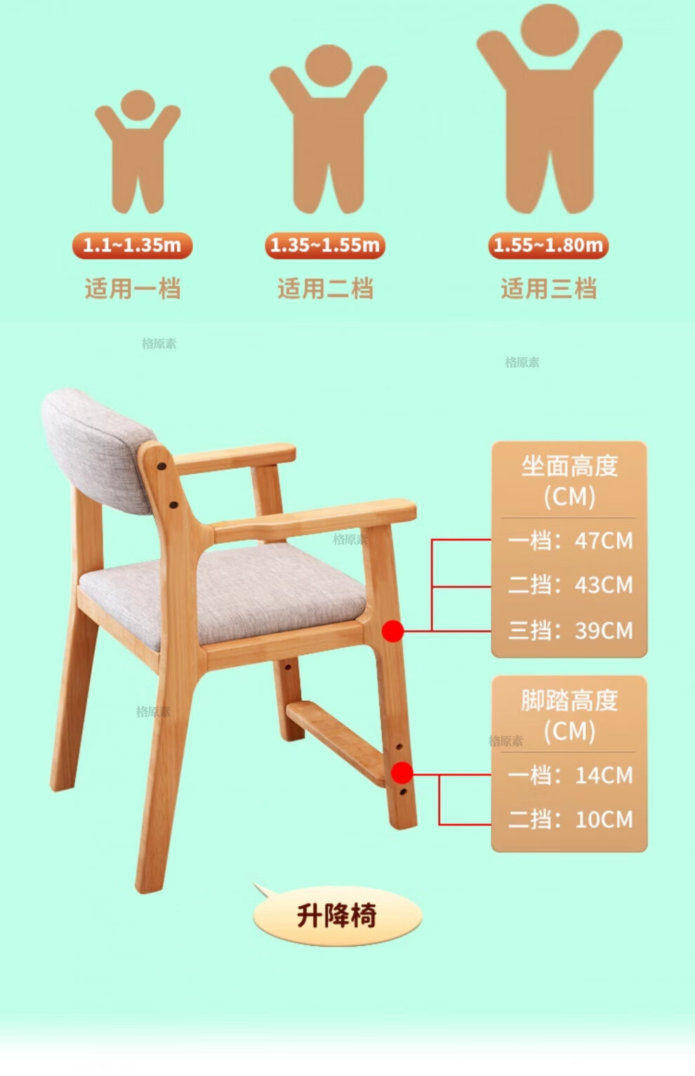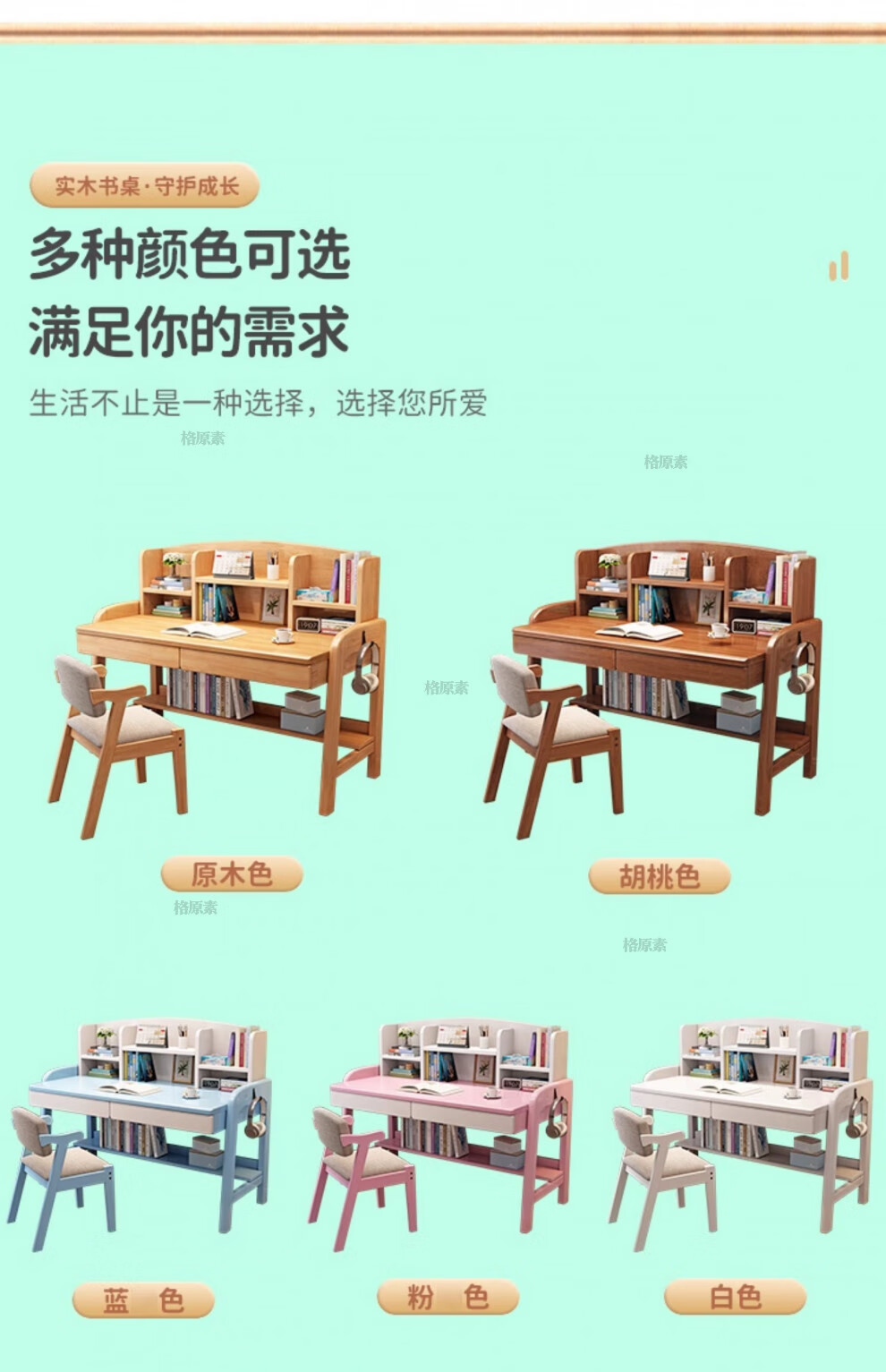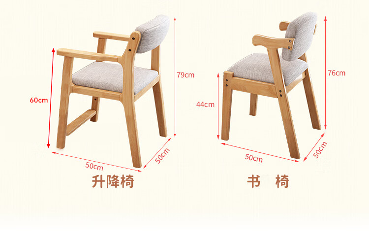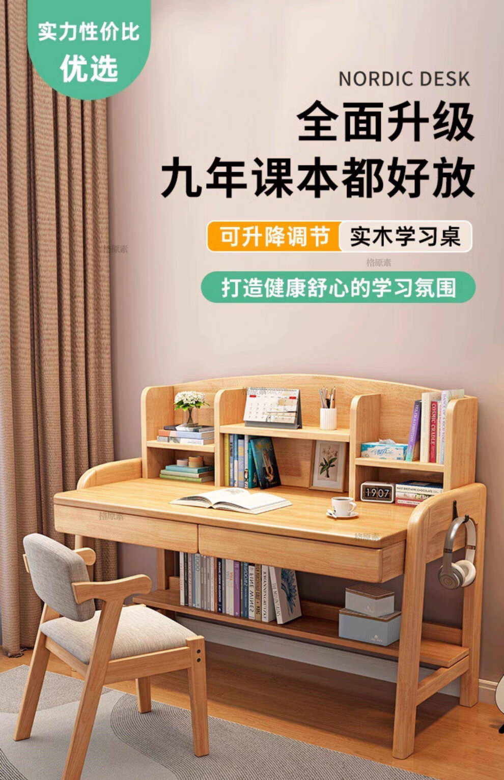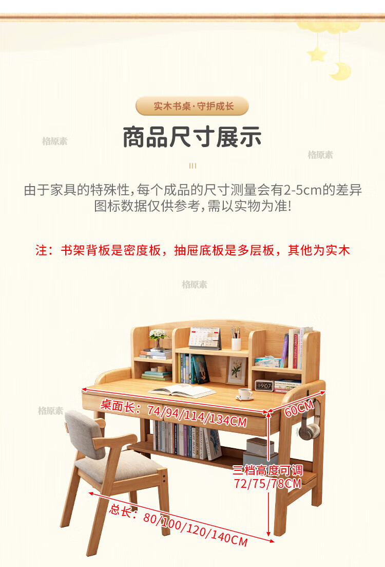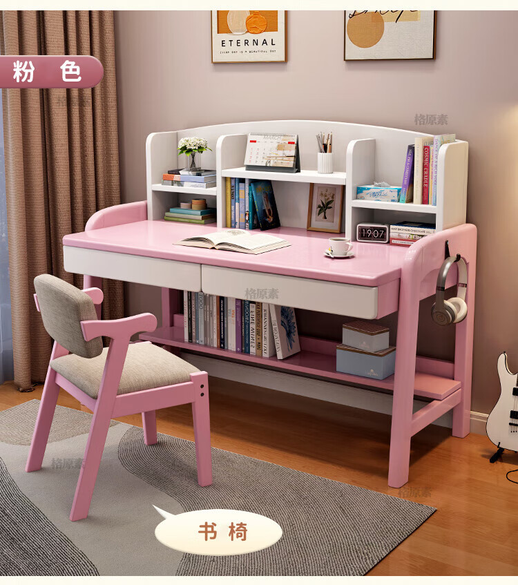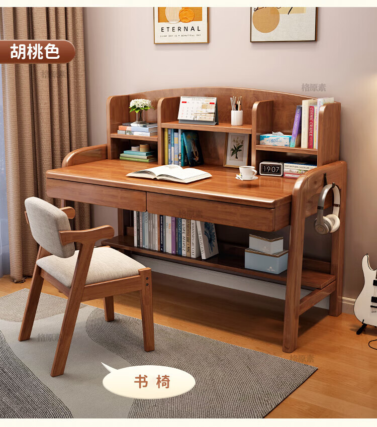 格原素2025新款实木儿童学习桌简易桌子卧室女生书桌学生写字桌可升降带 胡桃色单桌+升降椅 实木可升降调 80x60x118cm