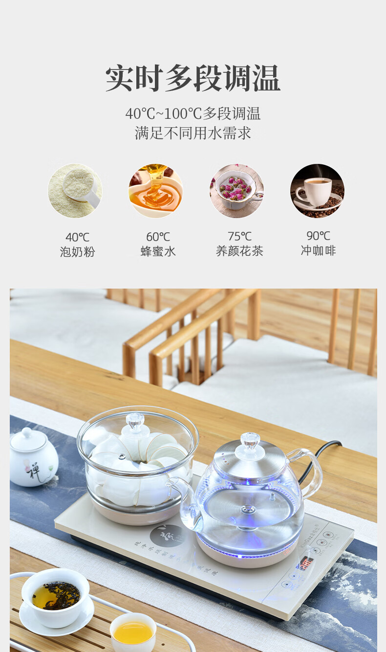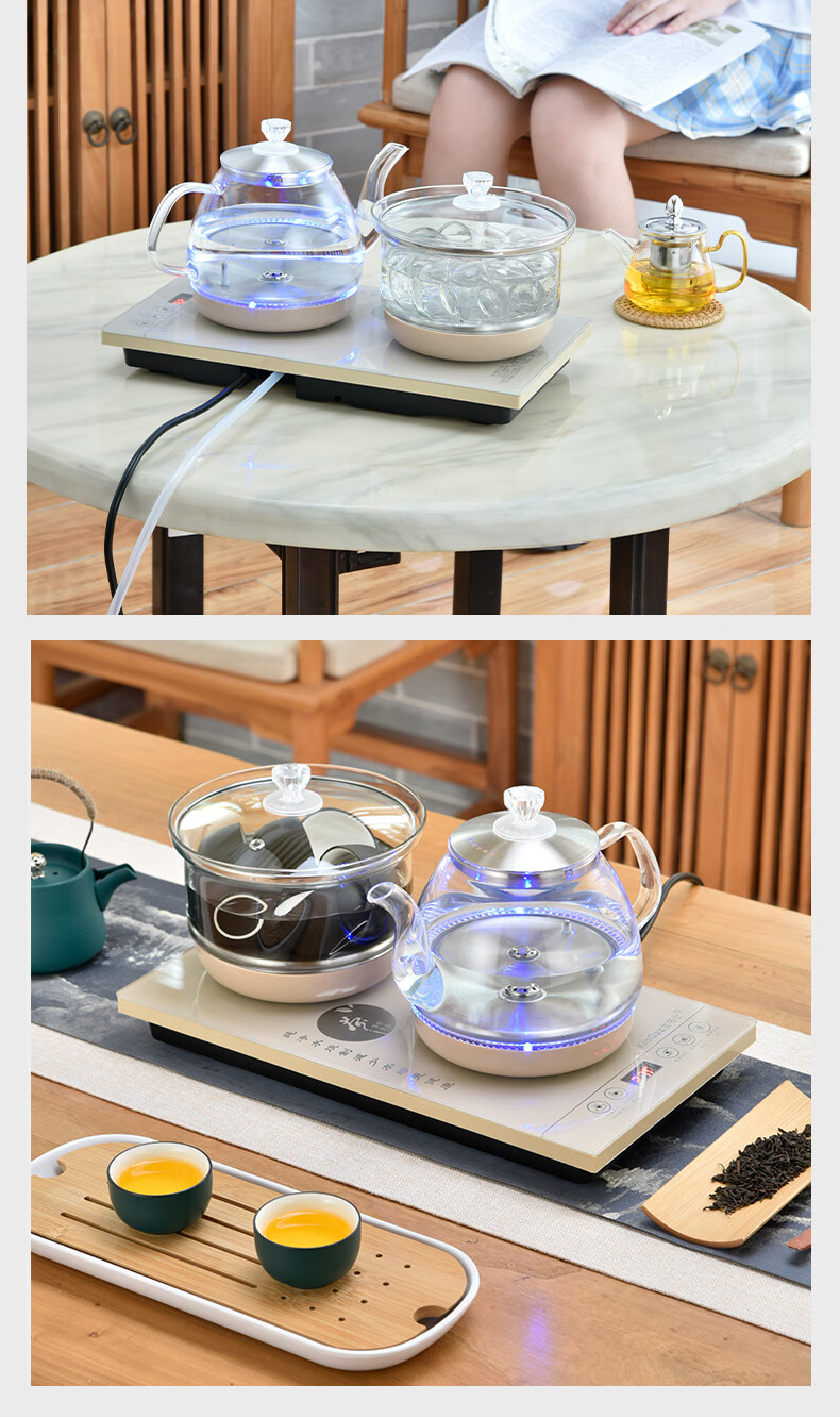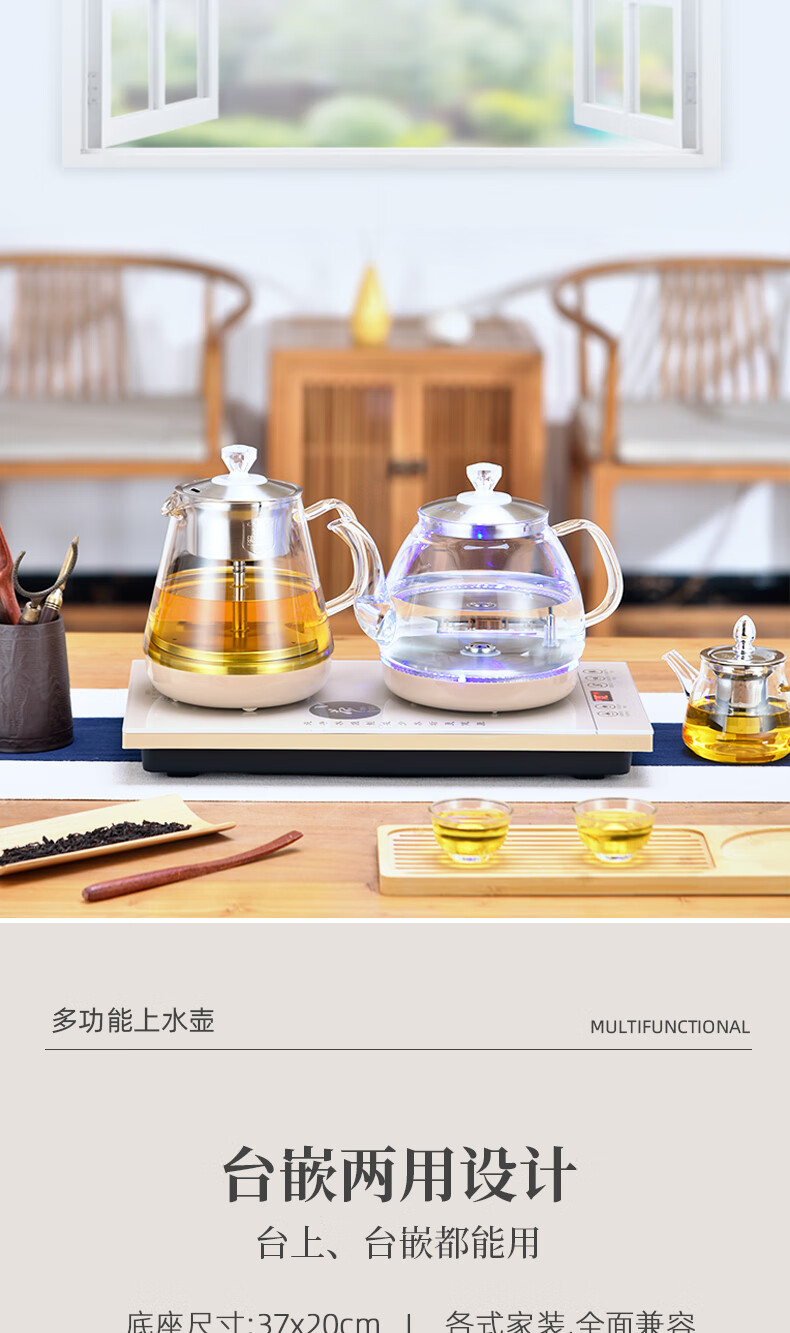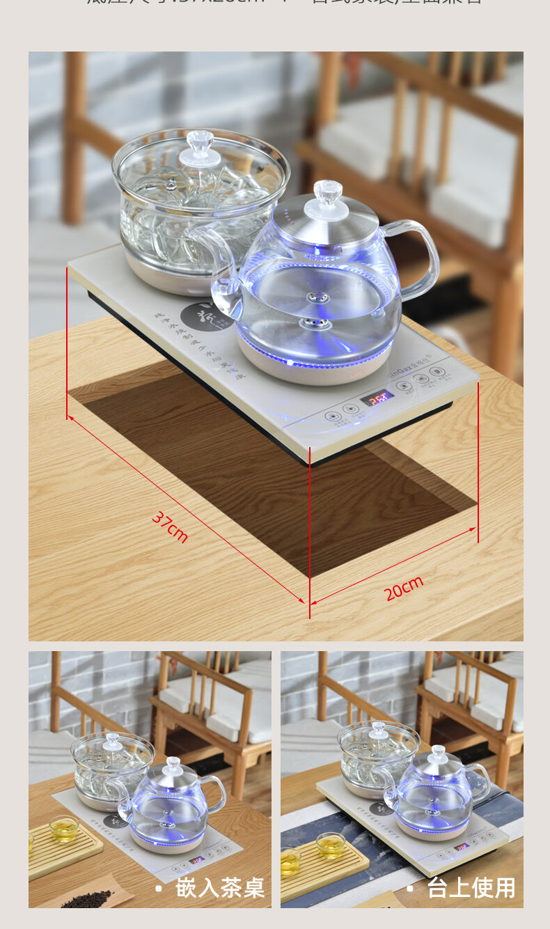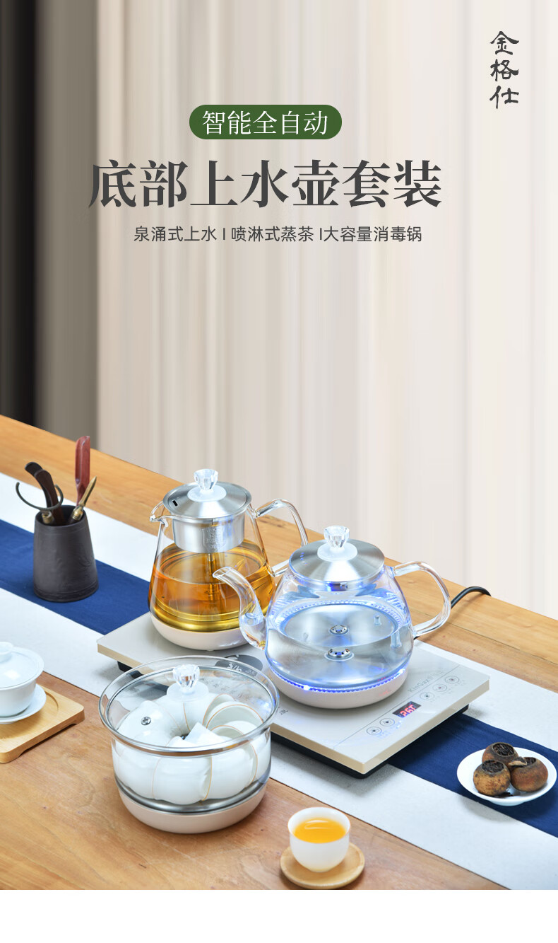 金格仕全自动底部上水电热水壶 家用玻璃烧水壶 台嵌两用电磁茶炉 茶台一体电茶炉套装带蓝光桶装水专用 1L 单边底上水(蓝光))消毒款 23X37cm