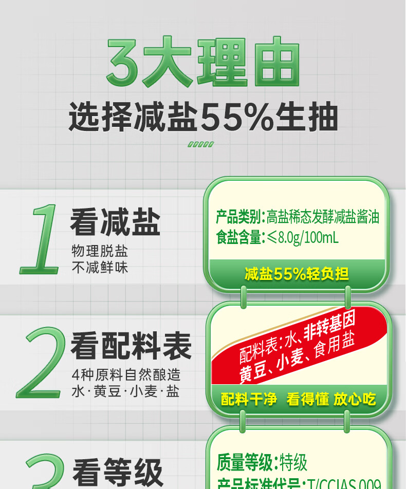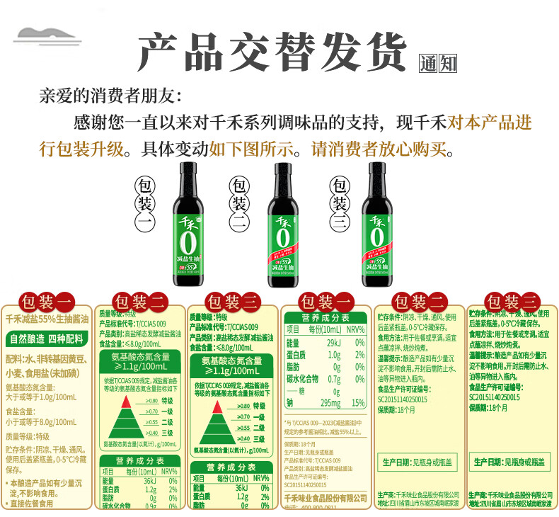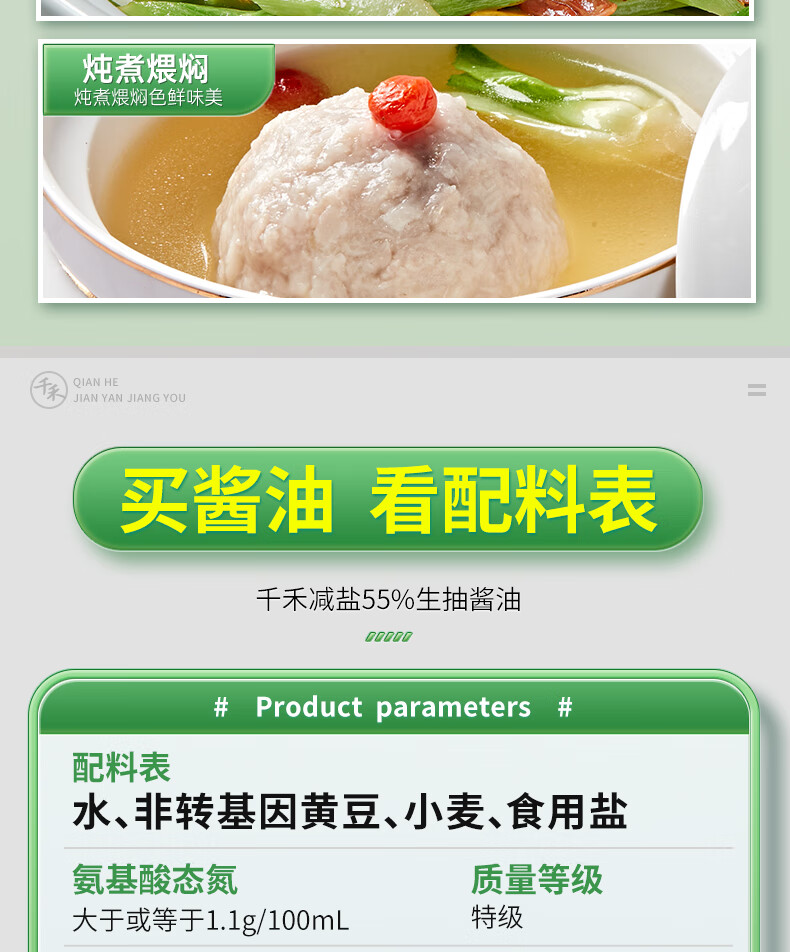 千禾酱油0添加特级酱油减盐55%生抽500ml*2瓶