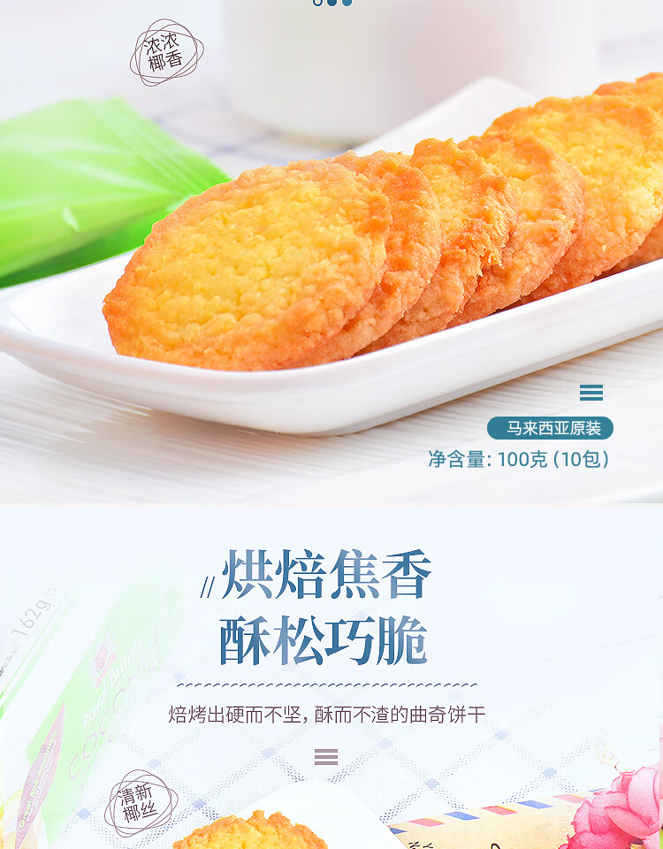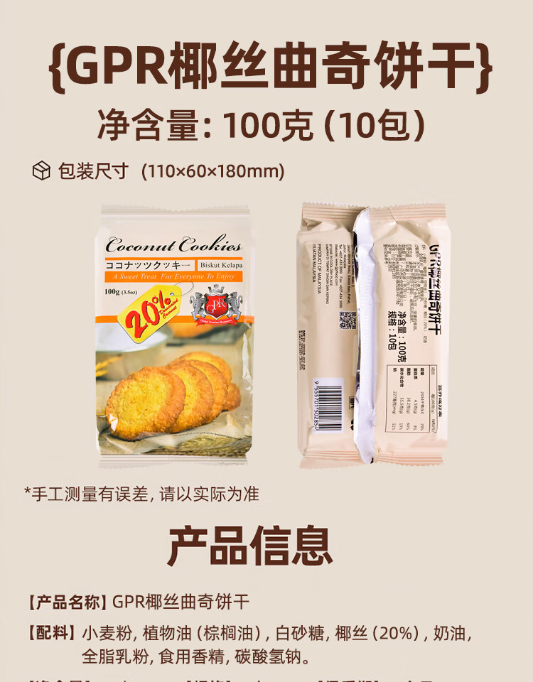 GPR椰丝曲奇饼干100g 10包 马来西亚进口休闲零食送礼独立小包装