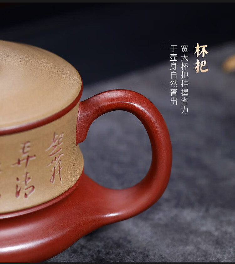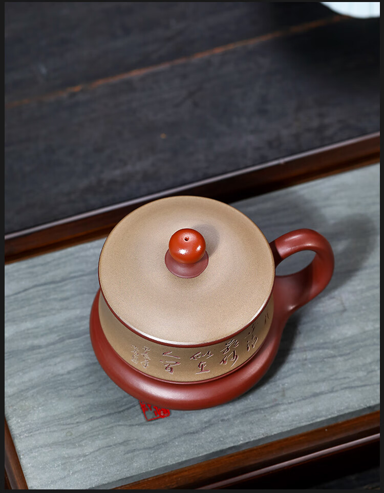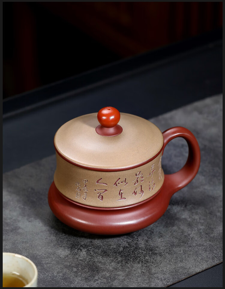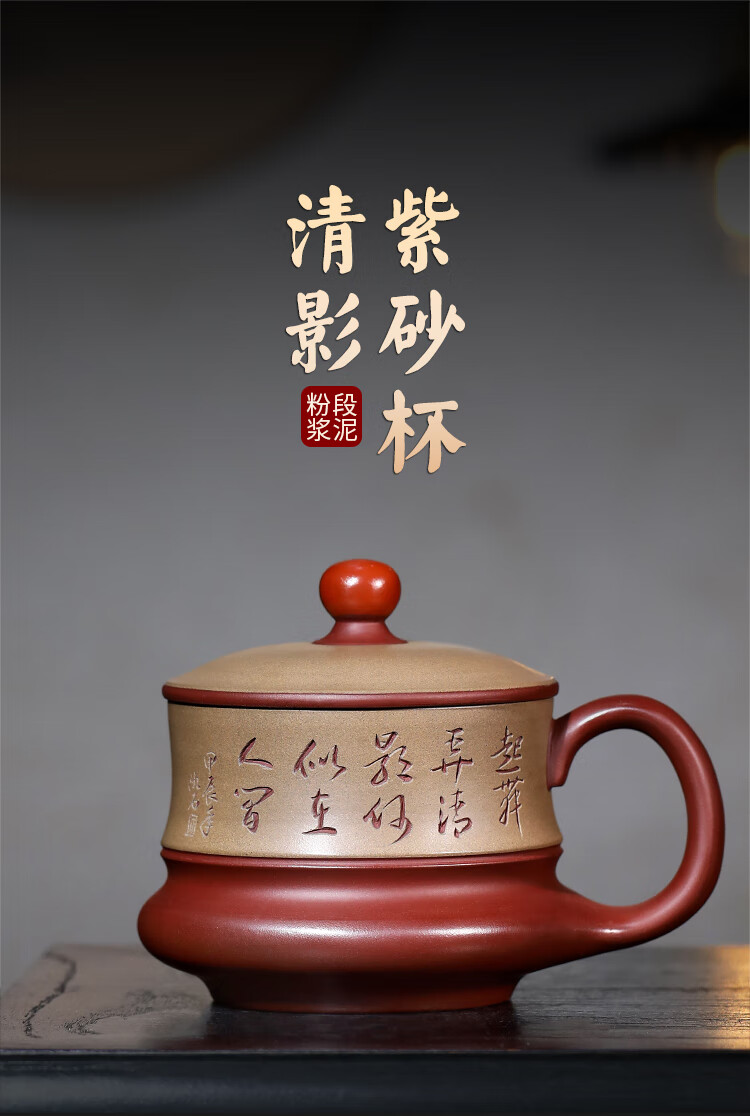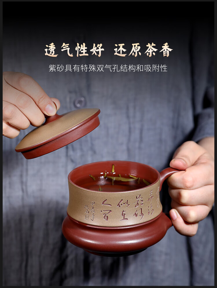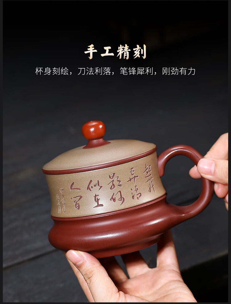 千寿堂紫砂杯宜兴原矿紫泥手工茶杯段泥粉浆手工刻字礼盒送礼清影紫砂杯