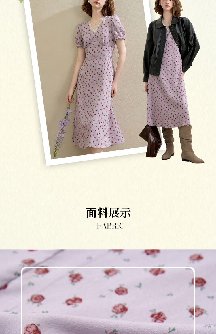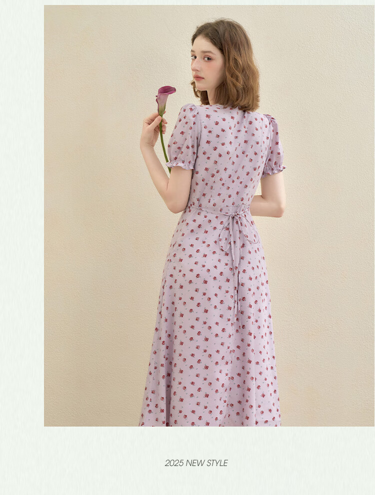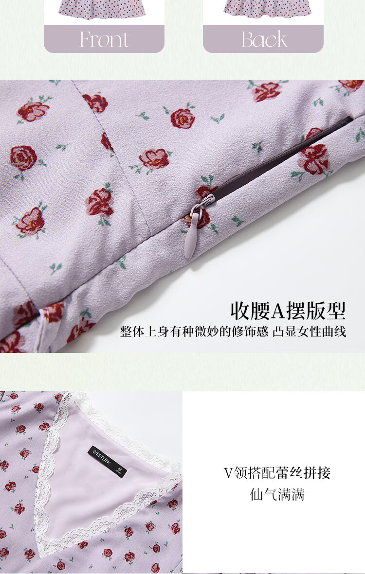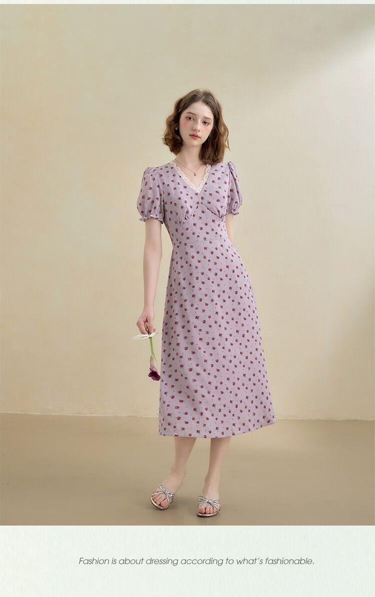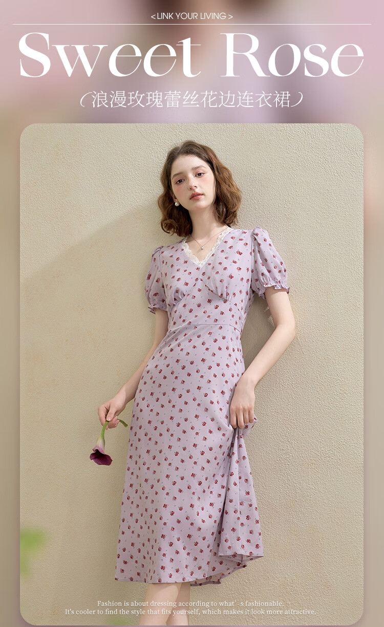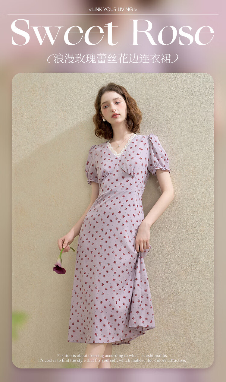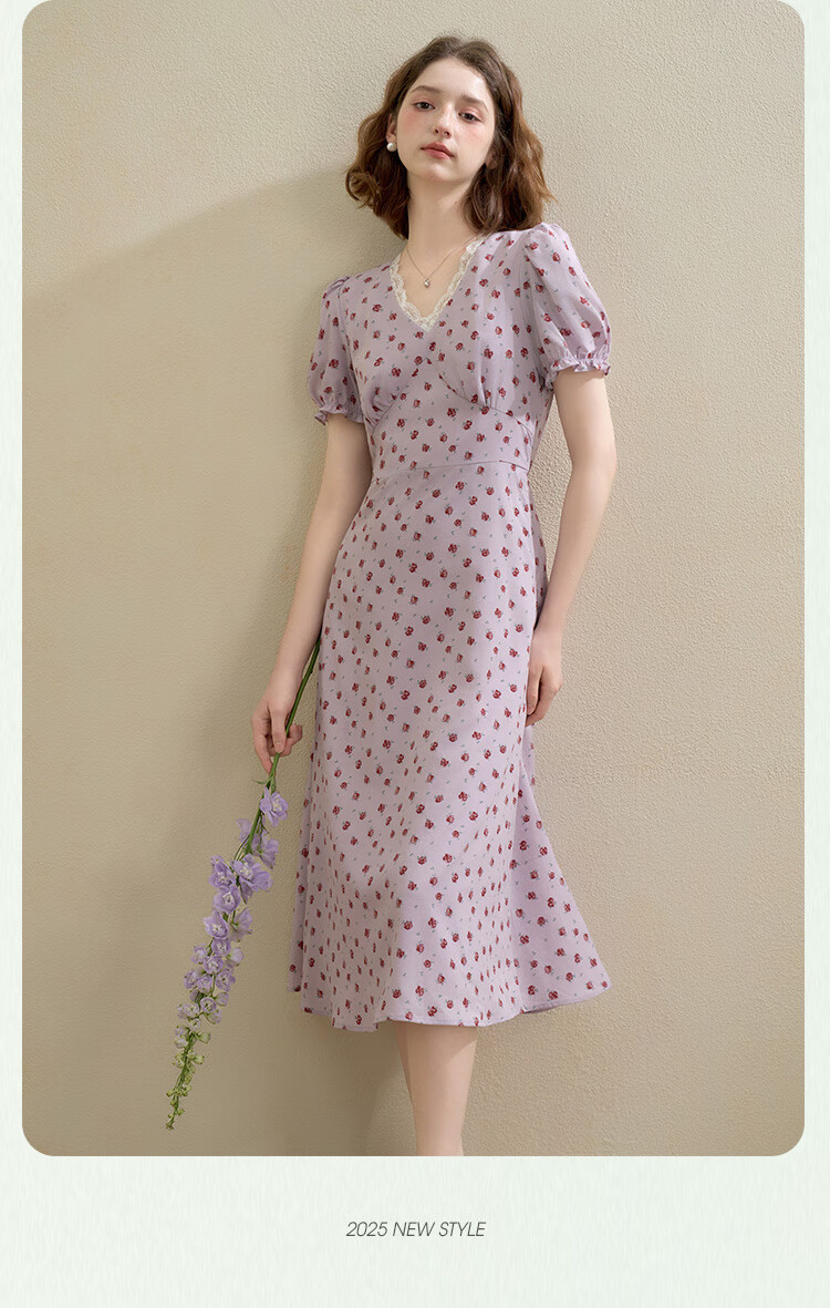 西遇浪漫玫瑰蕾丝花边V领碎花连衣裙女2025秋季新款收腰显瘦长裙七夕 紫色 XL (170)