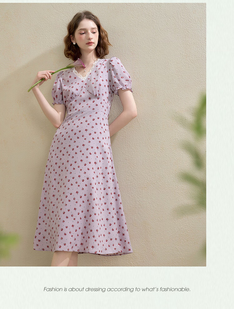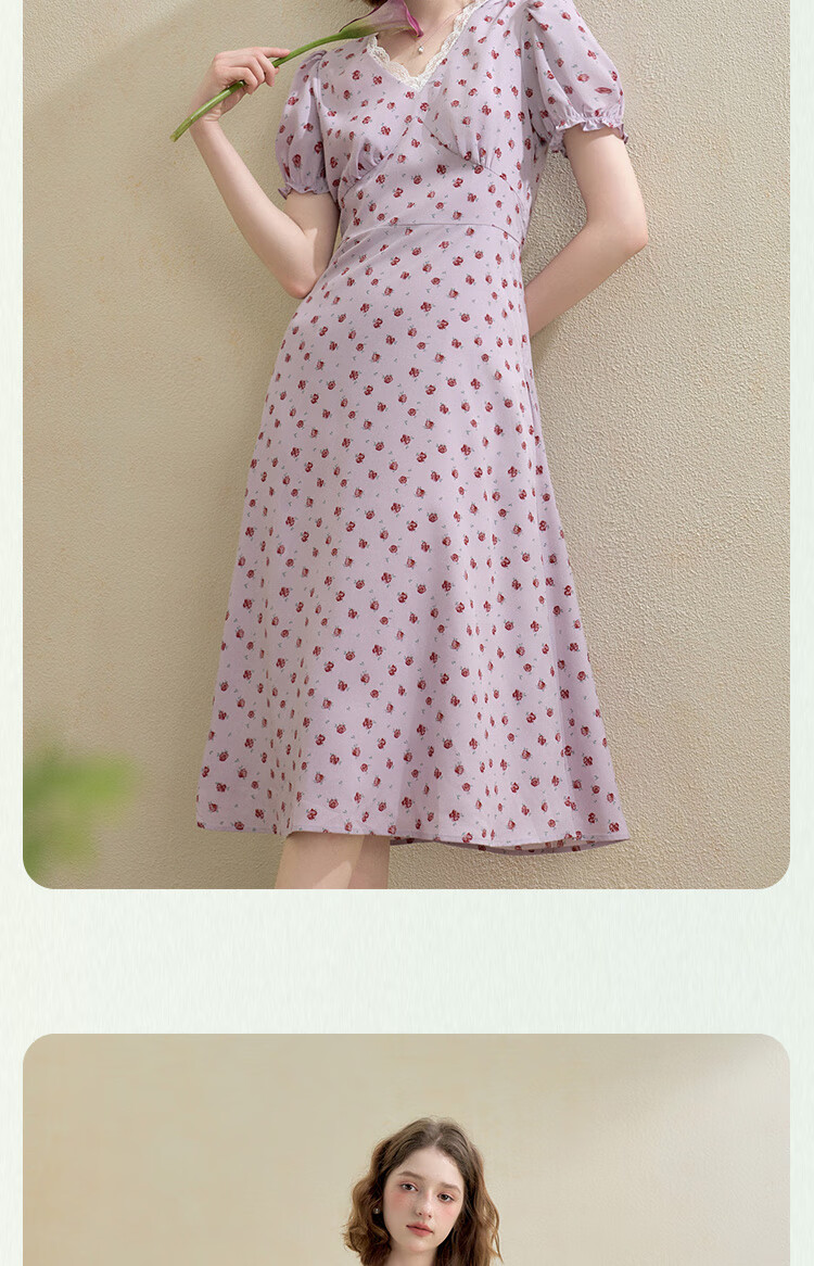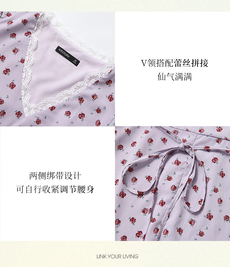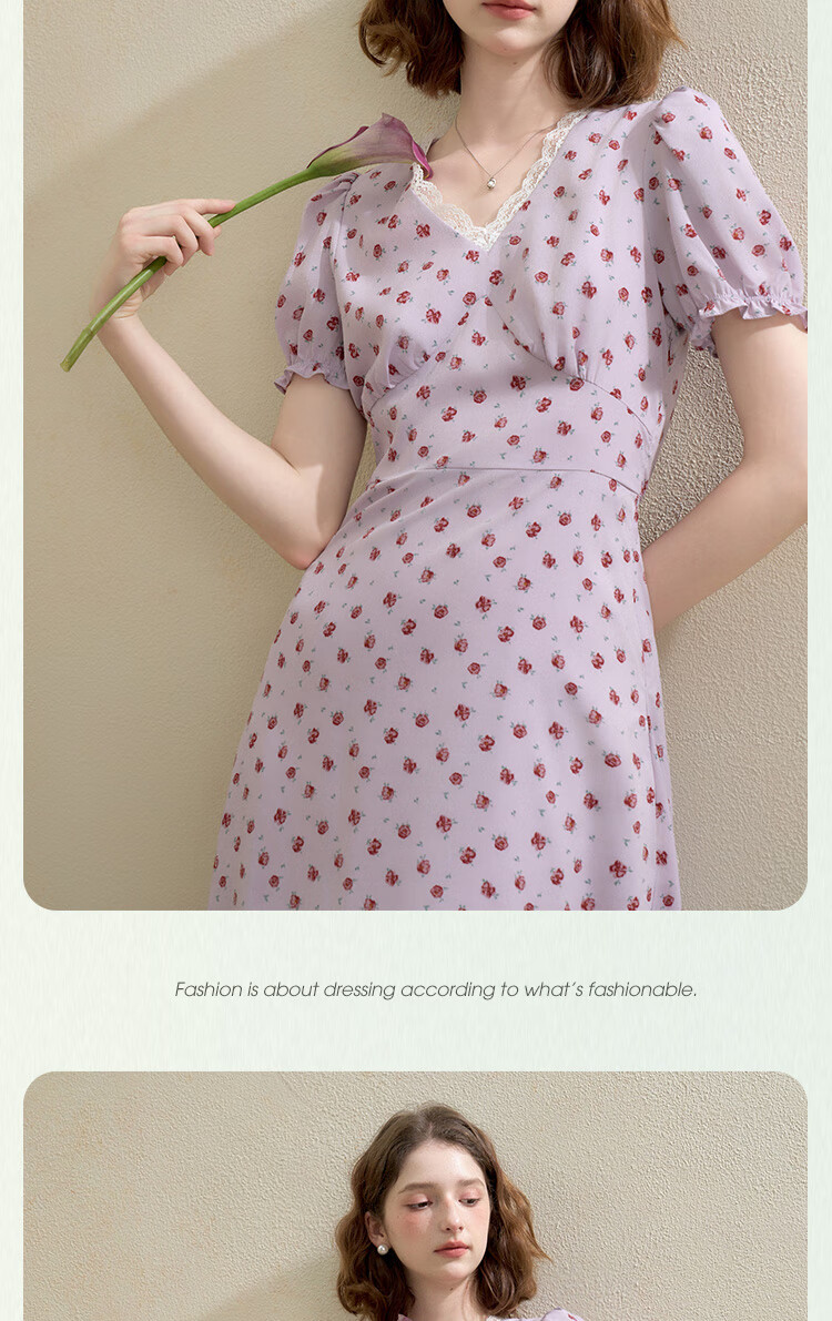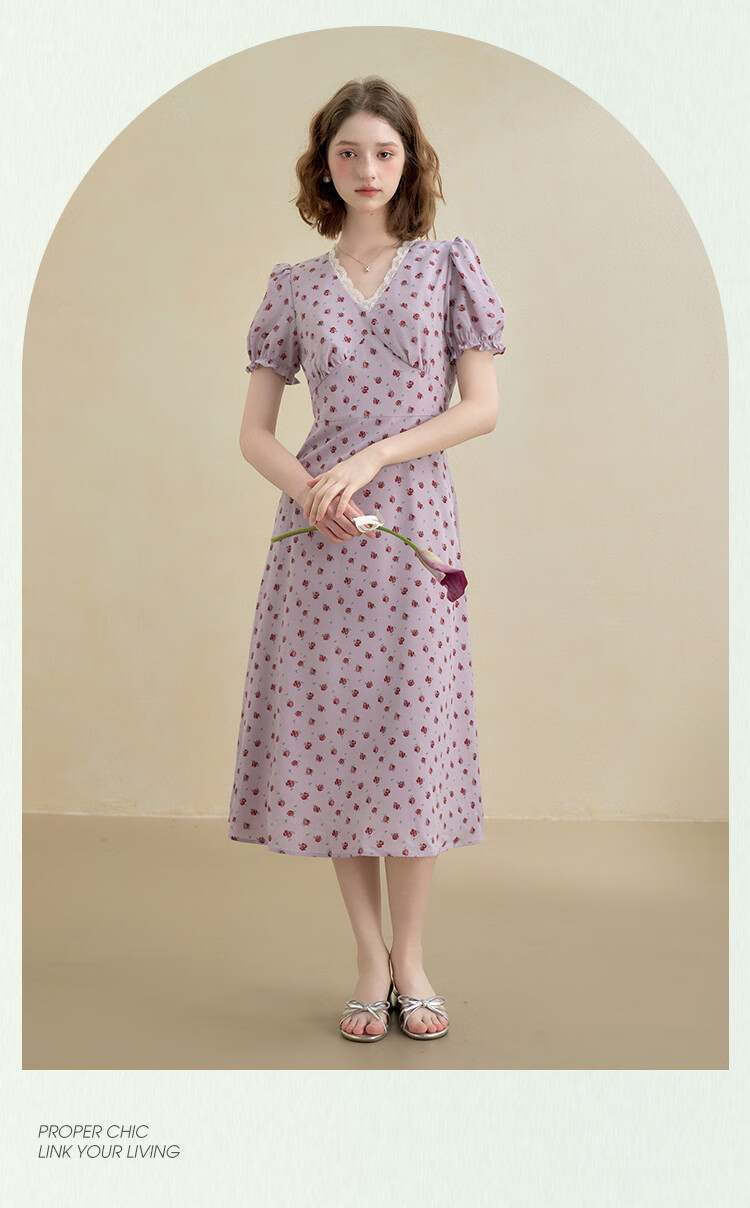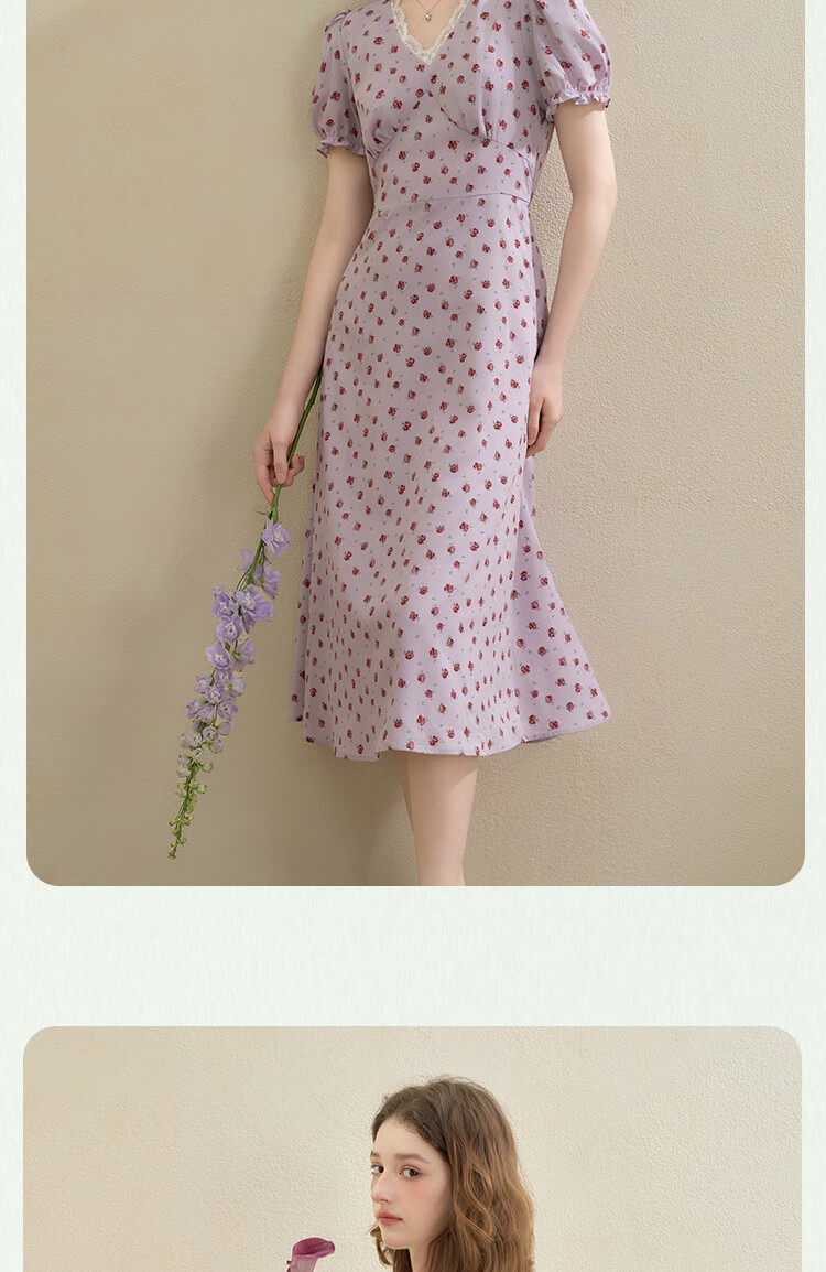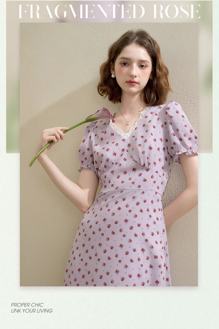 西遇浪漫玫瑰蕾丝花边V领碎花连衣裙女2025秋季新款收腰显瘦长裙七夕 紫色 XL (170)