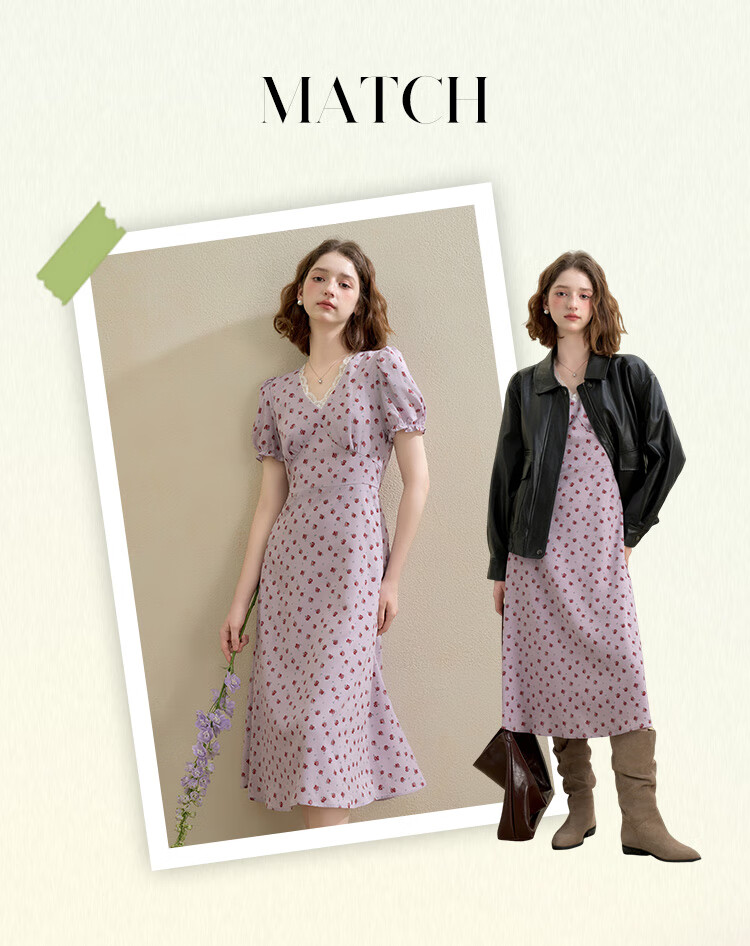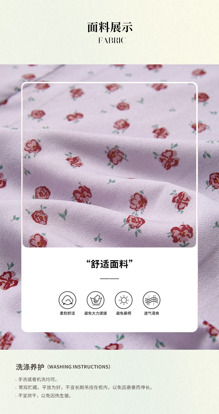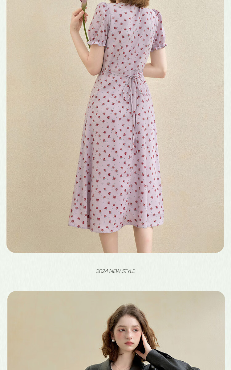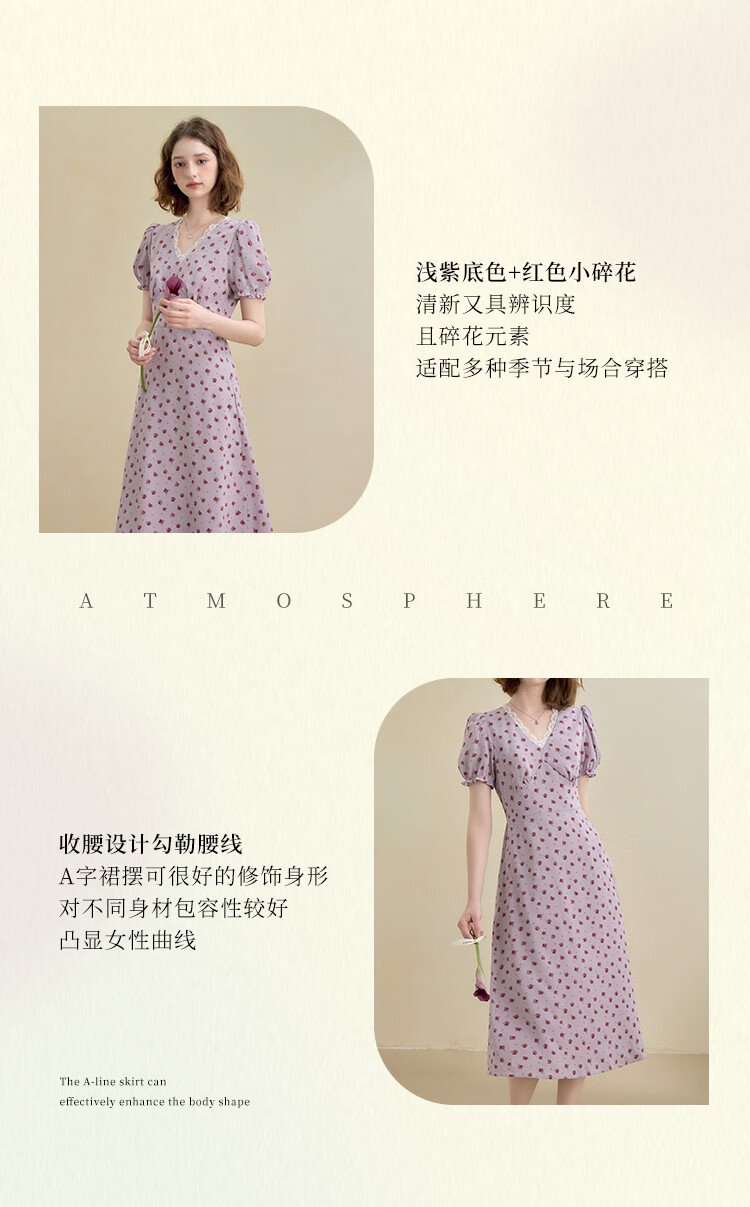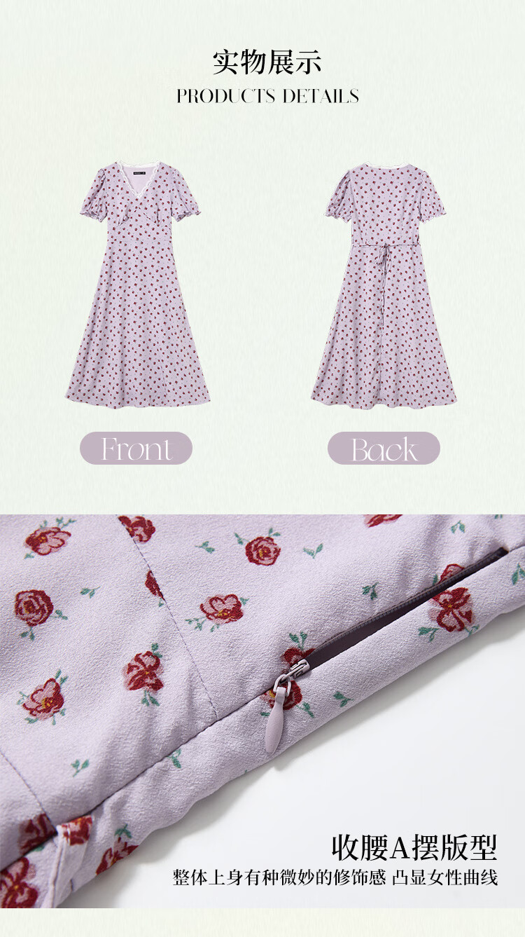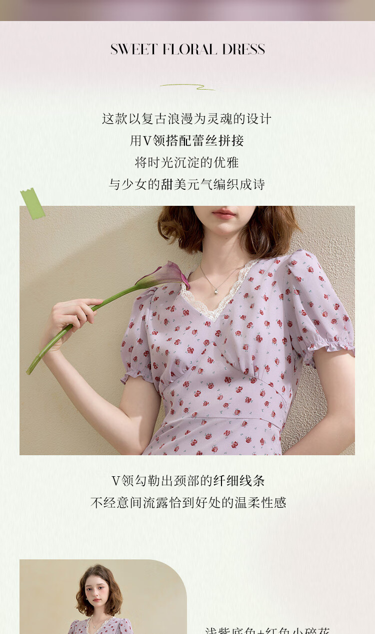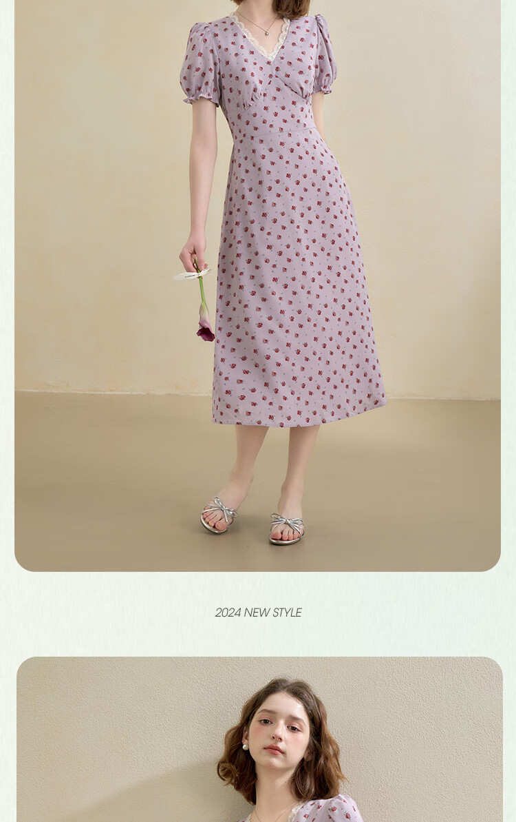 西遇浪漫玫瑰蕾丝花边V领碎花连衣裙女2025秋季新款收腰显瘦长裙七夕 紫色 XL (170)