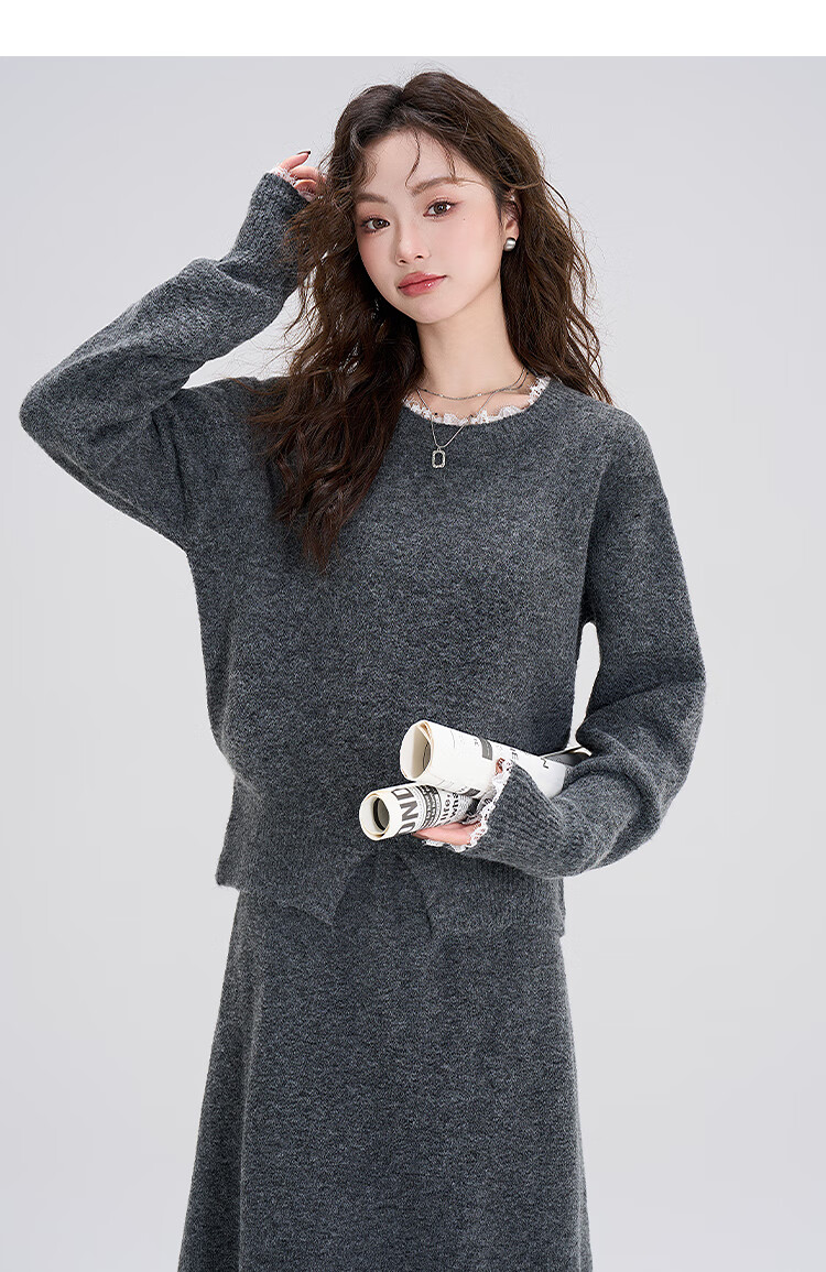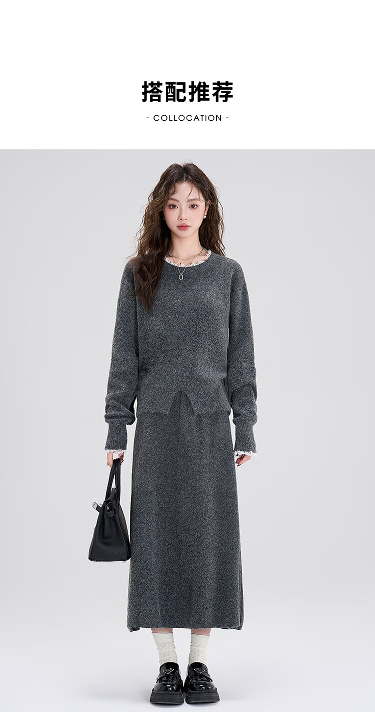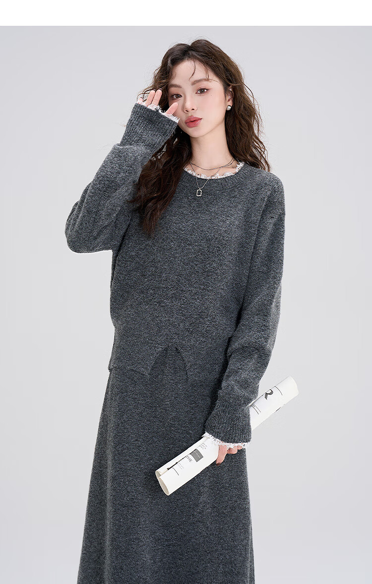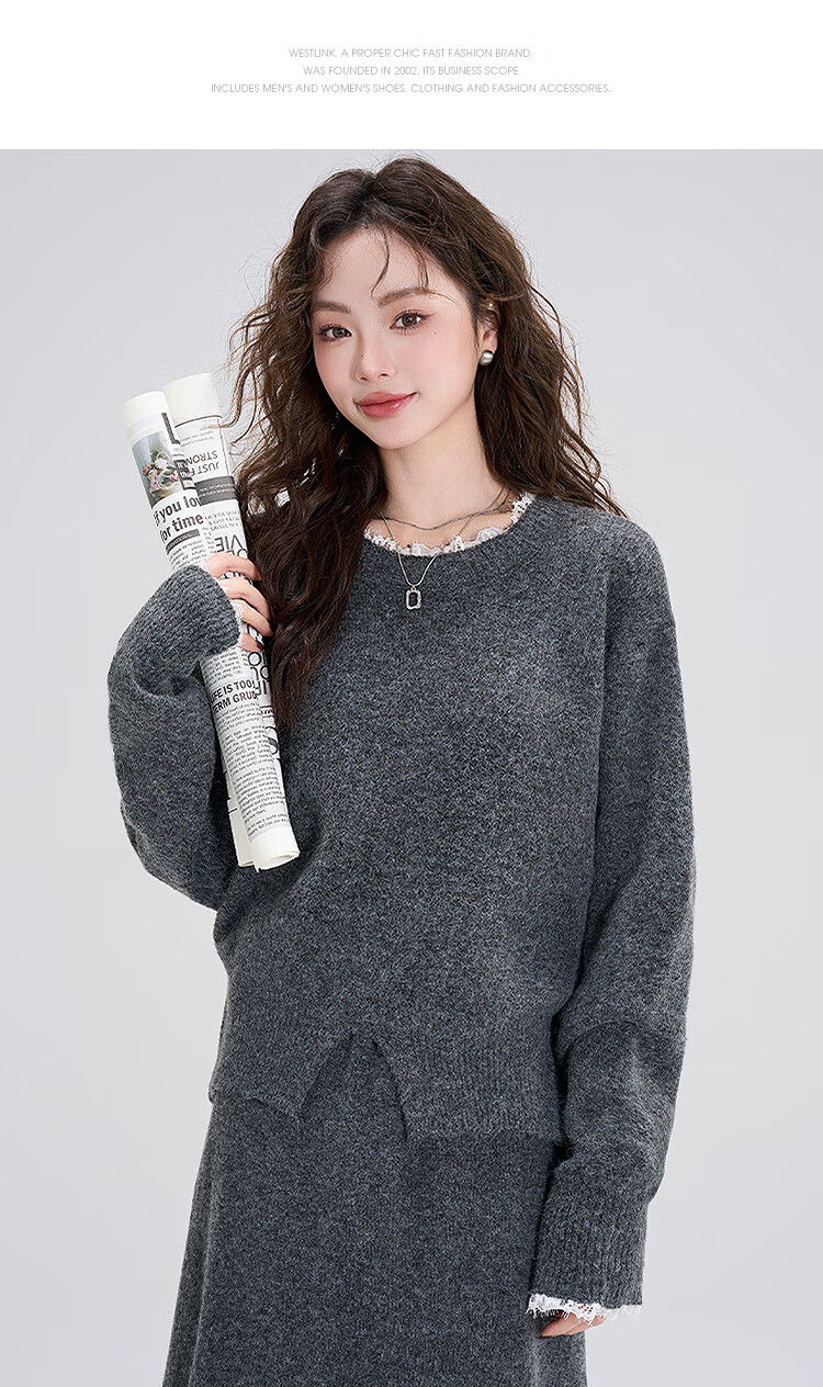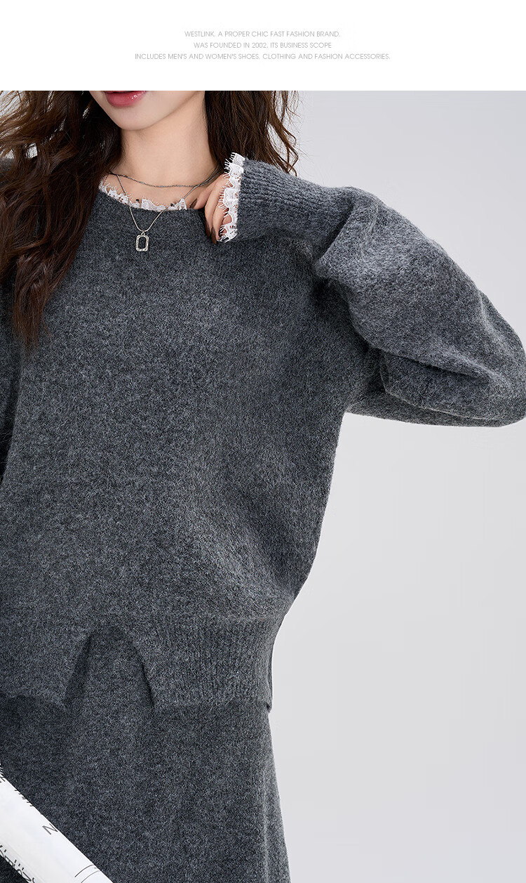 西遇(Westlink)针织半身裙子套装女2025年秋季新款蕾丝圆领宽松毛衣两件套 浅灰色 (预售15天) M (160)