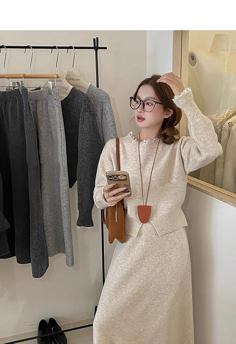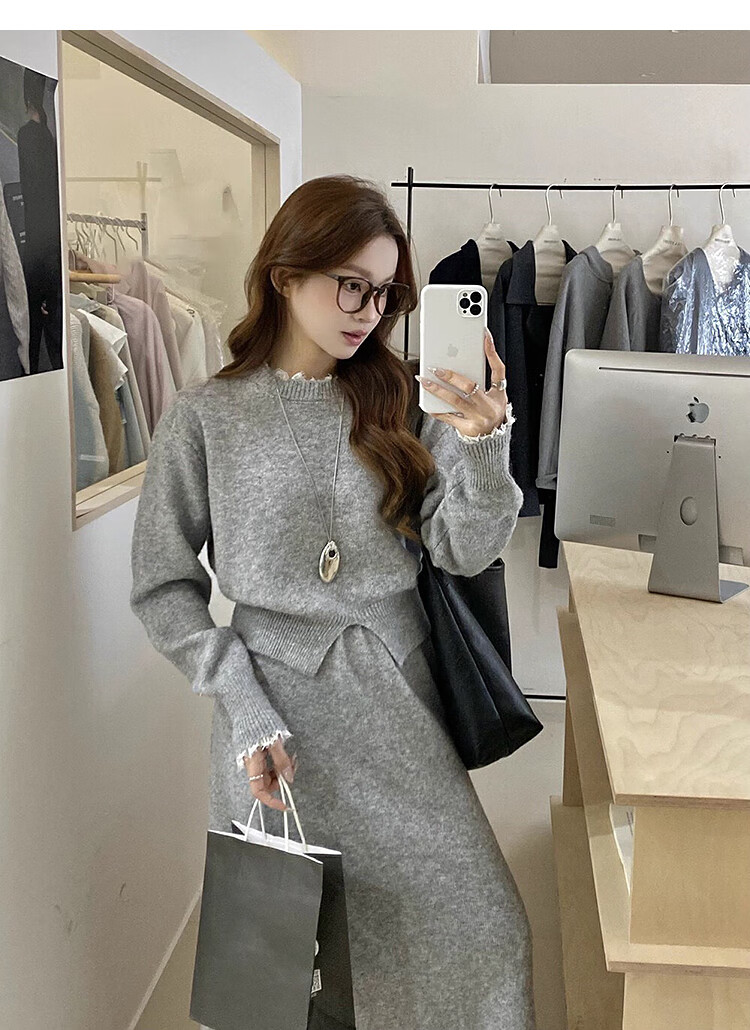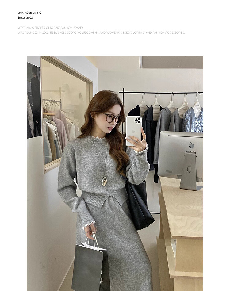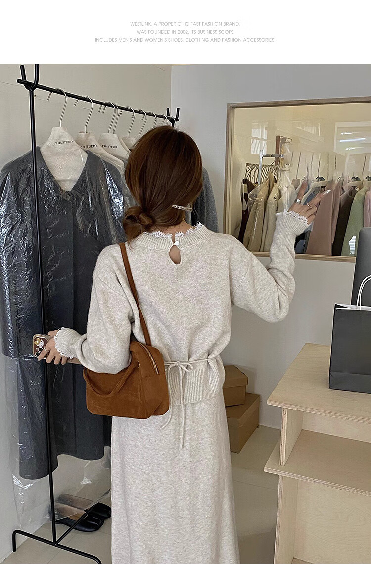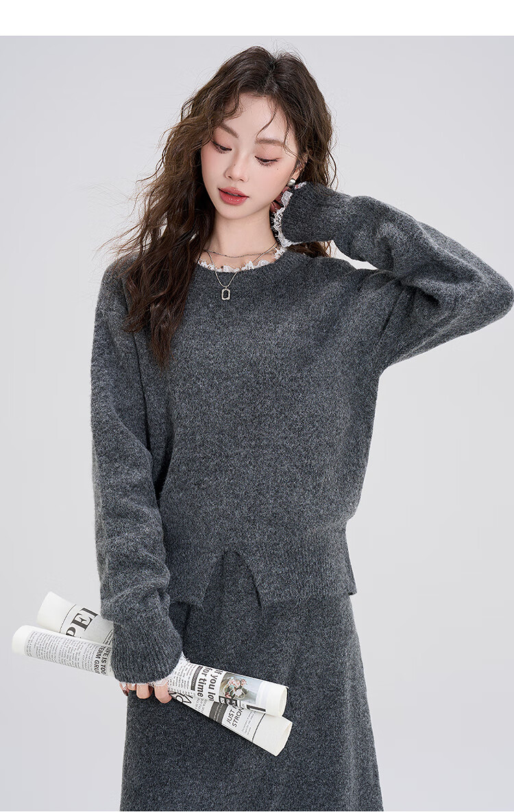 西遇(Westlink)针织半身裙子套装女2025年秋季新款蕾丝圆领宽松毛衣两件套 浅灰色 (预售15天) M (160)