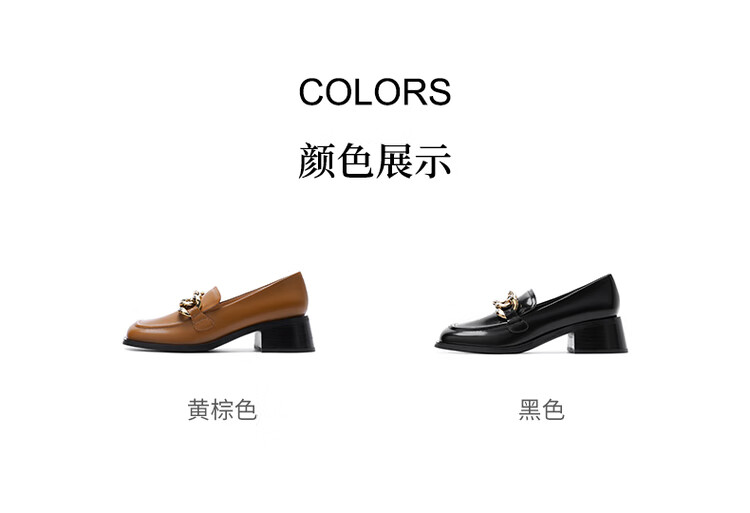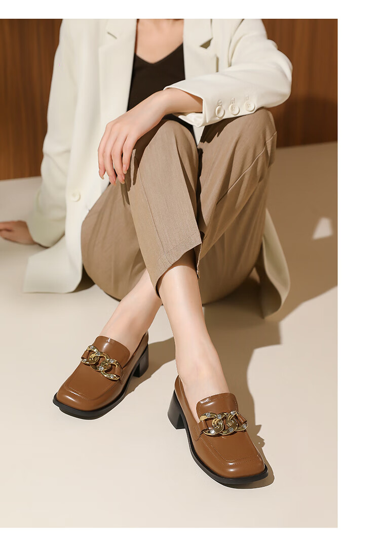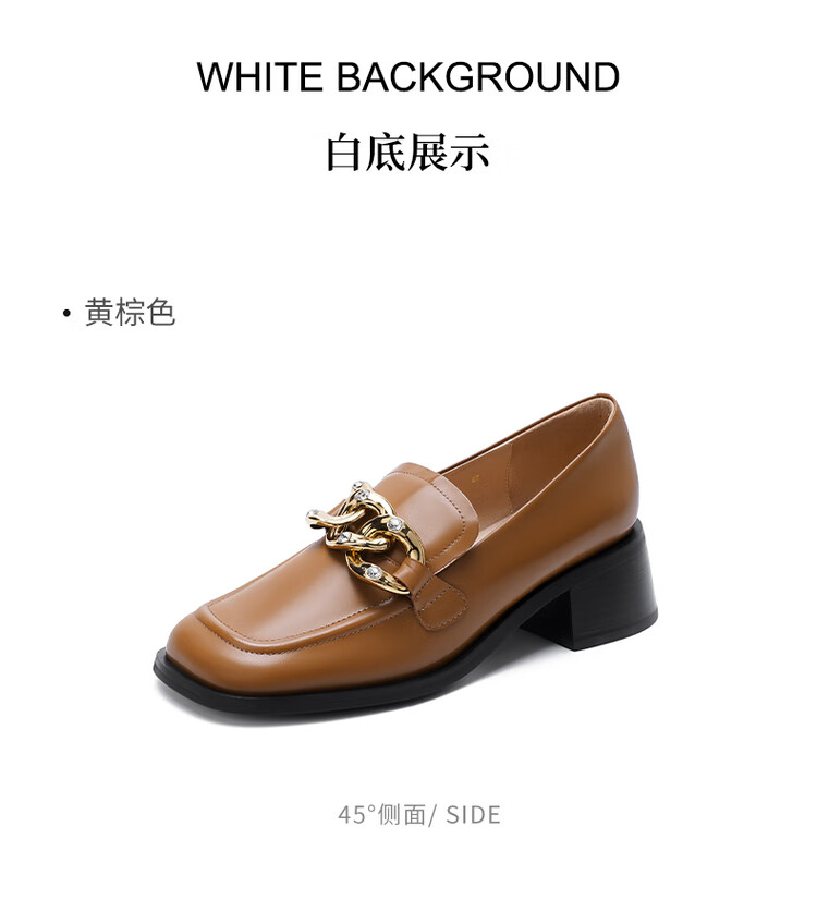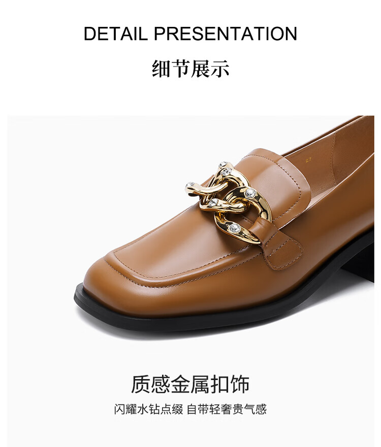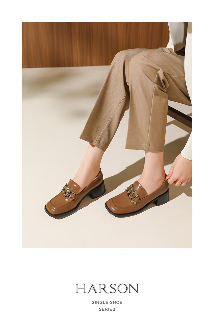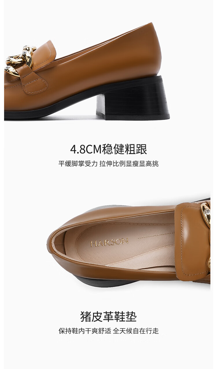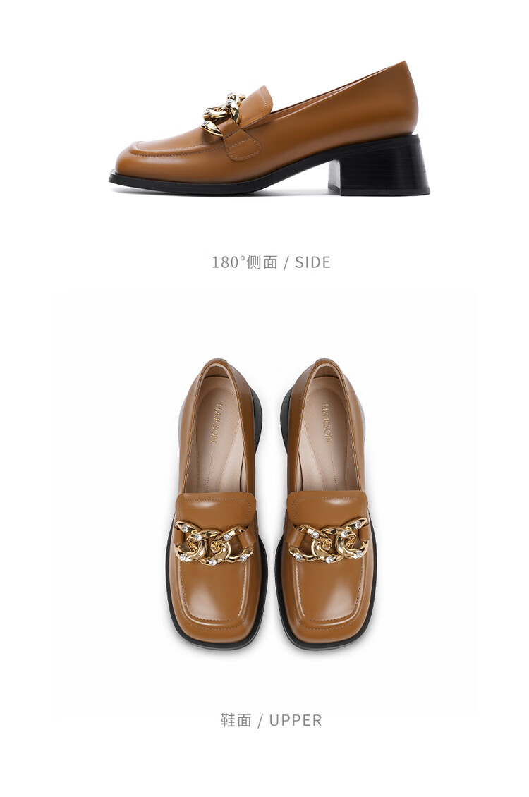 哈森法式复古乐福鞋2025新款休闲粗跟方头商务通勤饰扣女单鞋HL259018 黄棕色 34