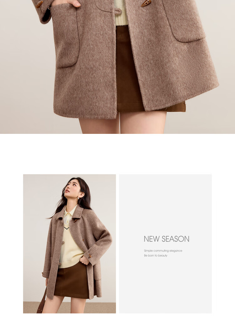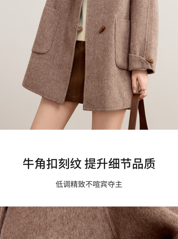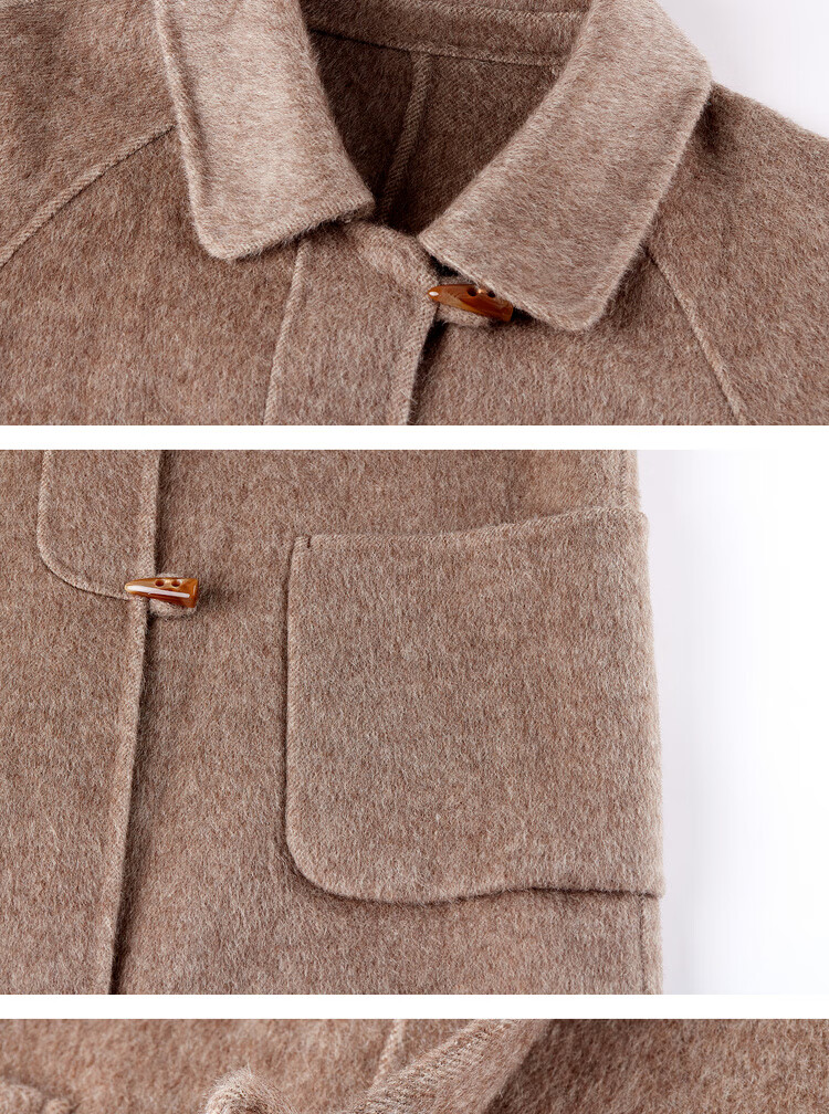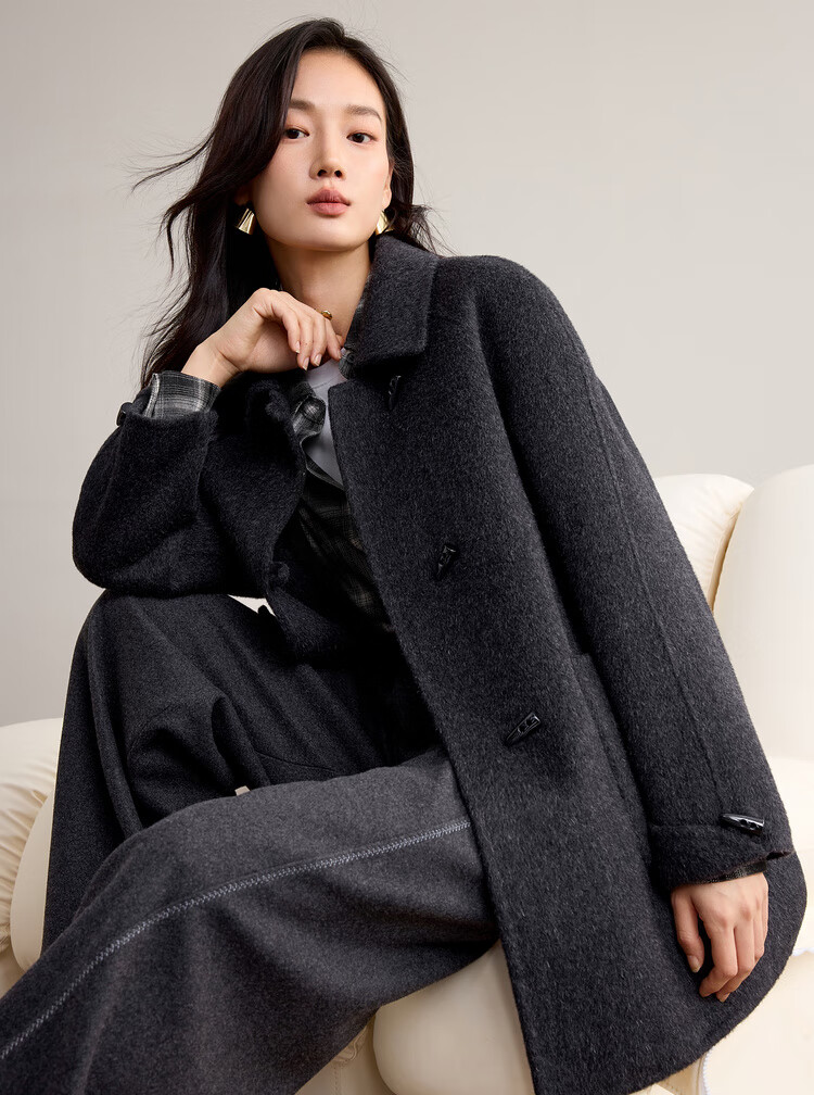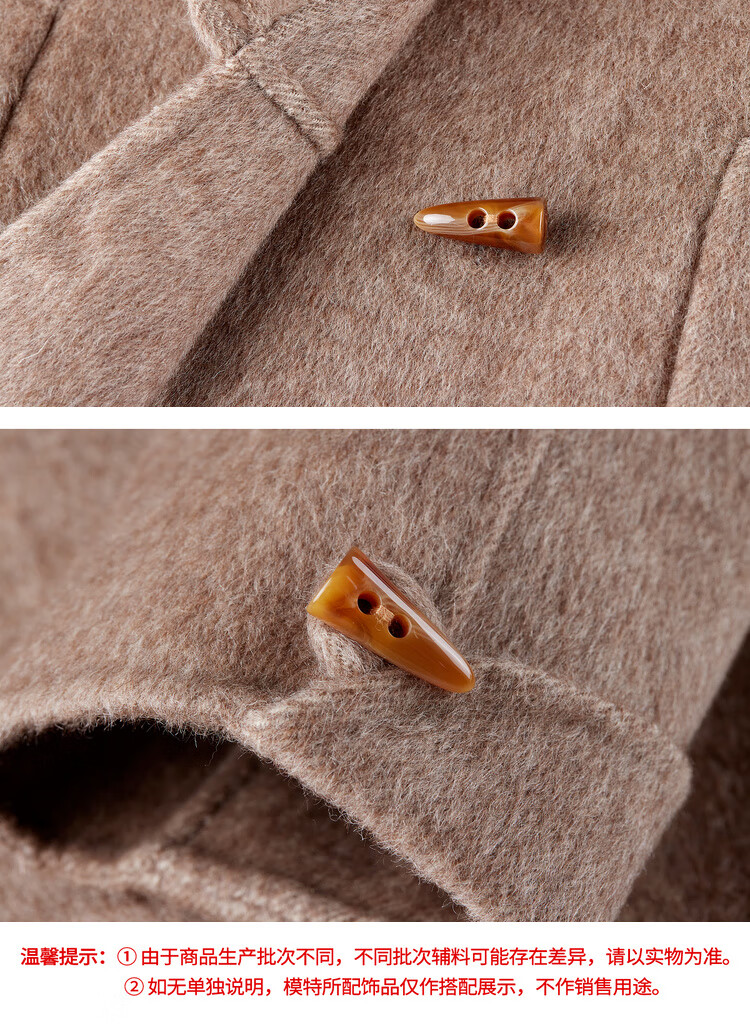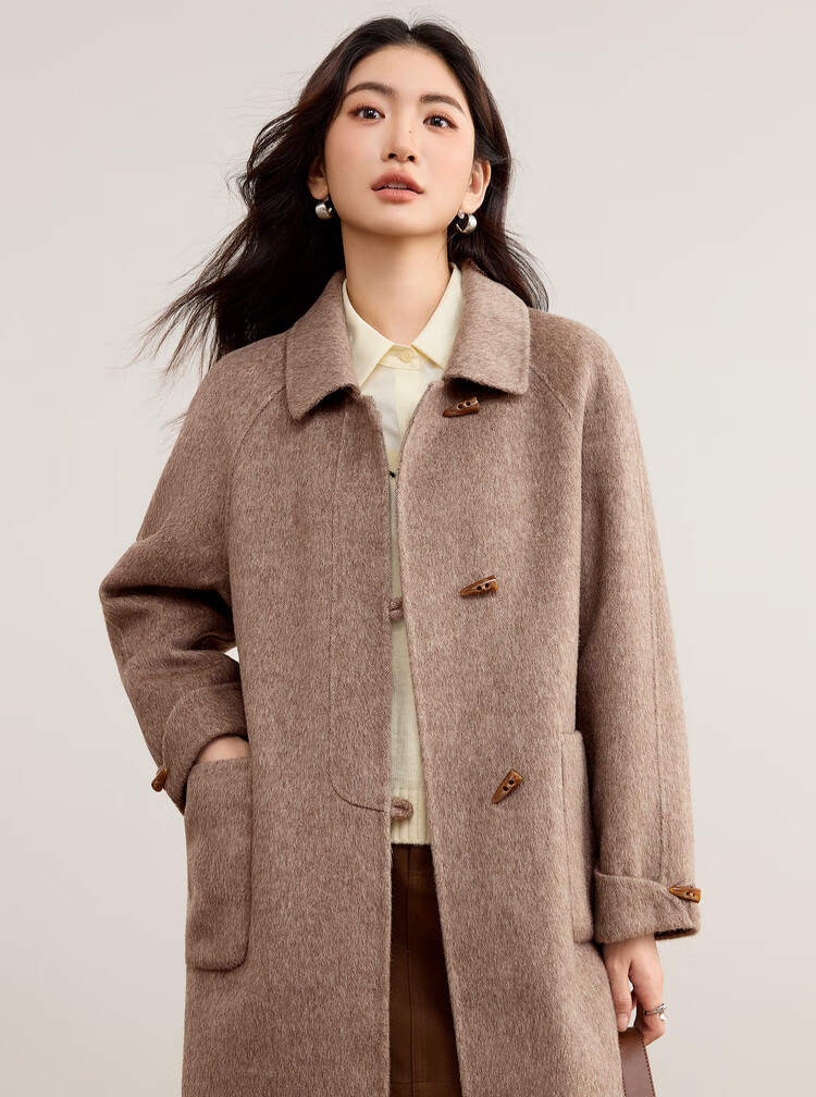 尚都比拉纯羊毛翻领毛呢大衣女冬季牛角扣长袖双面呢外套中长款宽松大衣