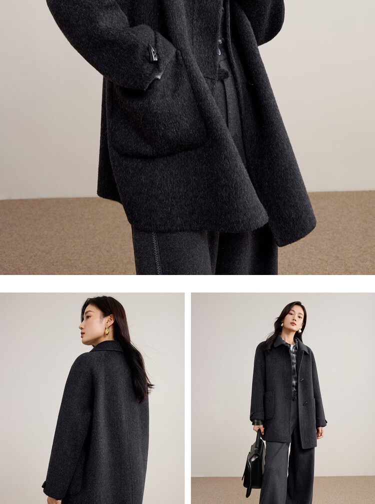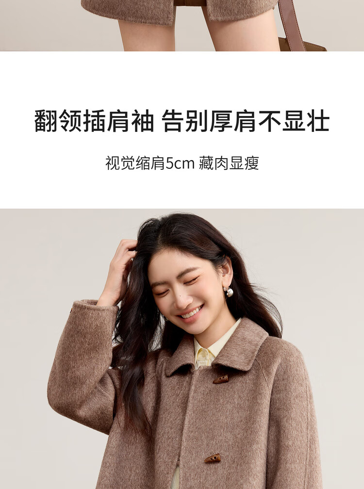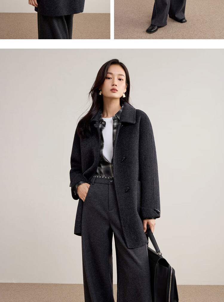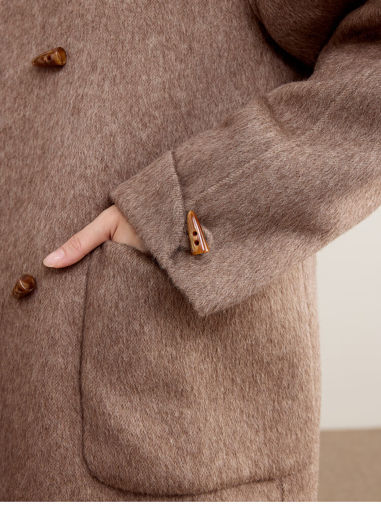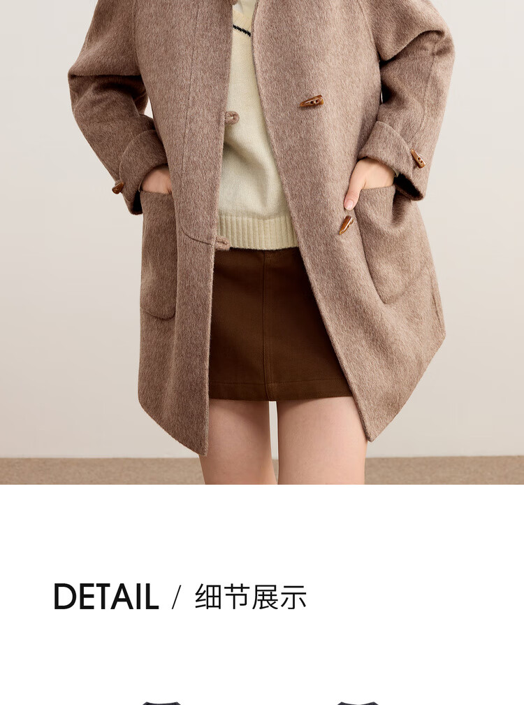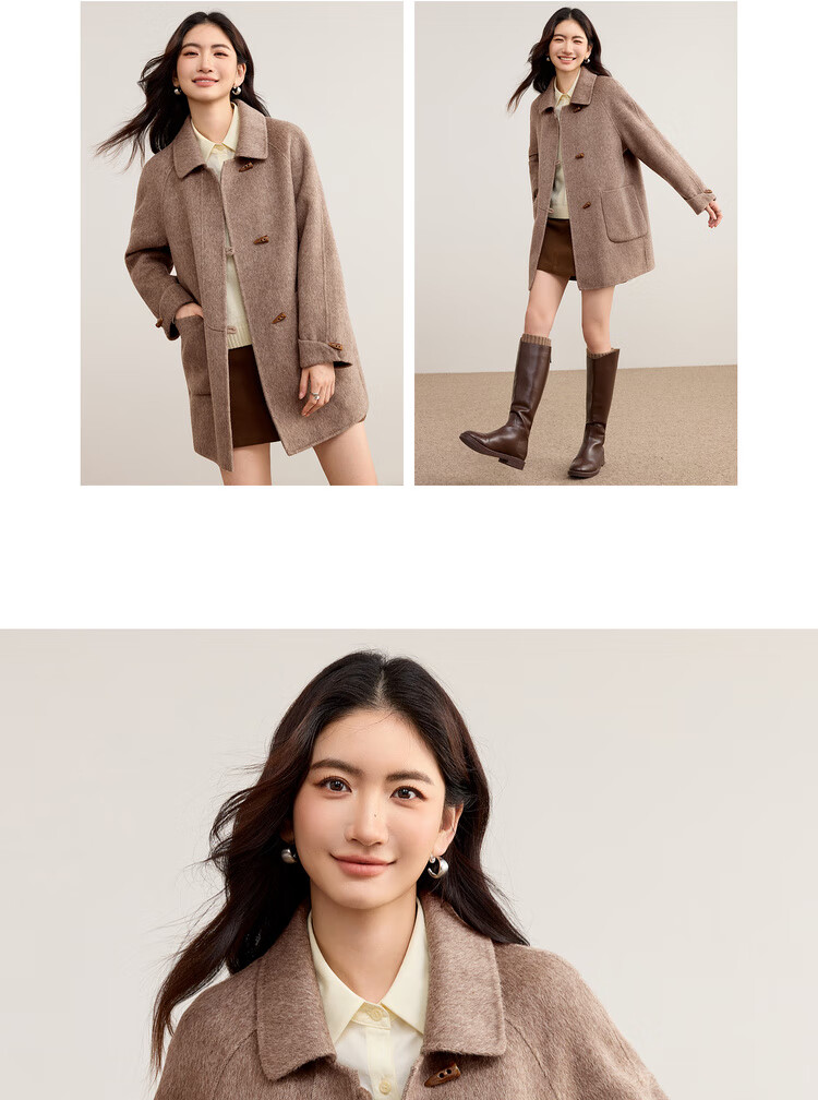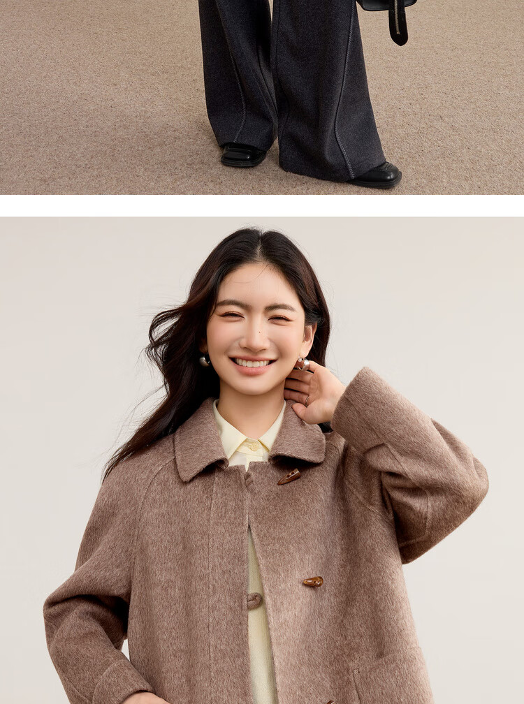 尚都比拉纯羊毛翻领毛呢大衣女冬季牛角扣长袖双面呢外套中长款宽松大衣