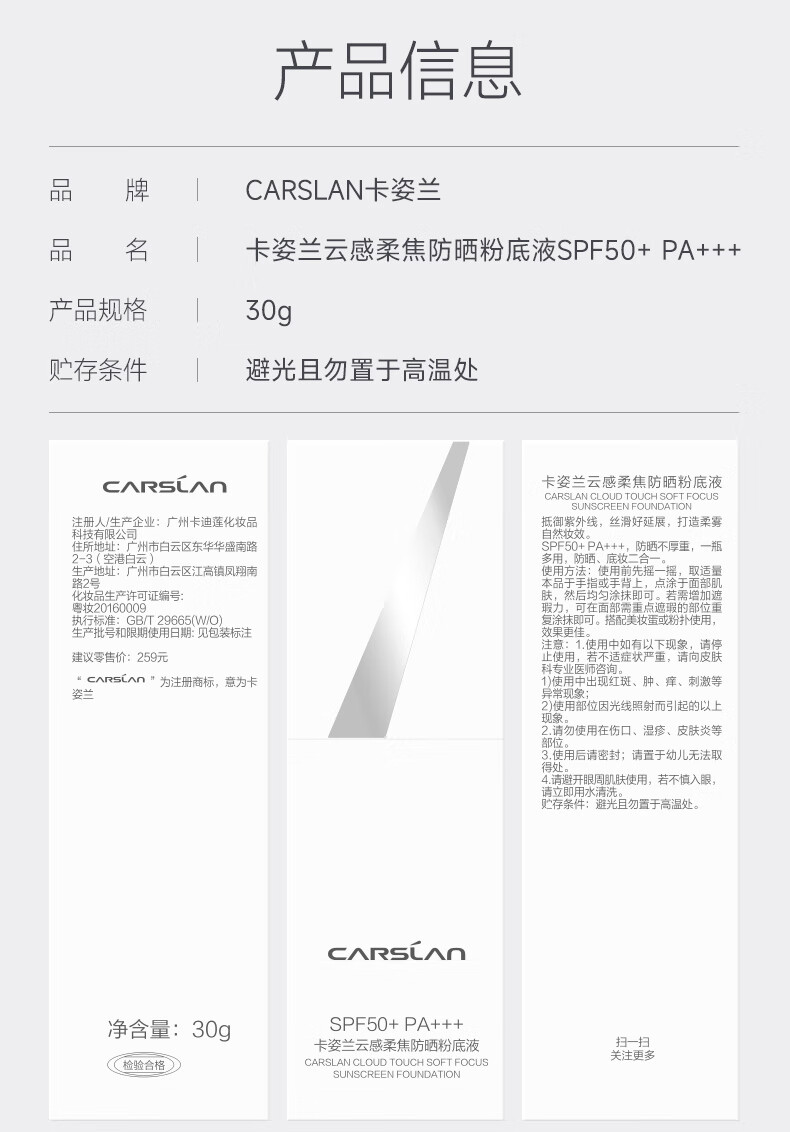 卡姿兰(Carslan)白磁粉底液防晒spf50+云感柔焦遮瑕持久不易脱妆持妆防水防汗防蹭 01瓷白色(冷调白皙)
