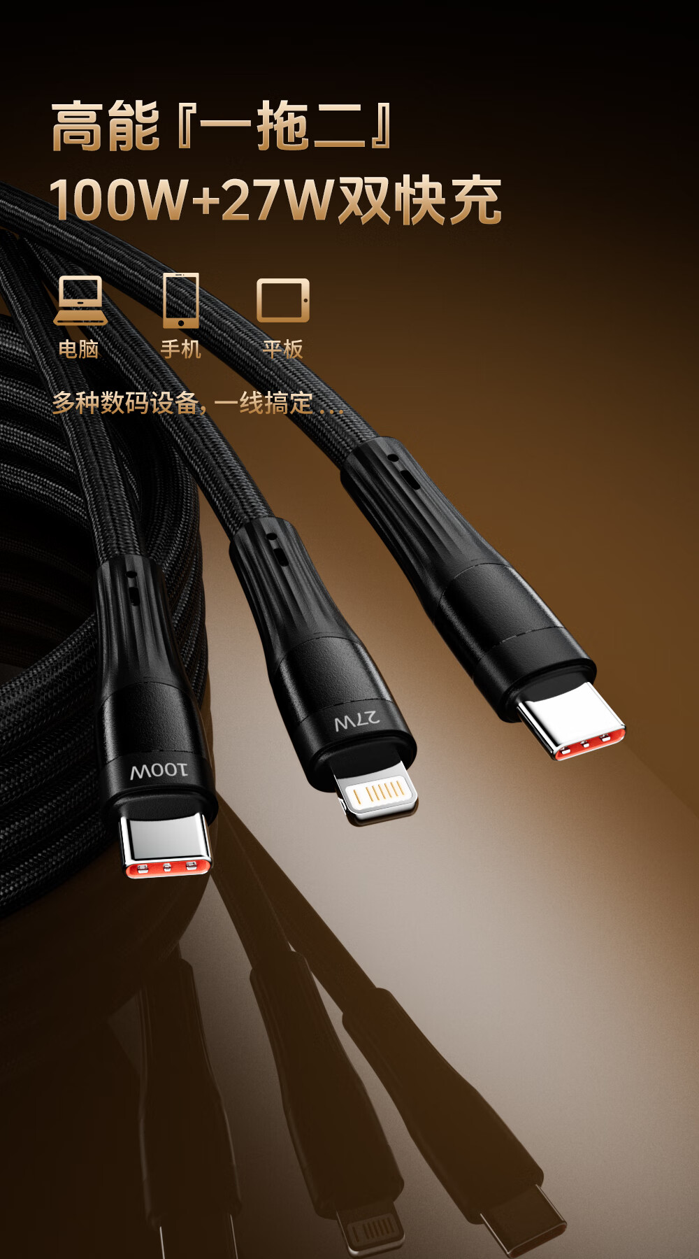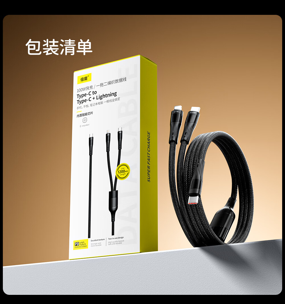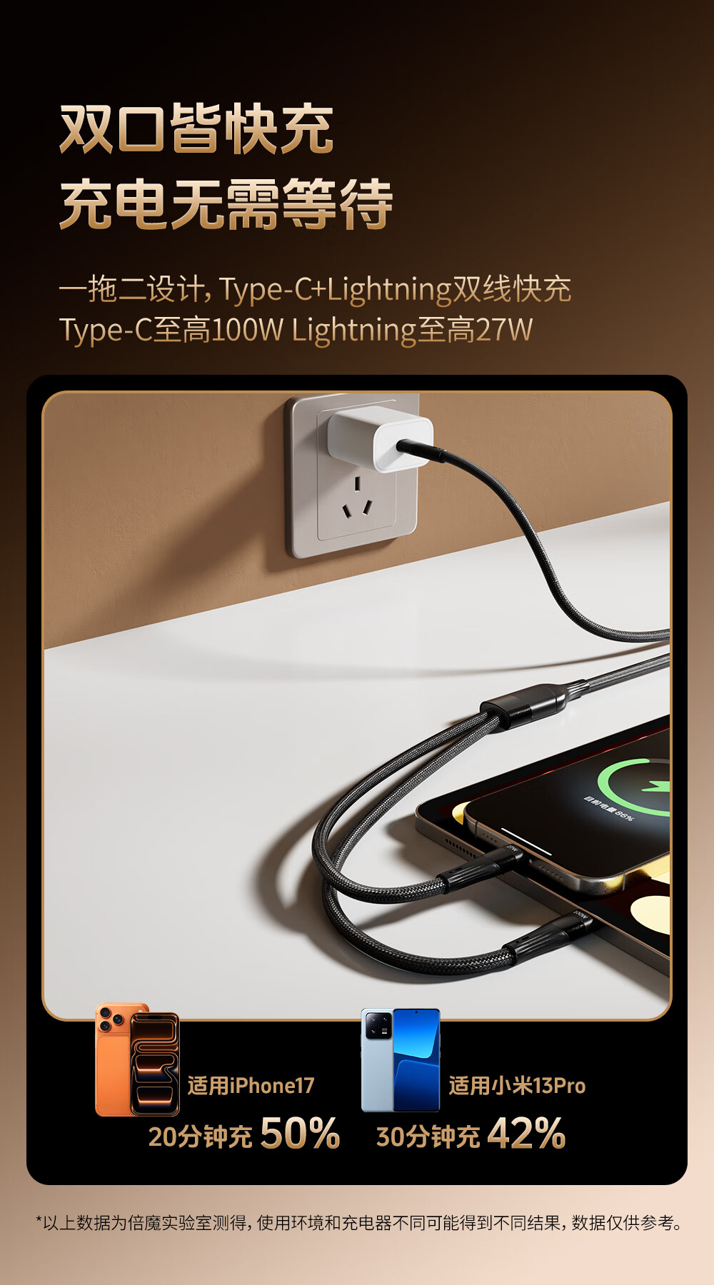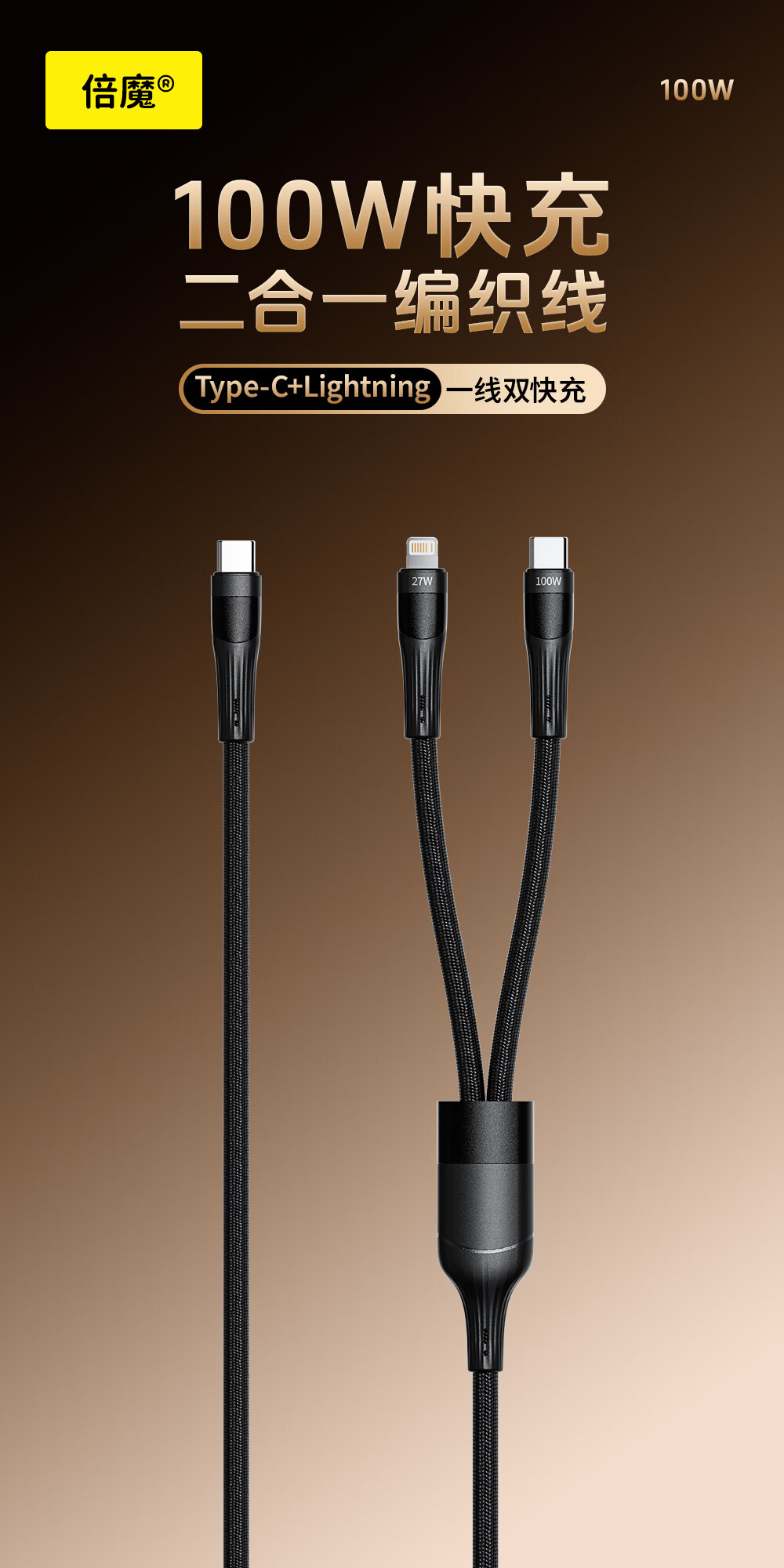 倍魔一拖二充电线100W快充Type-C数据线适用于iphone17华为小米手机 一拖二快充 黑色