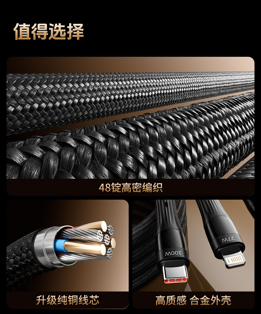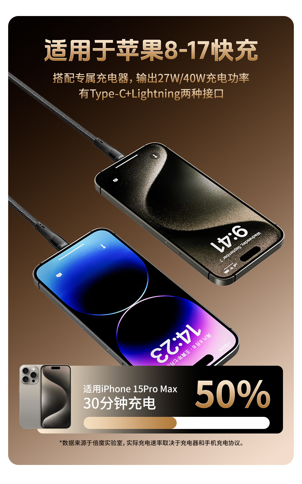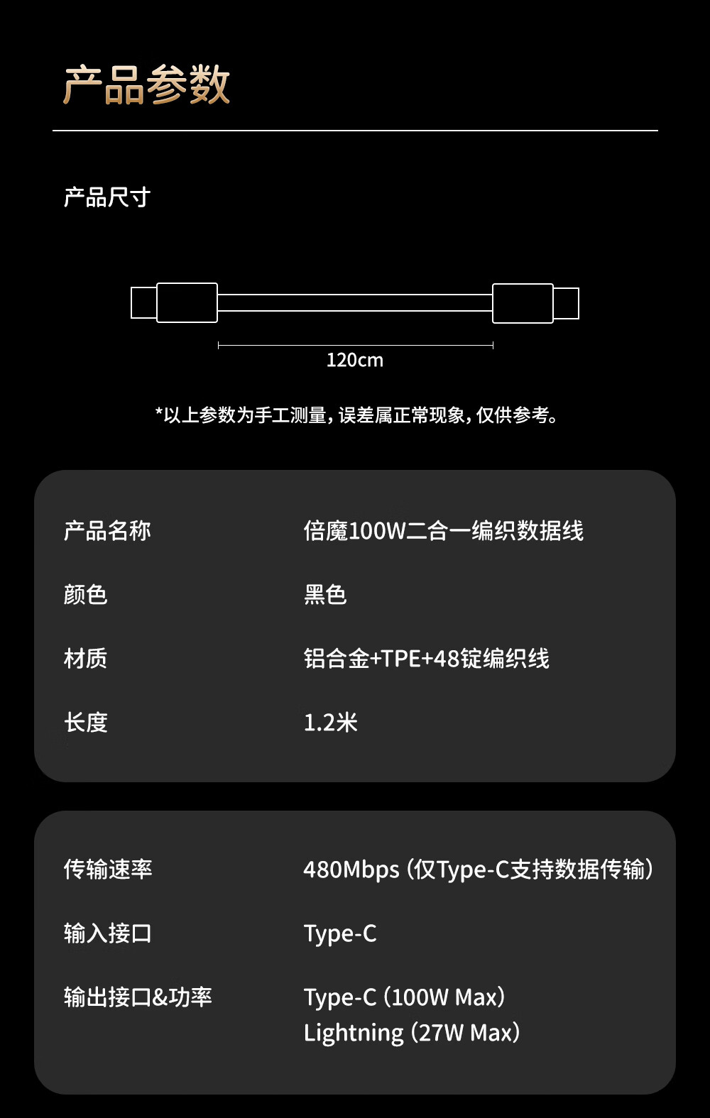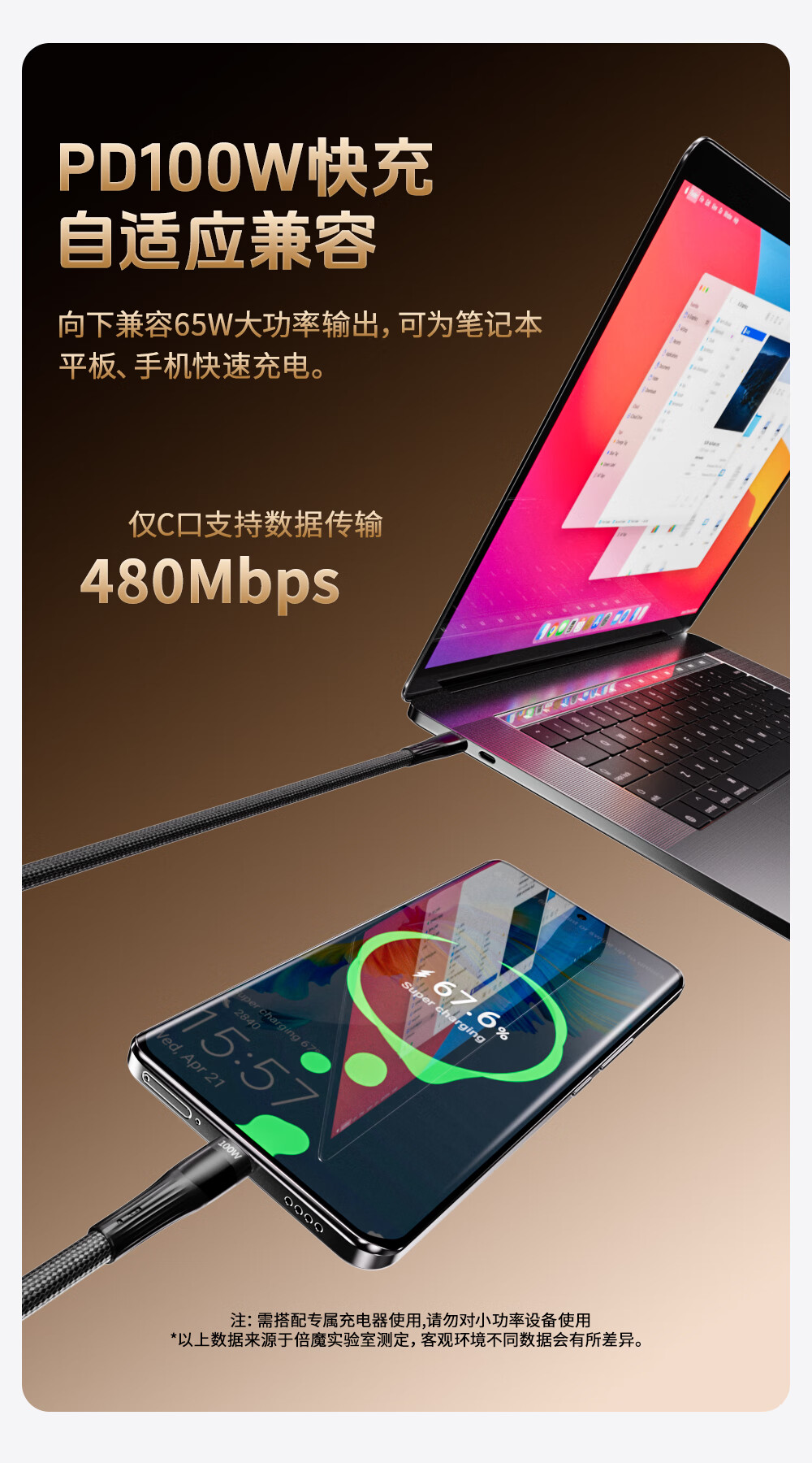 倍魔一拖二充电线100W快充Type-C数据线适用于iphone17华为小米手机 一拖二快充 黑色