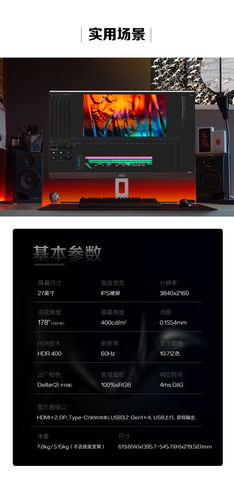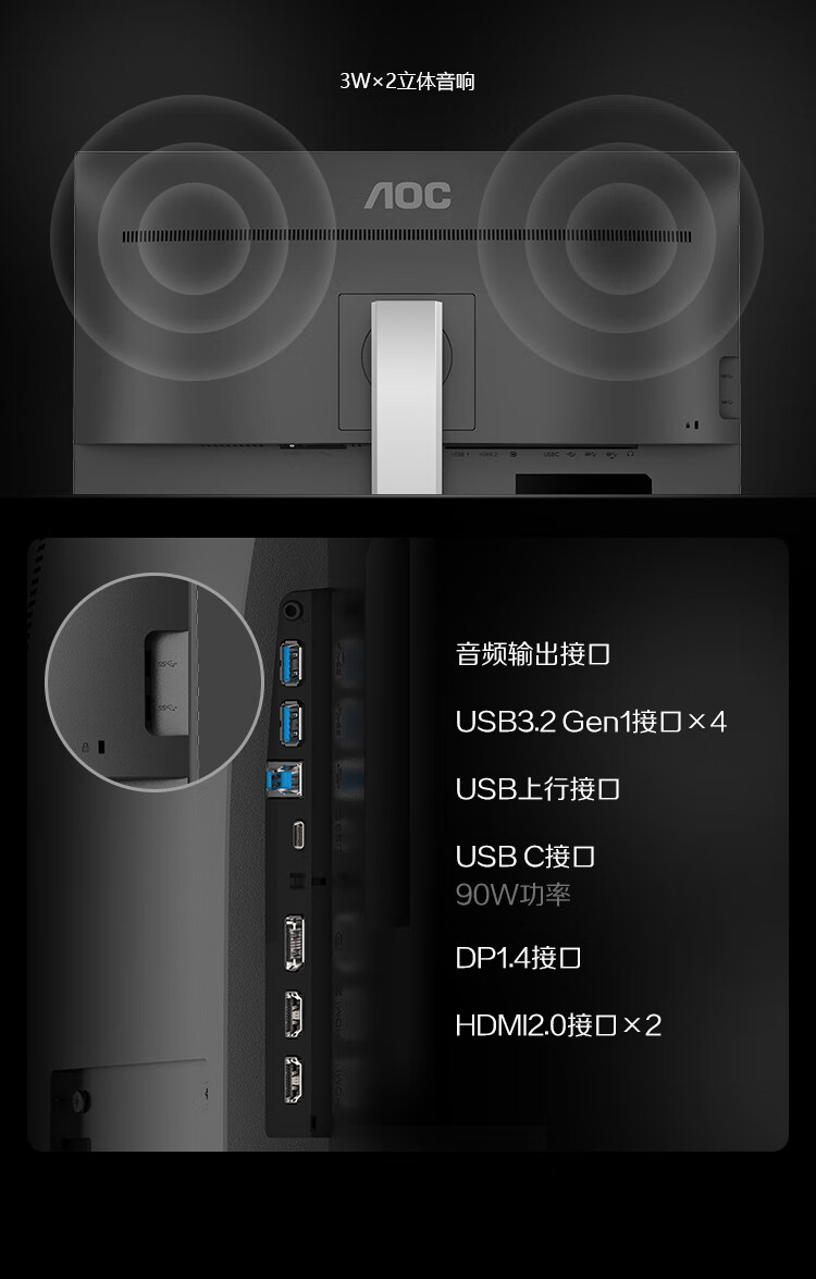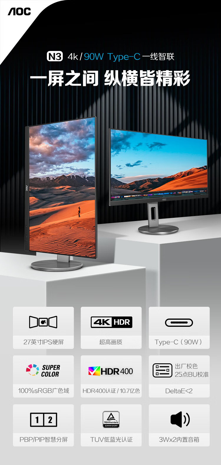 AOC 27英寸 4K IPS广色域 HDR400 Type-C90W 旋转升降 内置音箱 节能认证 办公电脑显示器 U27N3R