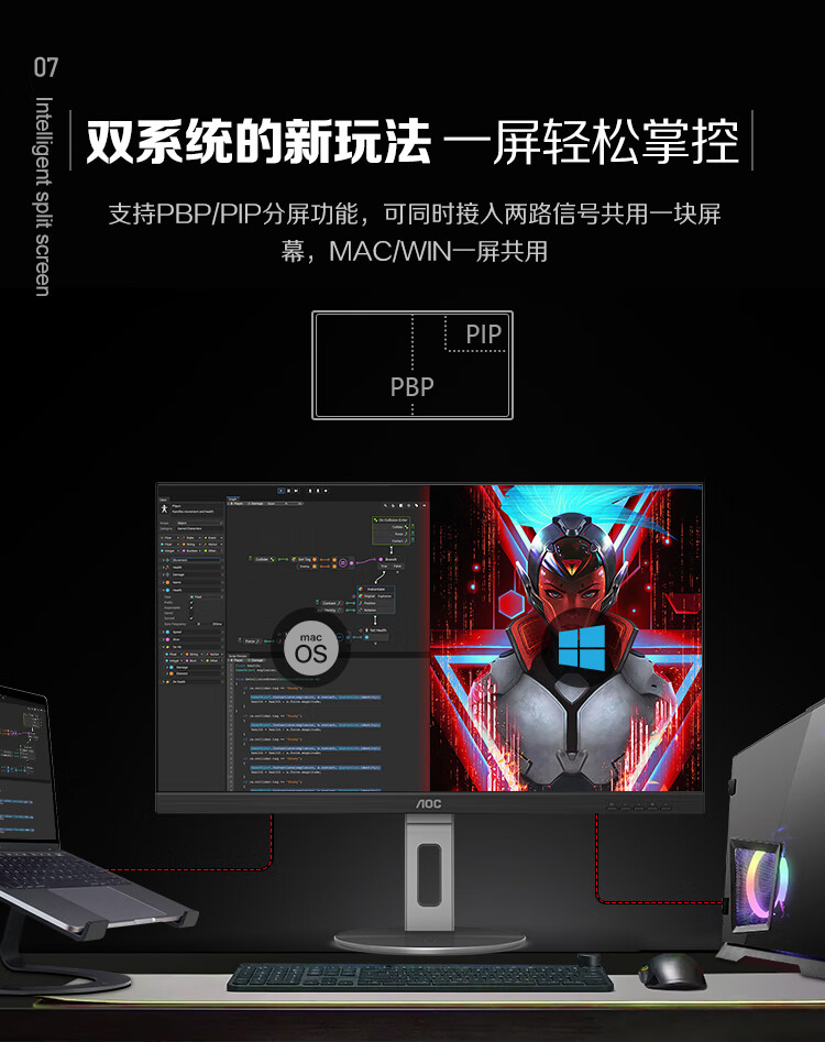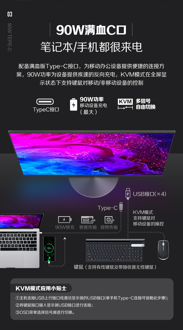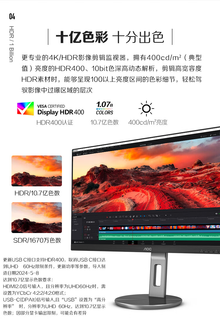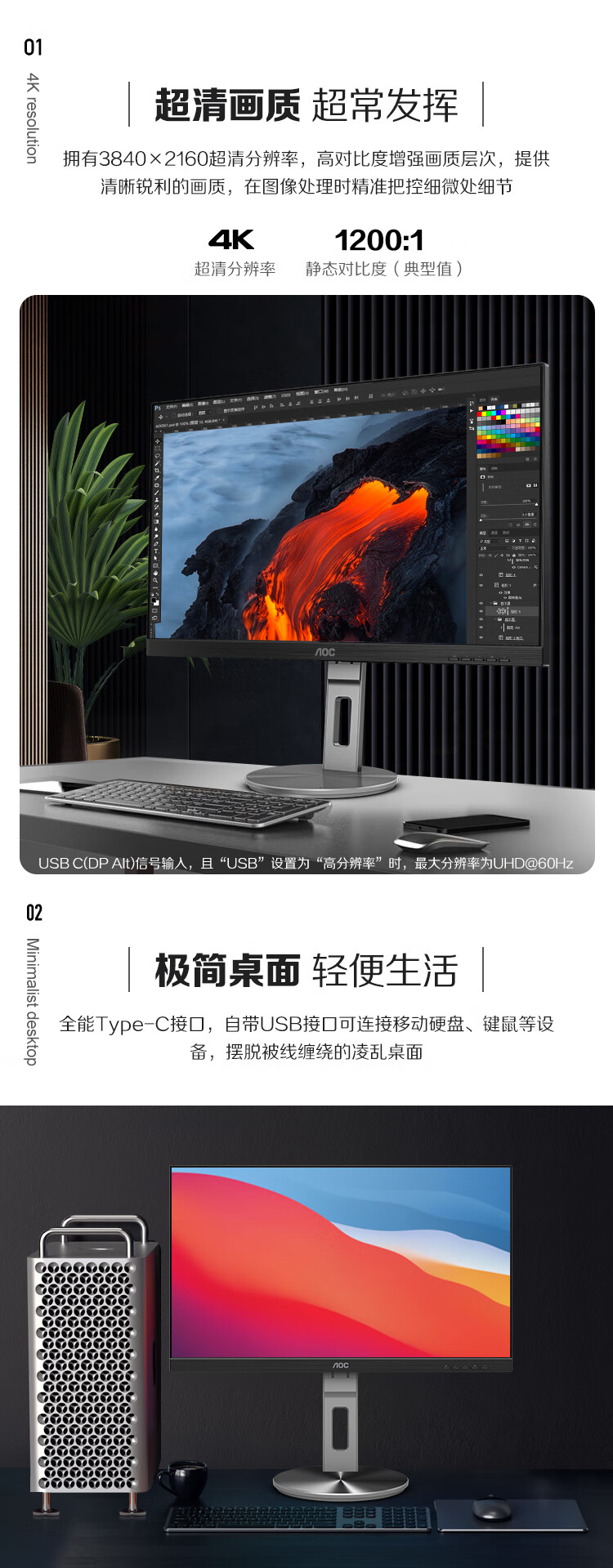 AOC 27英寸 4K IPS广色域 HDR400 Type-C90W 旋转升降 内置音箱 节能认证 办公电脑显示器 U27N3R