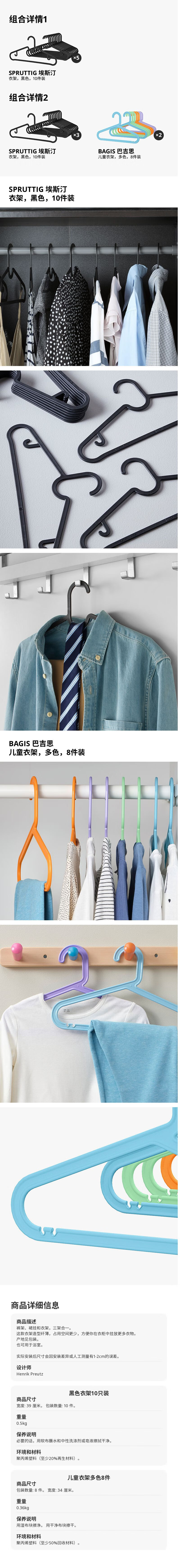 宜家(IKEA)【热销套组】SPRUTTIG埃斯汀衣架晾衣架挂衣架收纳衣撑组合 黑色衣架10只装*3+儿童衣架多色8件*2
