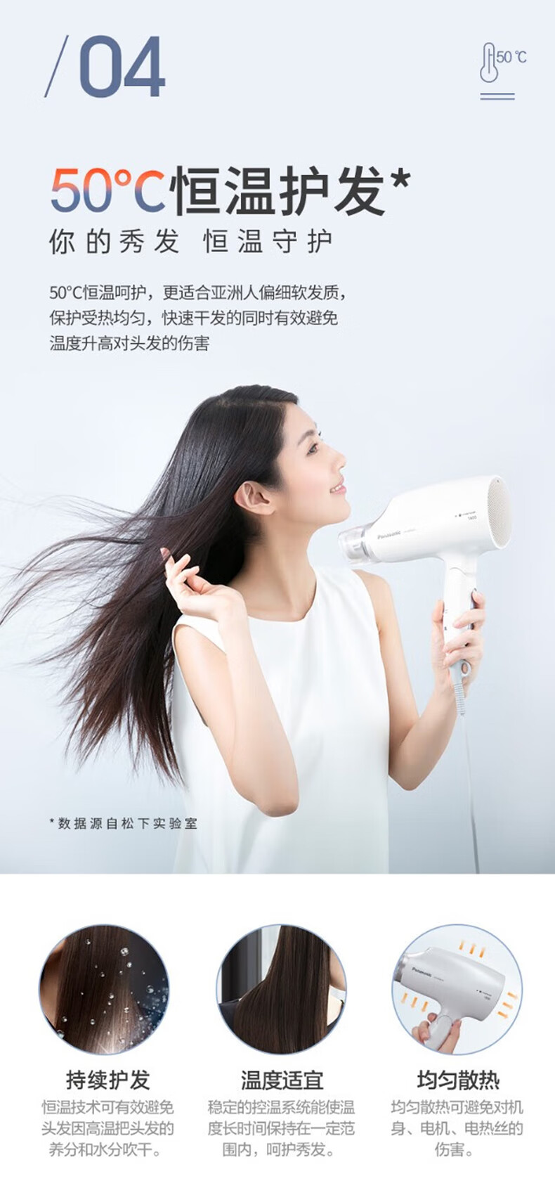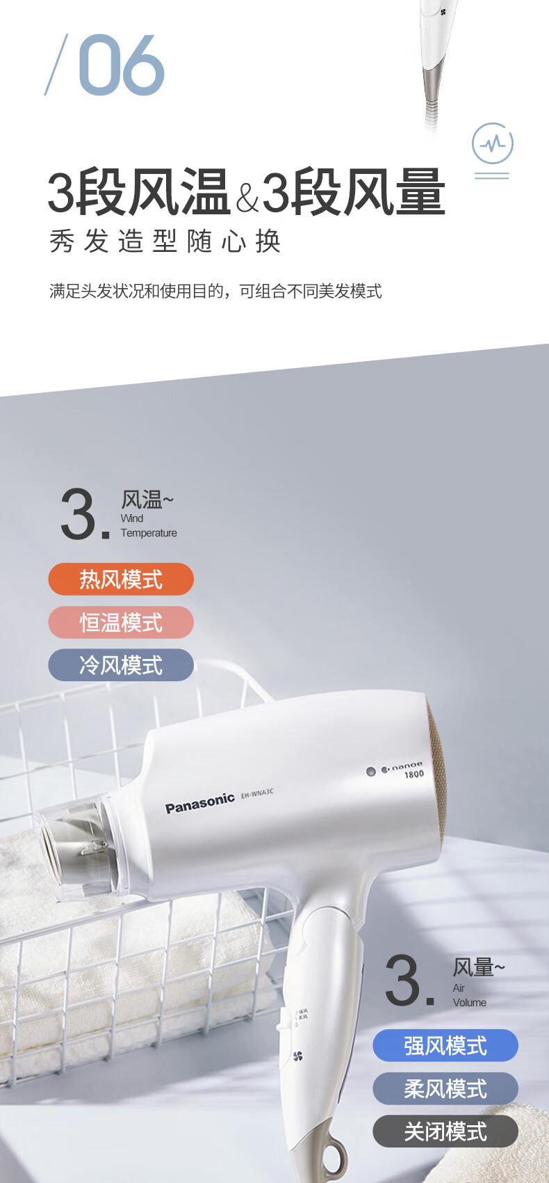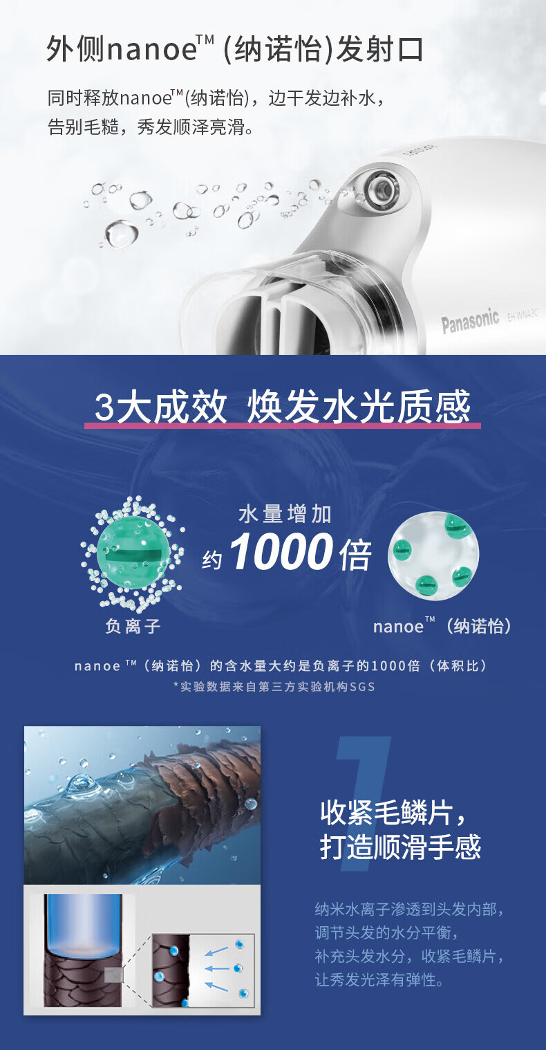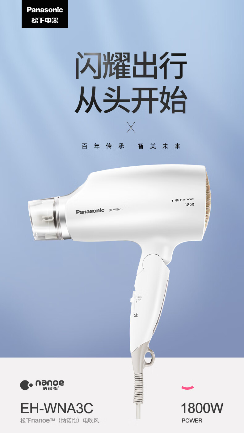 松下(Panasonic)【国家补贴】家用电吹风机可折叠高速吹风筒便携款纳诺怡负离子护发大功率速干学生宿舍送女生礼物 雪顶白【纳诺怡水润呵护】礼盒装WNA3C