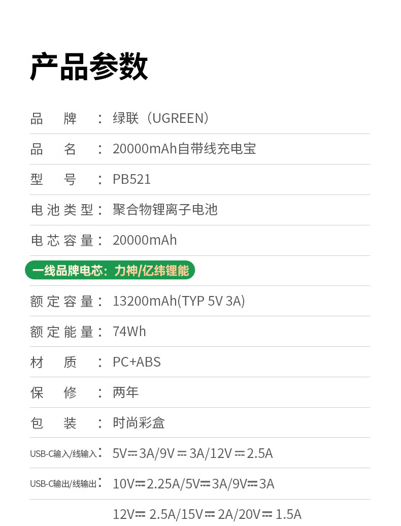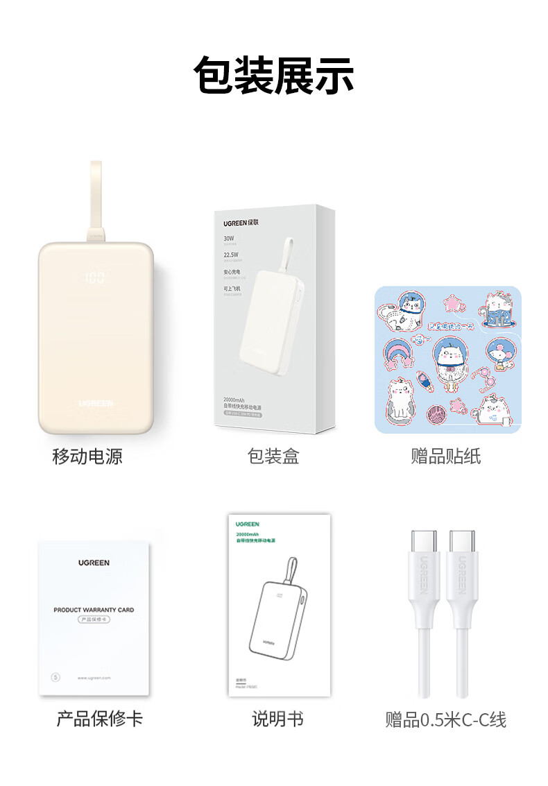 绿联【3C认证可上飞机】iPhone17充电宝自带线20000毫安30W快充 大容量小巧移动电源 适用苹果小米华为