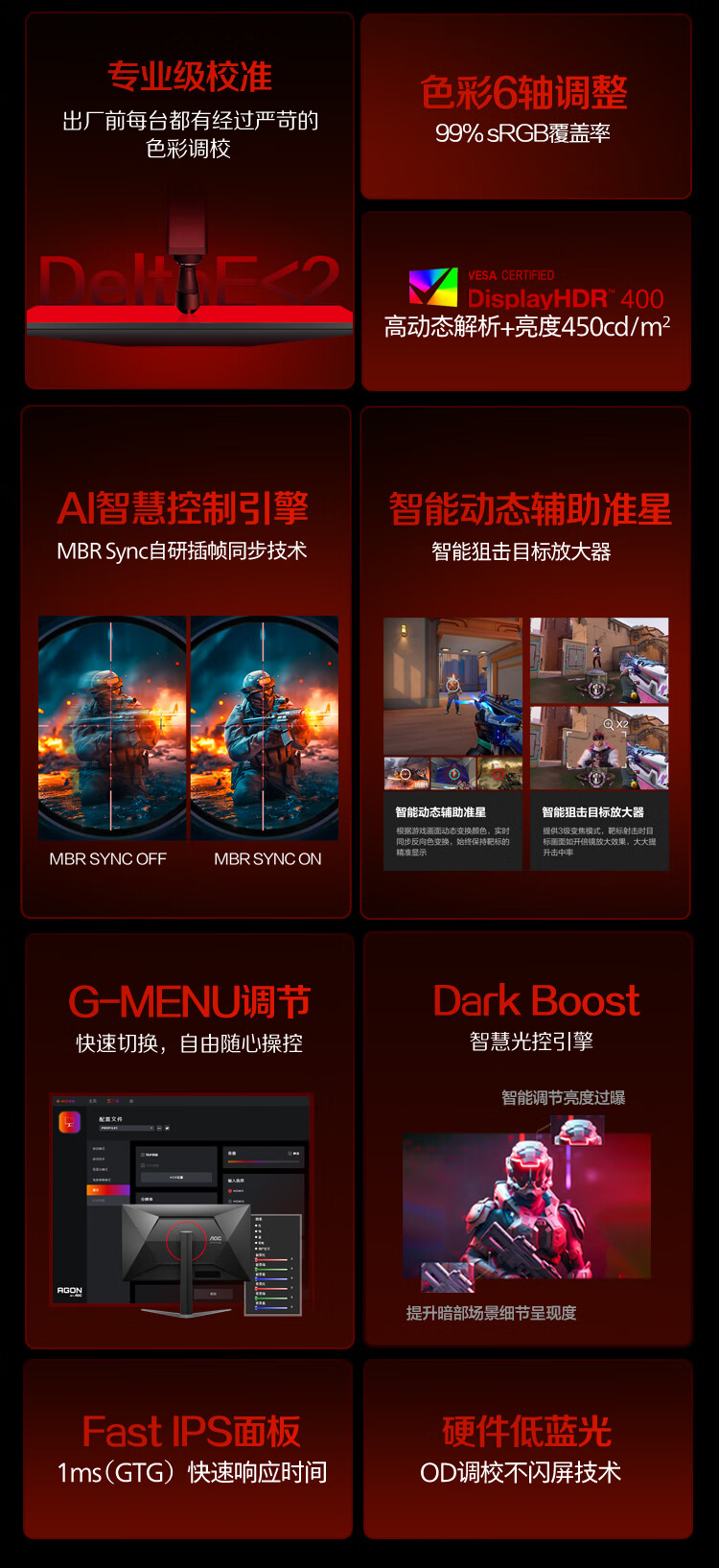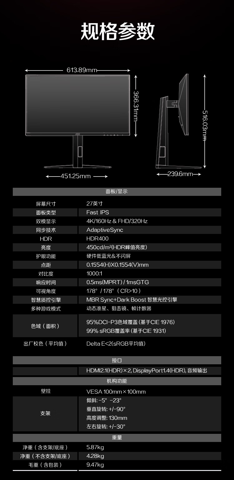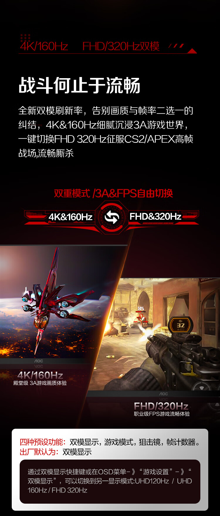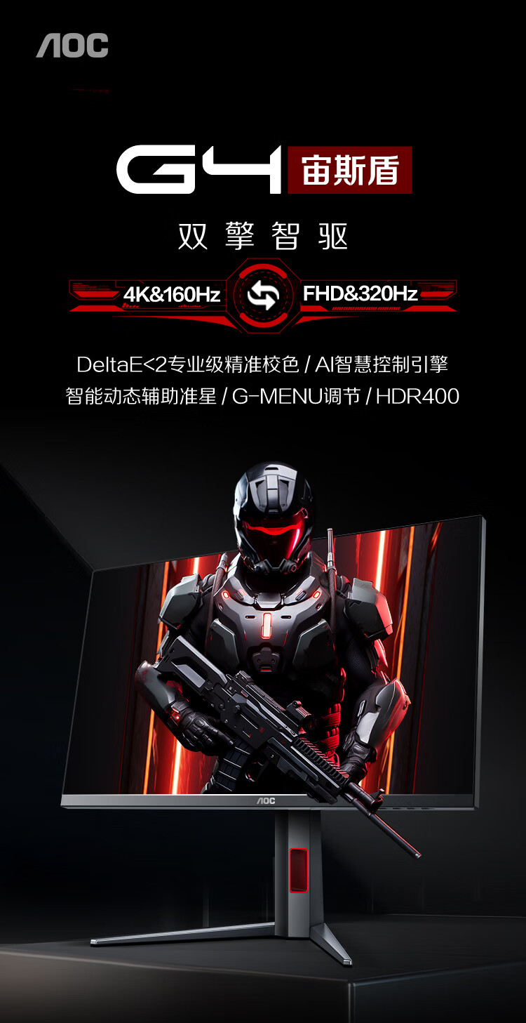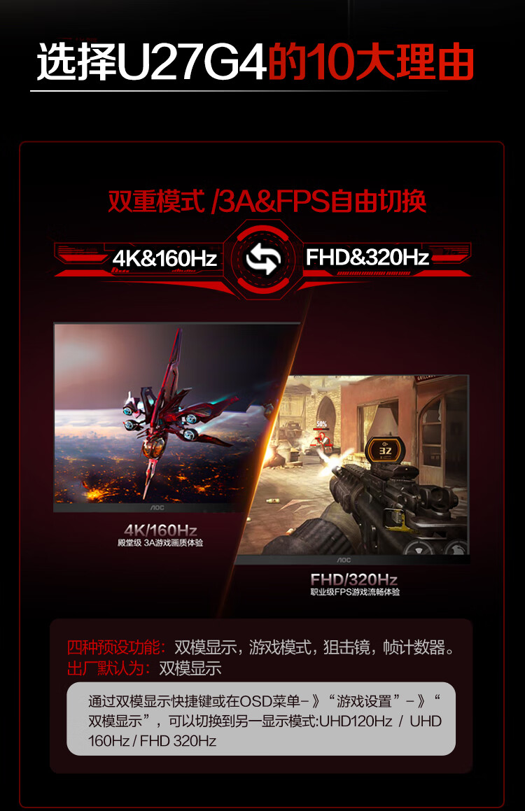 AOC 27英寸4K 160Hz双模320Hz HDR400 10bit 1ms 硬件低蓝光 电竞电脑显示器 宙斯盾U27G4 (高性能版)