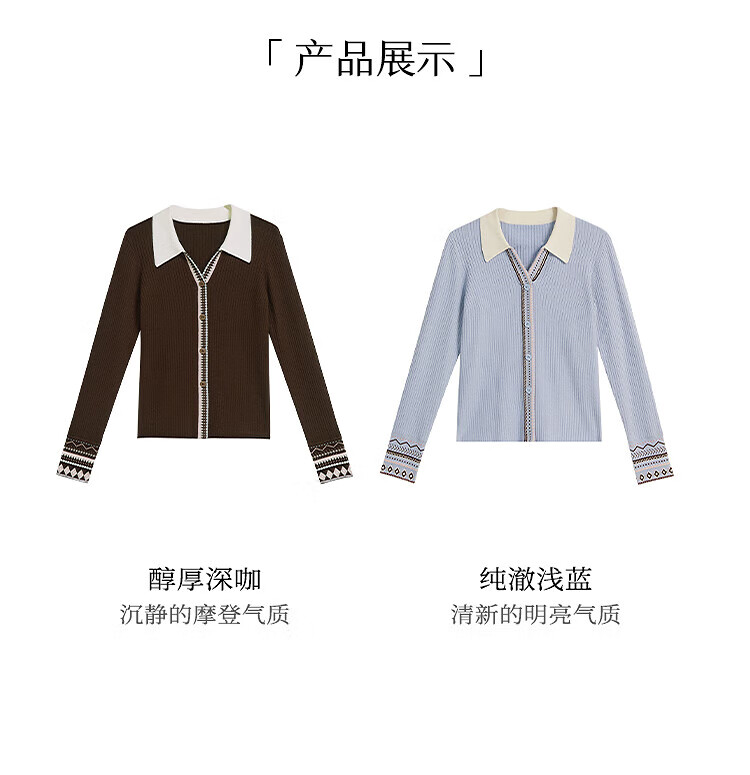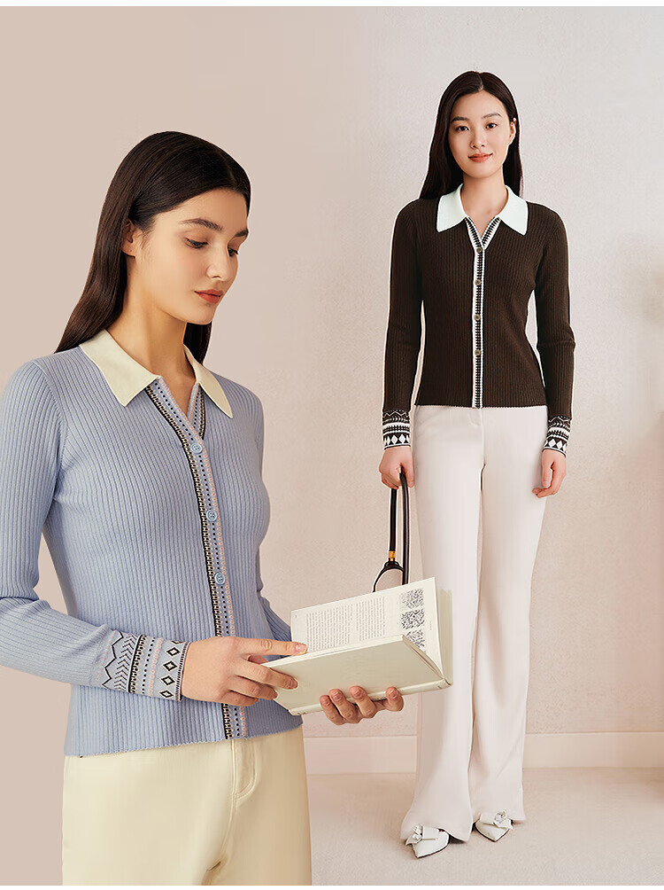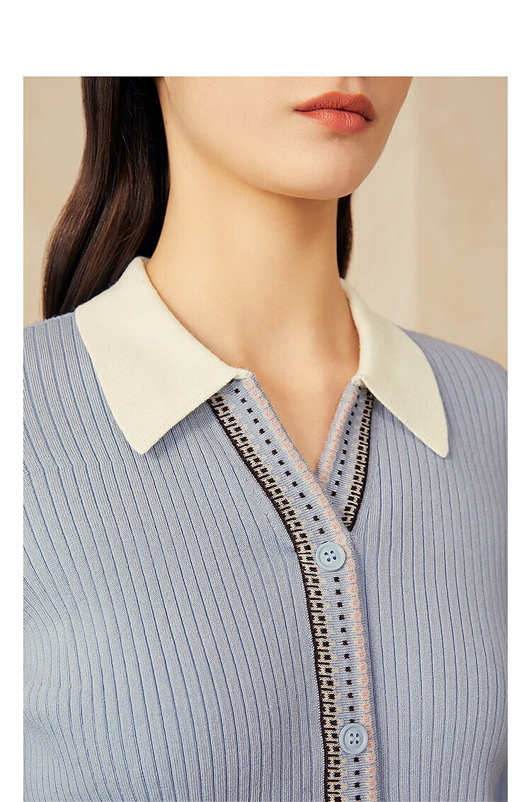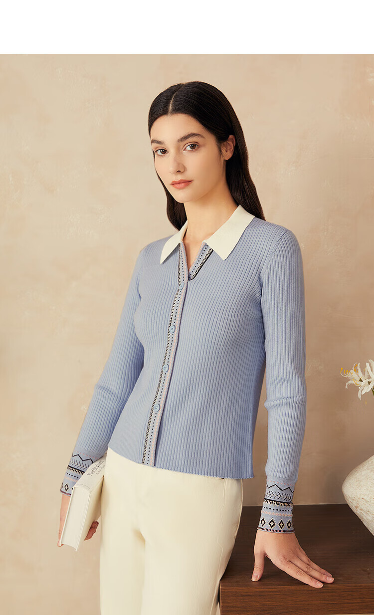 YINER音儿专选2025年春季【费尔岛纹】撞色POLO领真丝羊毛针织衫 浅蓝 XL 42