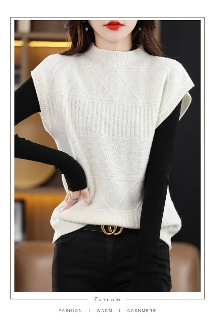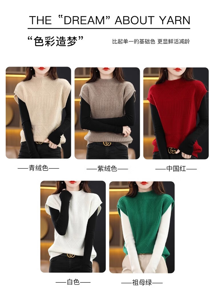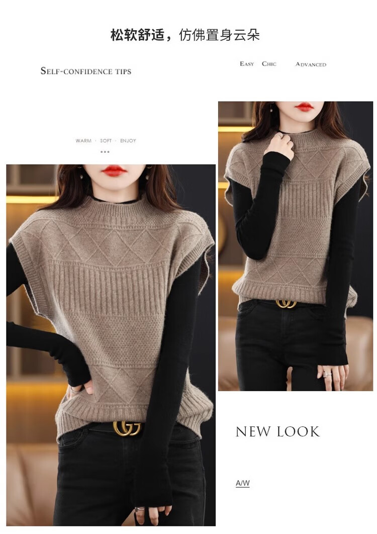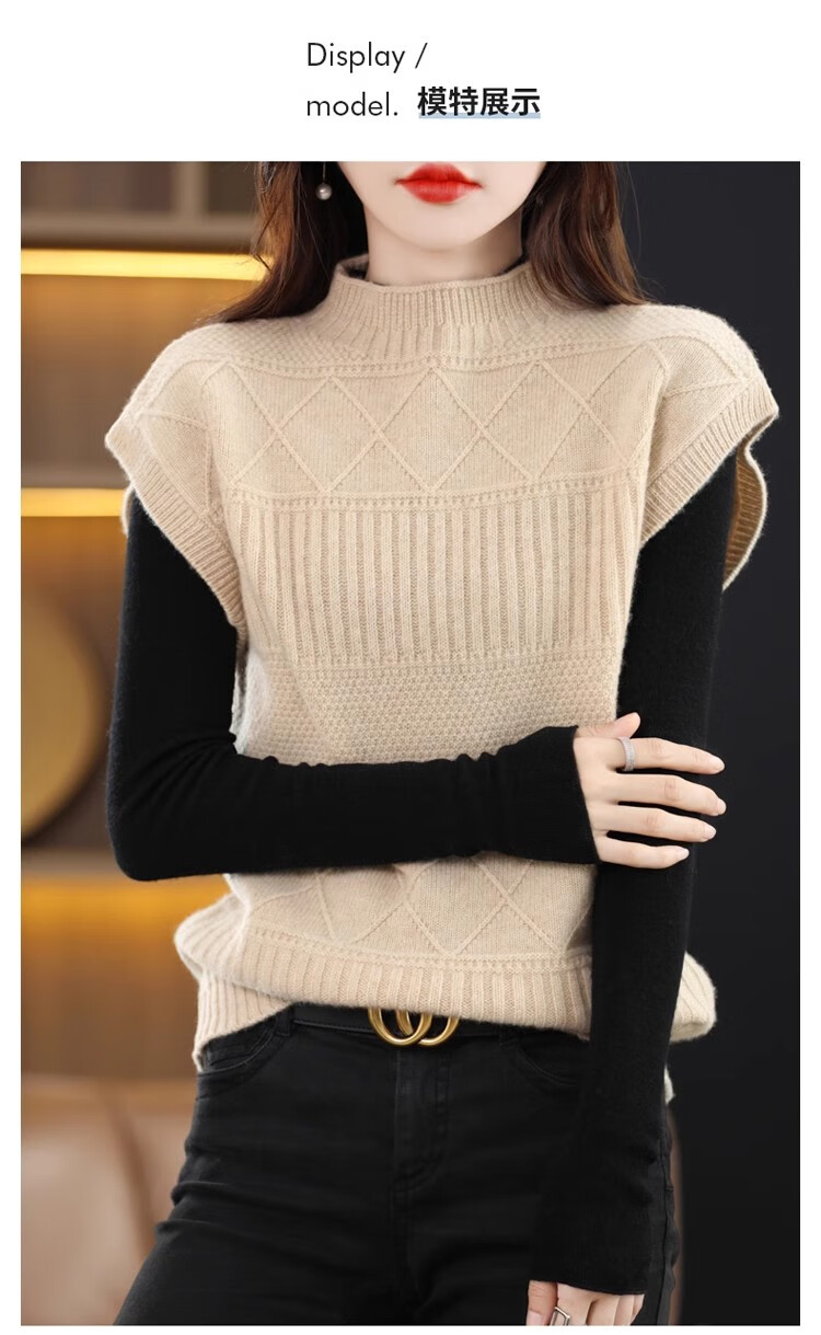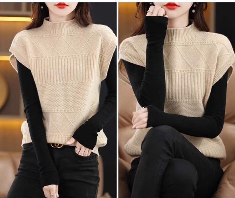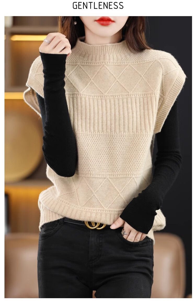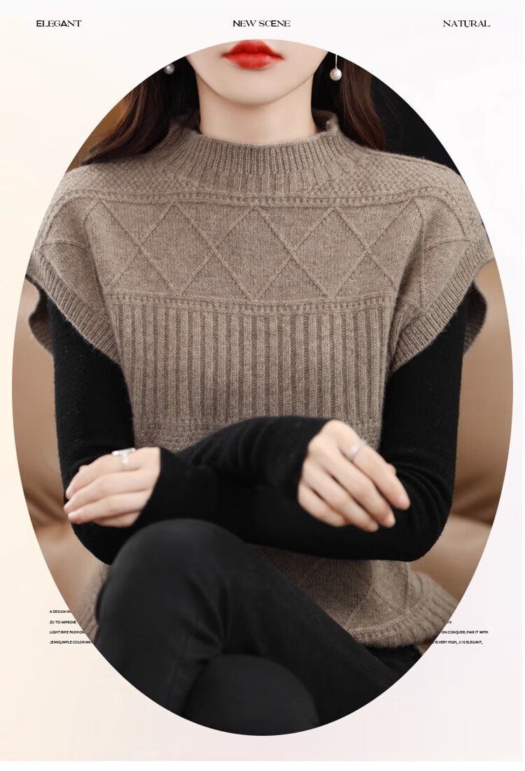 香影芬100%羊毛衫女马甲坎肩秋冬新款毛衣女半高领落肩毛衣针织衫马夹女 驼色 4XL (建议150-165斤)