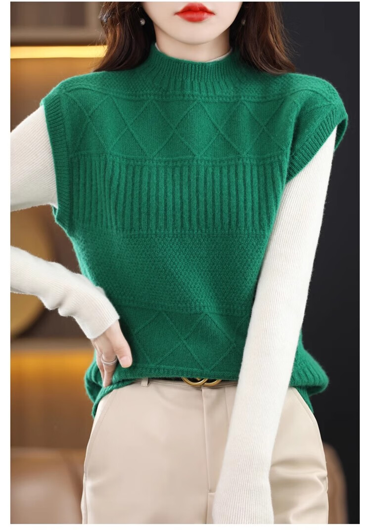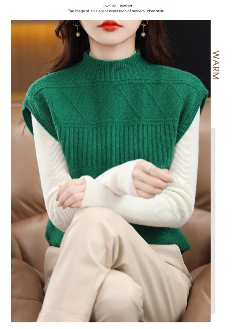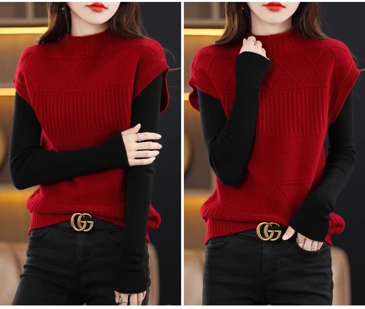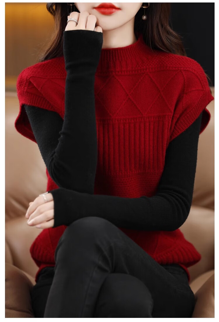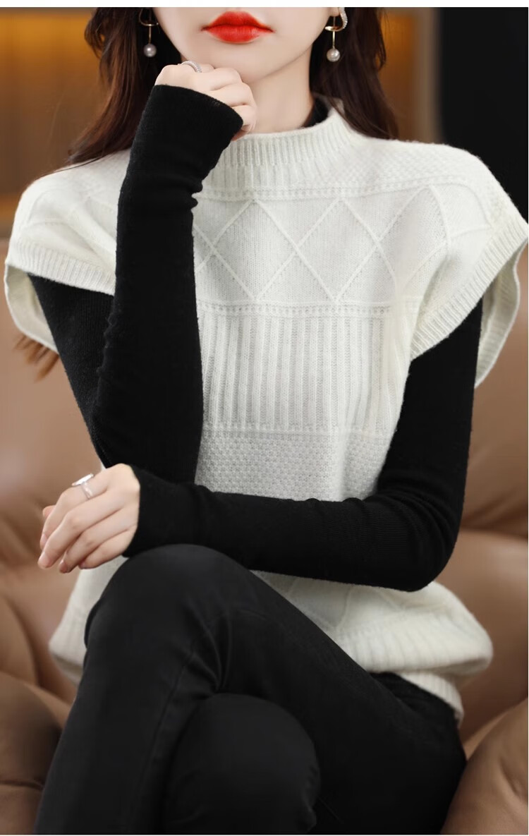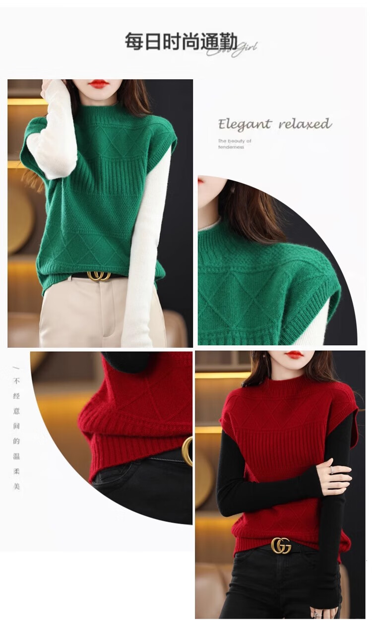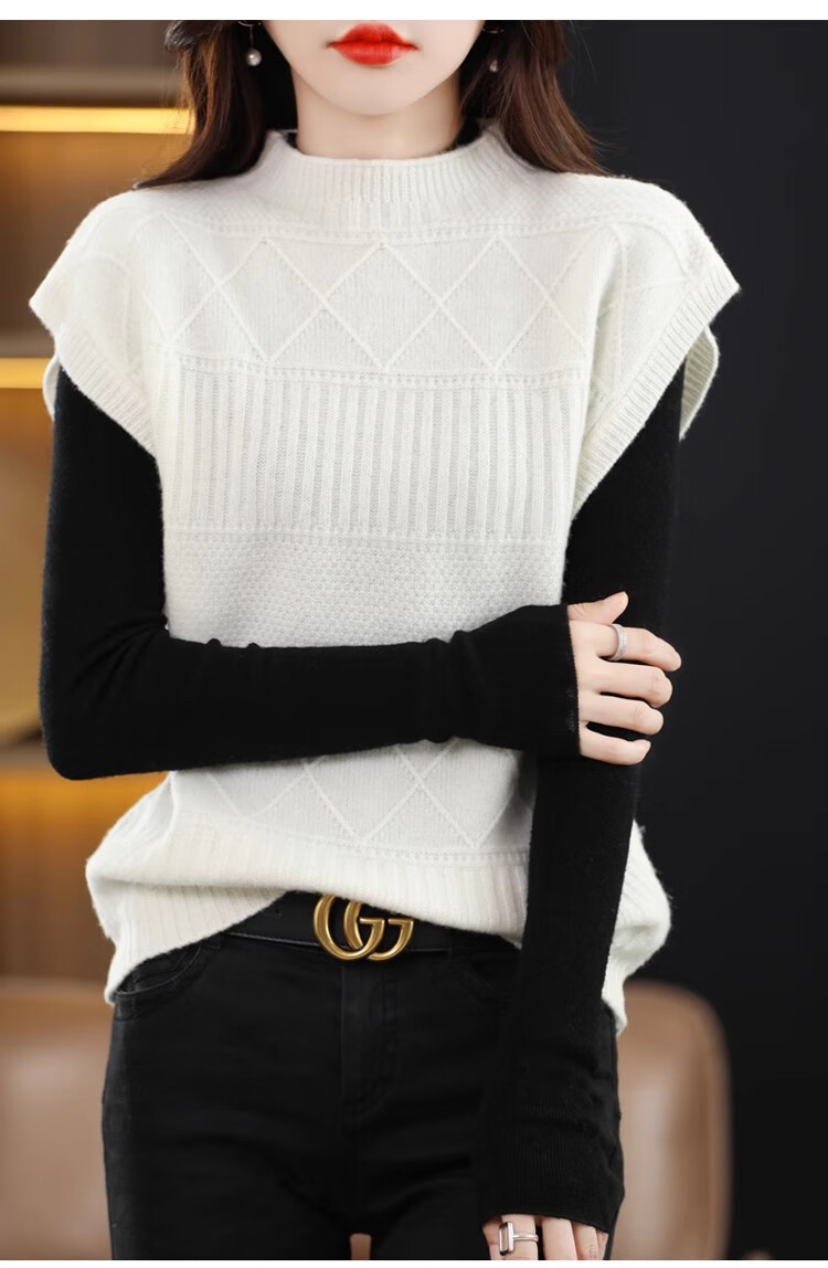 香影芬100%羊毛衫女马甲坎肩秋冬新款毛衣女半高领落肩毛衣针织衫马夹女 驼色 4XL (建议150-165斤)