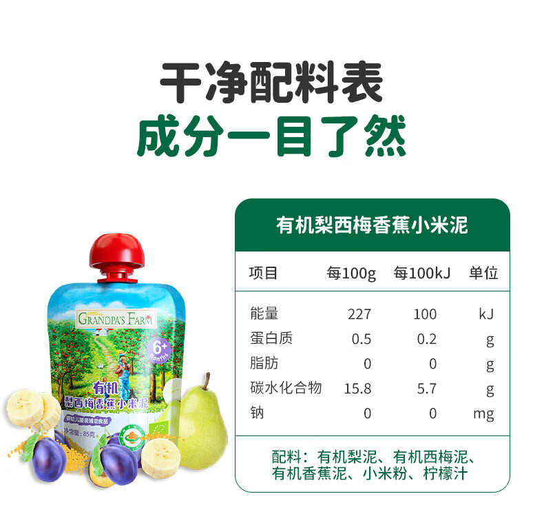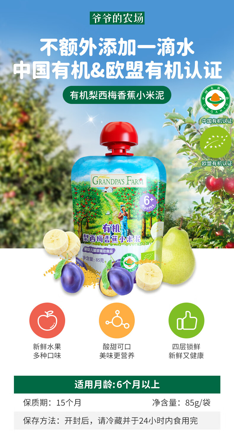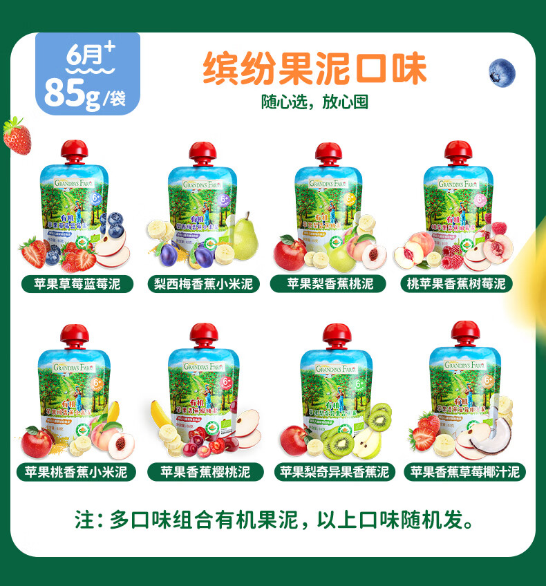 爷爷的农场进口婴幼儿果泥 宝宝辅食水果泥营养吸吸袋儿童果泥 进口水果果泥 90g*8袋 组合装