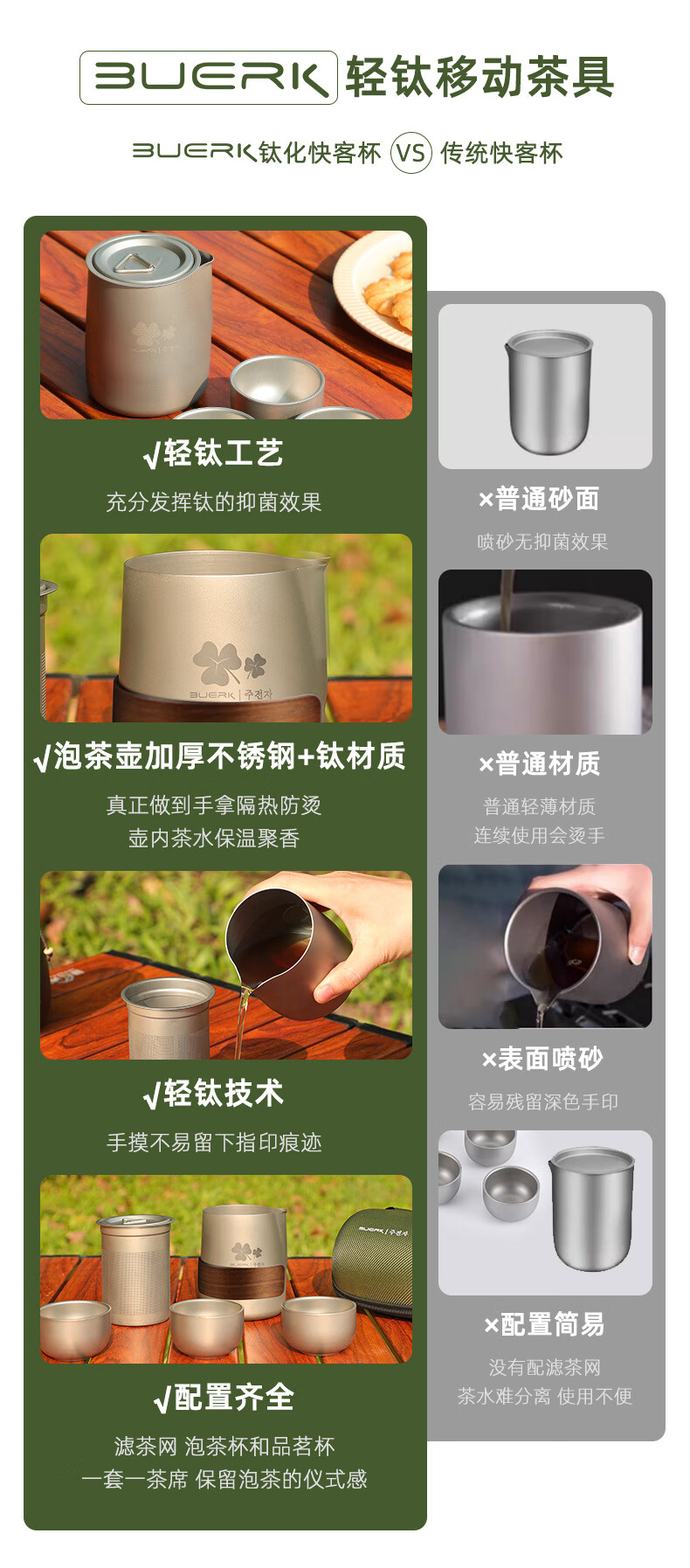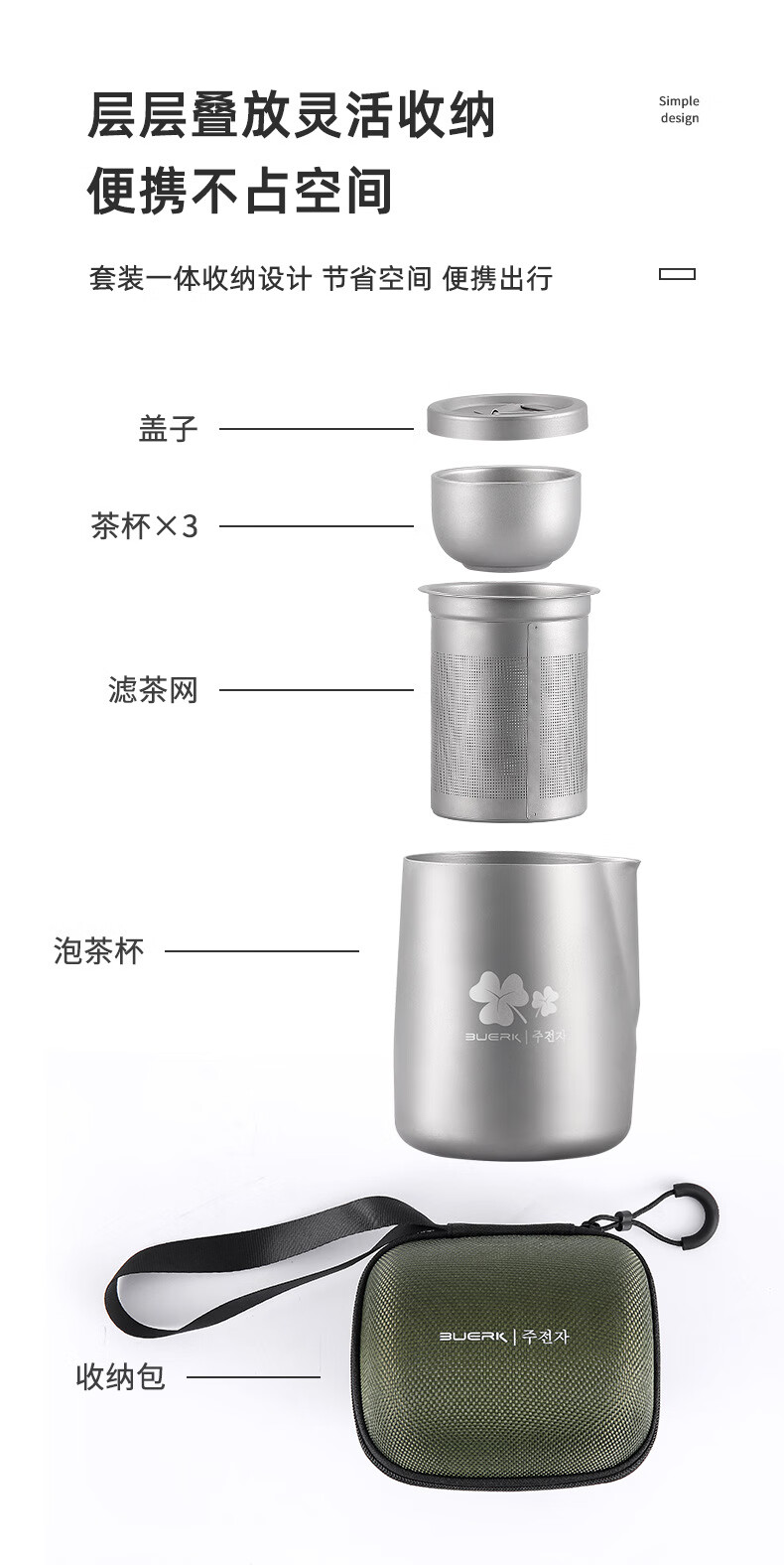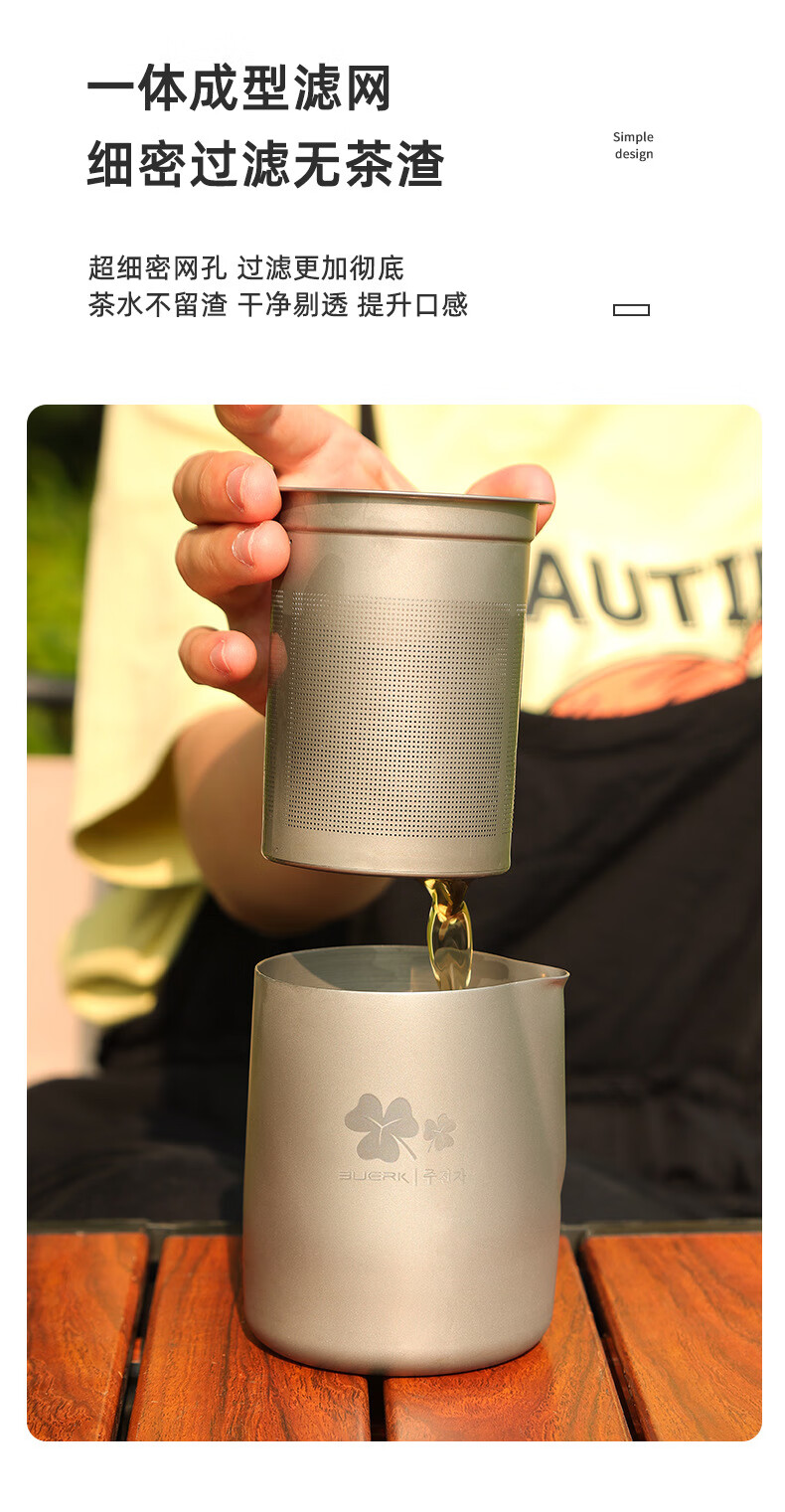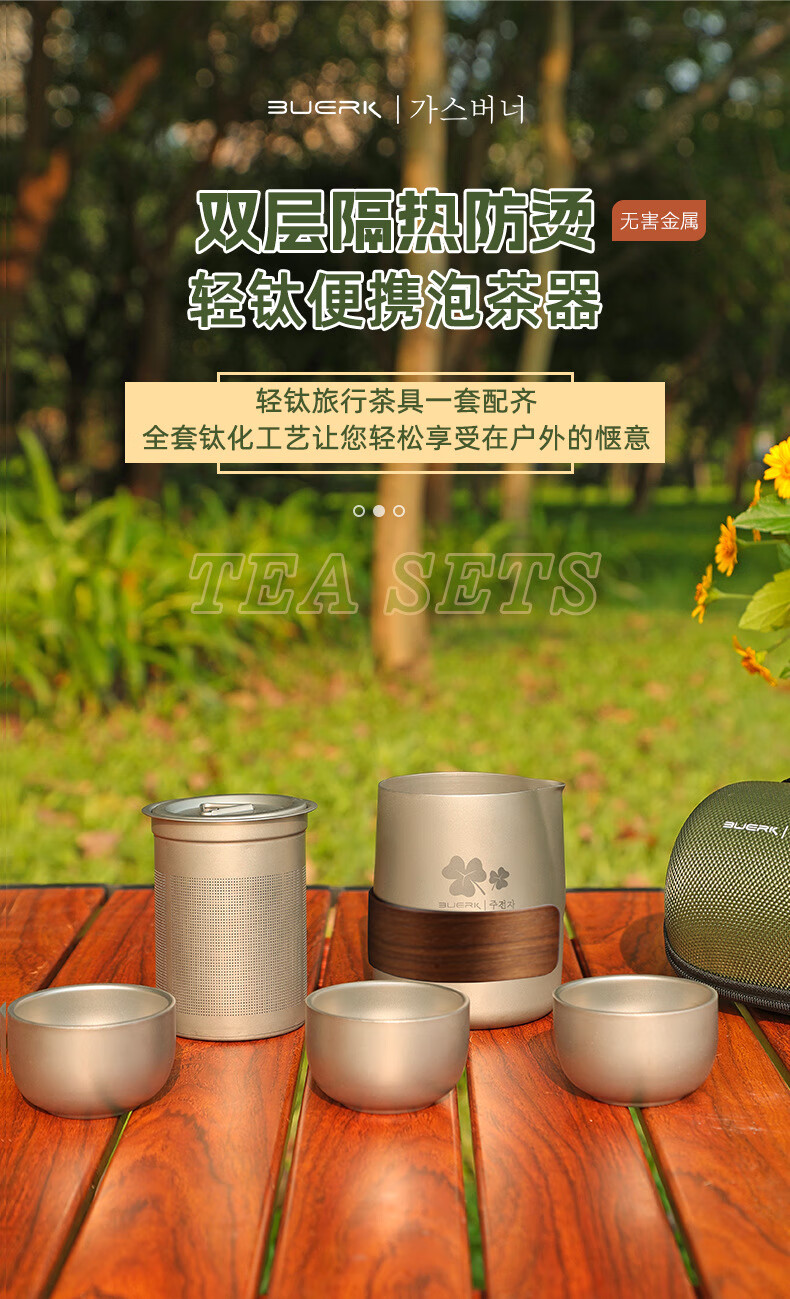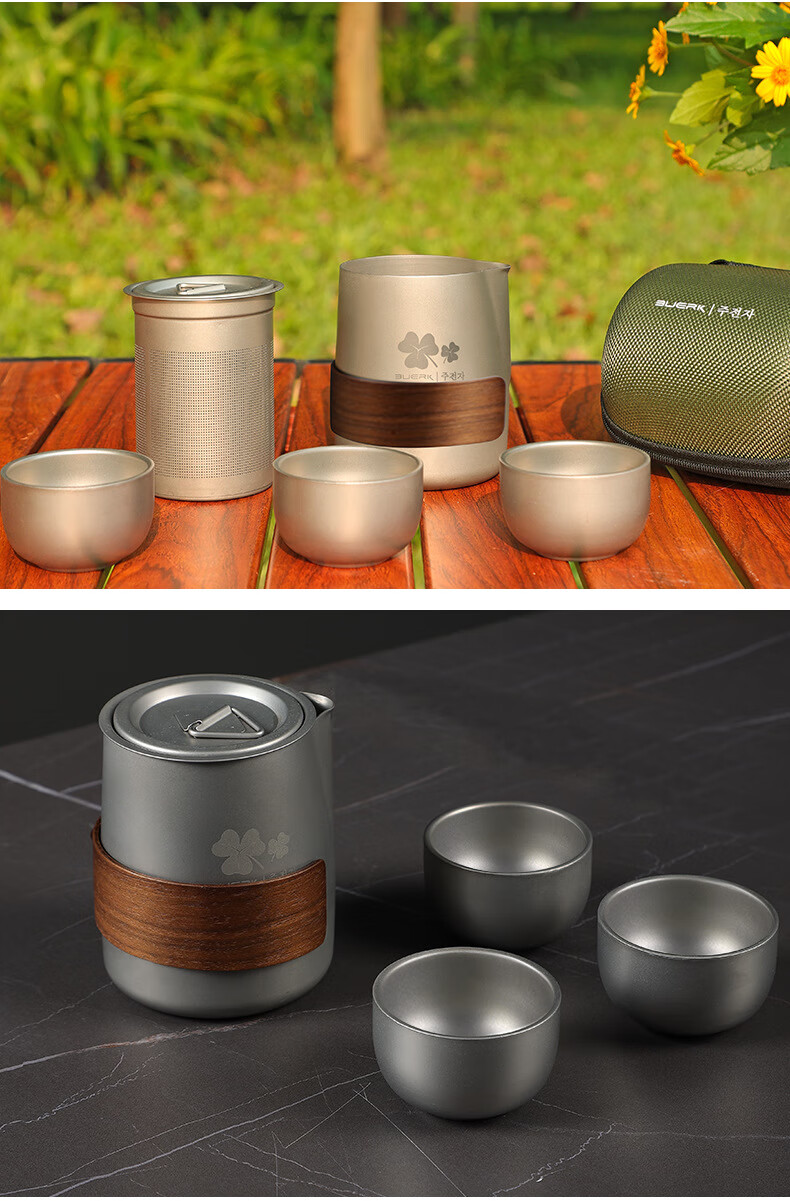 布比克轻钛钛合金便携式旅行茶具套装茶壶双层茶杯户外露营泡茶装备 钛化茶具【1壶(带茶滤)3杯】